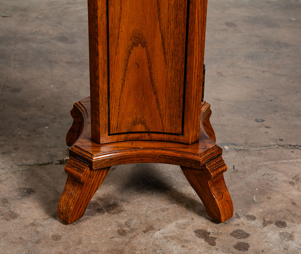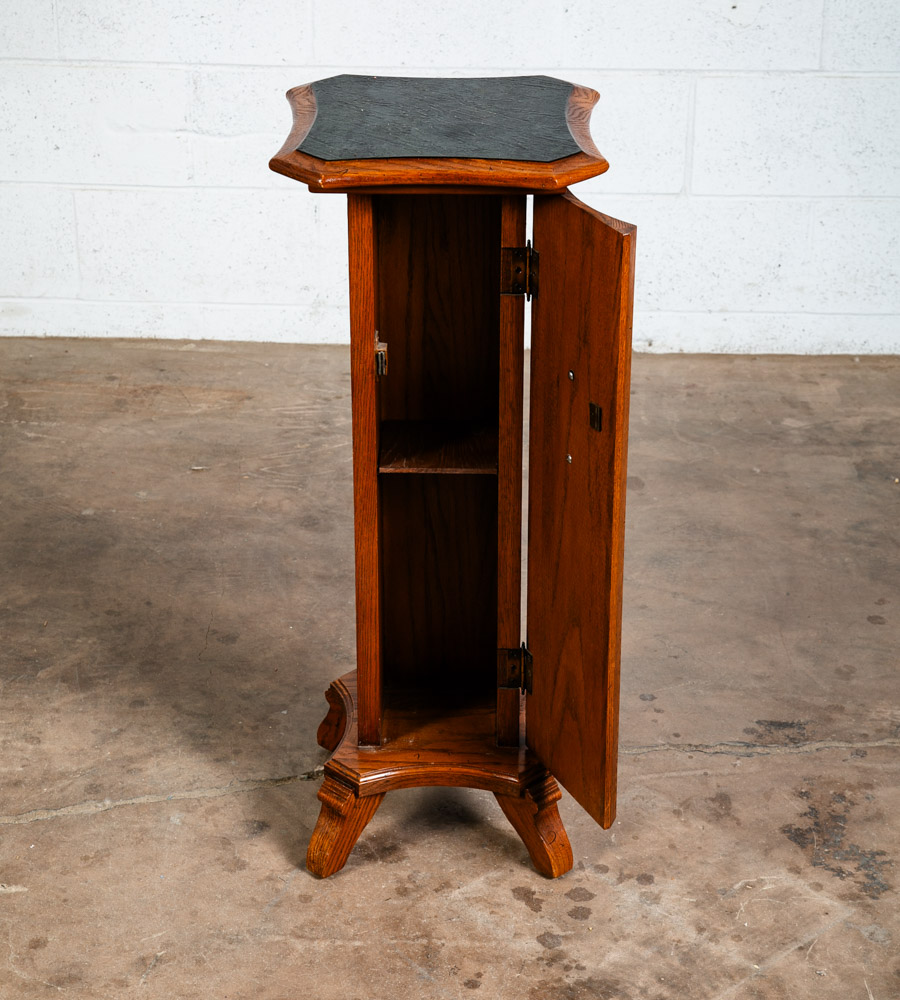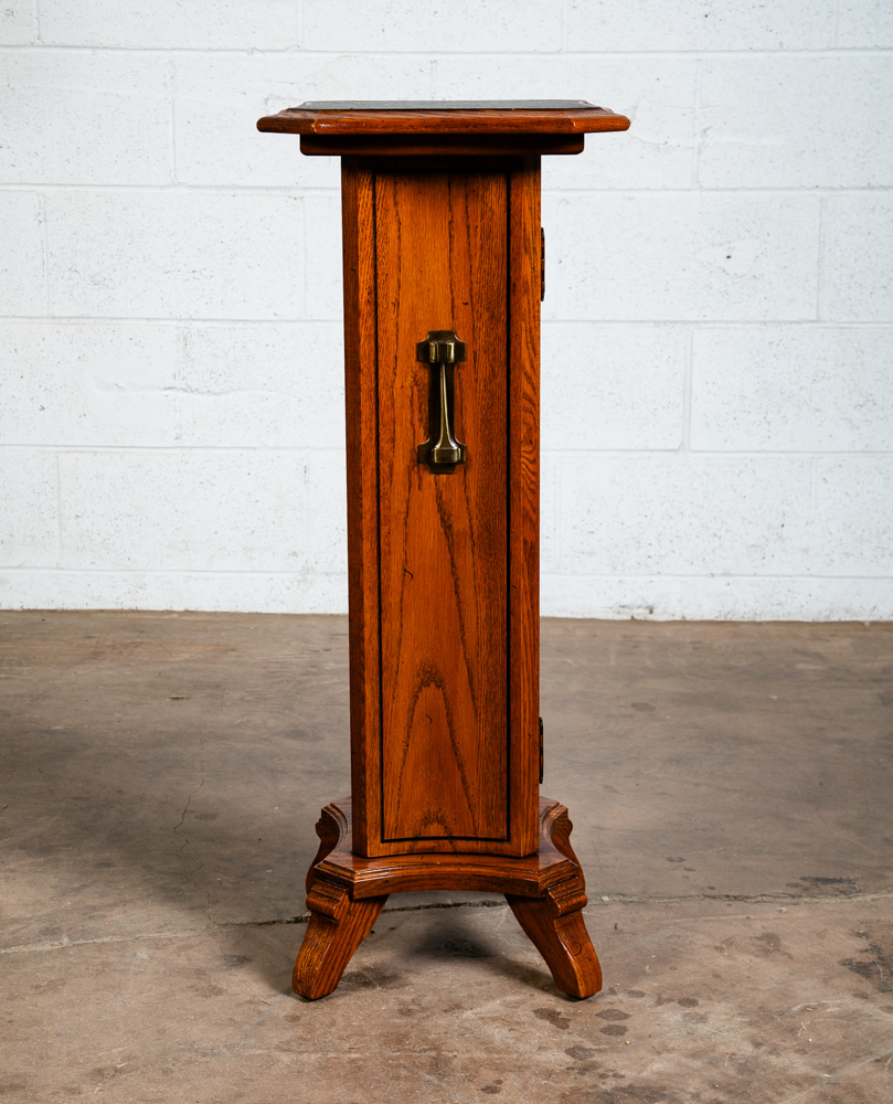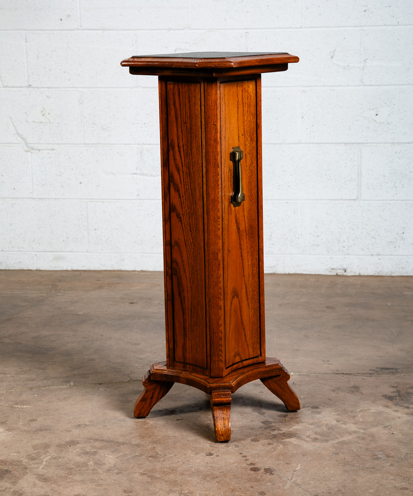Solid oak Torchere' plant table / smoking table for your living space or office. Can be used as a side table or to display art pieces / sculptures. Comes with 1 door on the front w/ adjustable shelf inside. Well made. sits on 4 oak legs. Great shape. unknown age. Please see all photos to ensure you know what you are buying. We include FREE SHIPPING in the listing price. Some exceptions apply, so please read the full shipping details below.