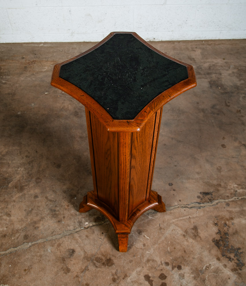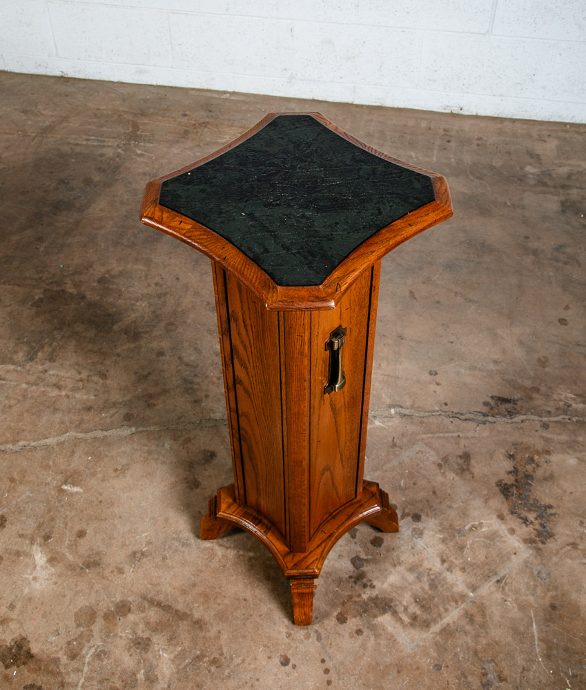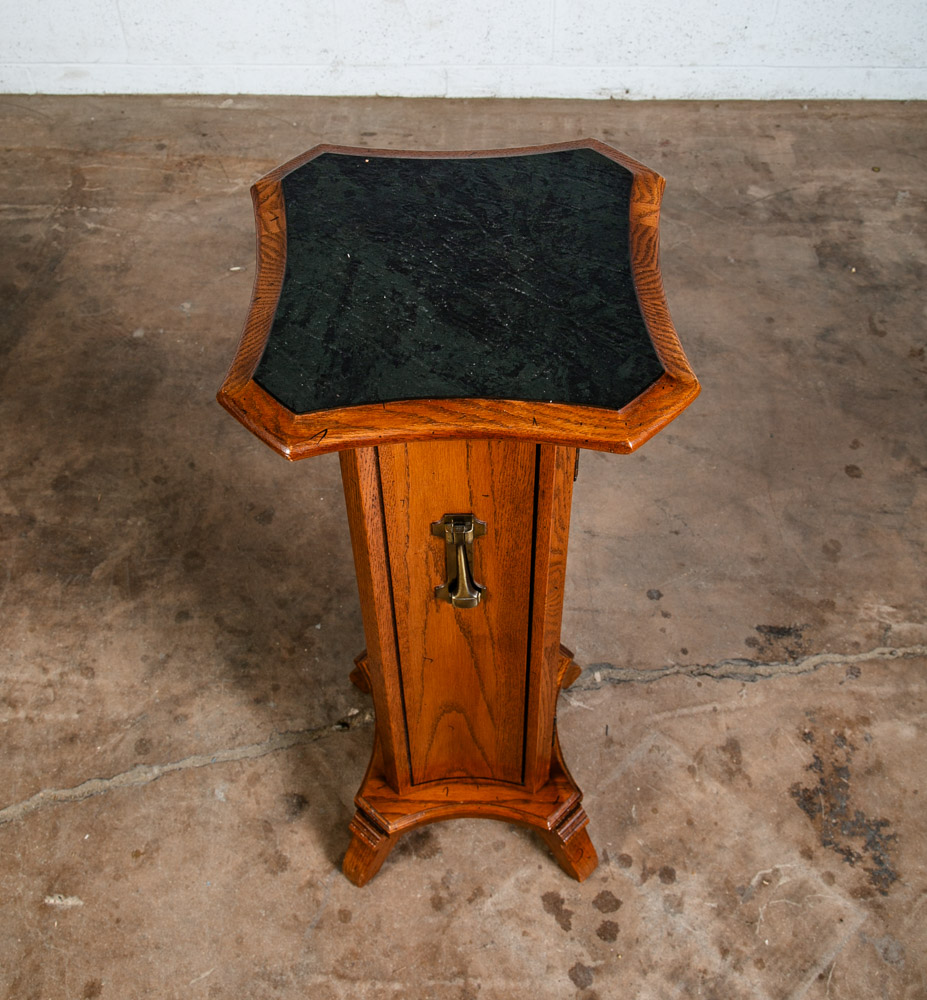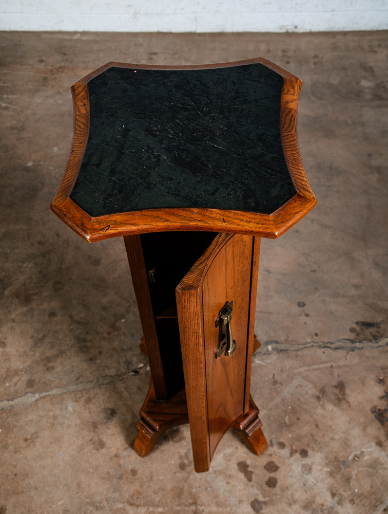 Solid oak Torchere' plant table / smoking table for your living space or office. Can be used as a side table or to display art pieces / sculptures. Comes with 1 door on the front w/ adjustable shelf inside. Well made. sits on 4 oak legs. Great shape. unknown age. Please see all photos to ensure you know what you are buying. We include FREE SHIPPING in the listing price. Some exceptions apply, so please read the full shipping details below.