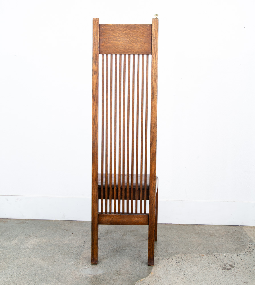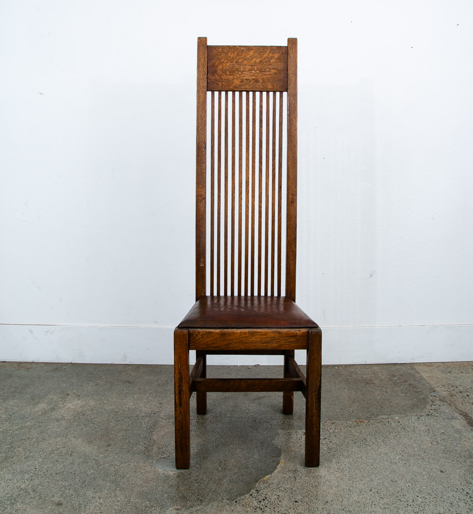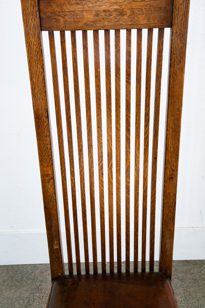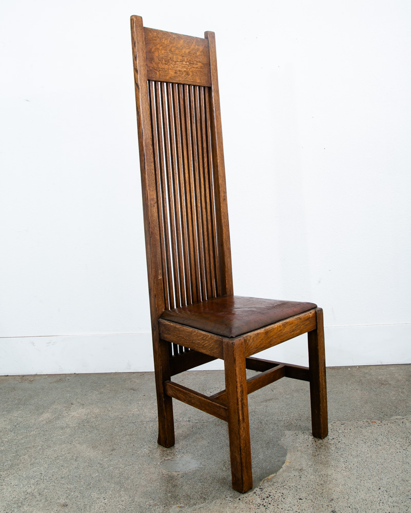 Frank Lloyd Wright Style early 1900s highback side chair made in solid oak and stained in a dark brown color. Unsigned example. one professional repair on one side of the chair. Please see all photos to ensure you know what you are buying. We include FREE SHIPPING in the listing price. Some exceptions apply, so please read the full shipping details below.