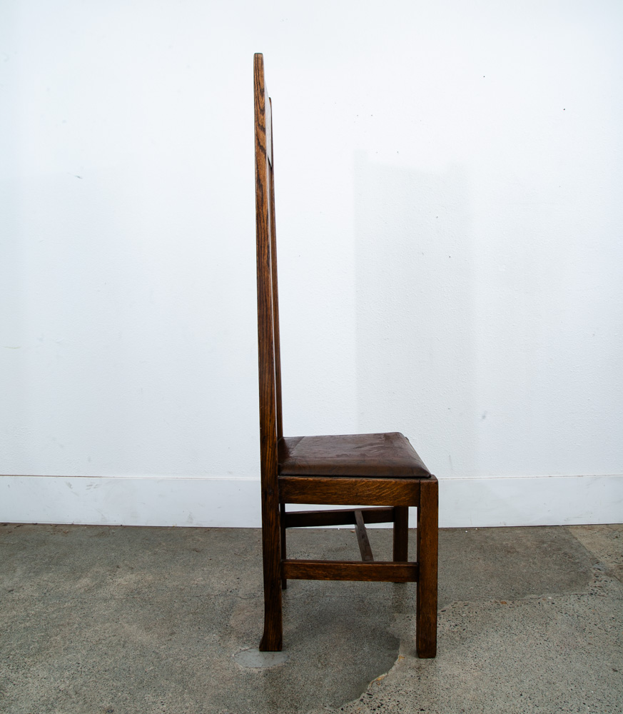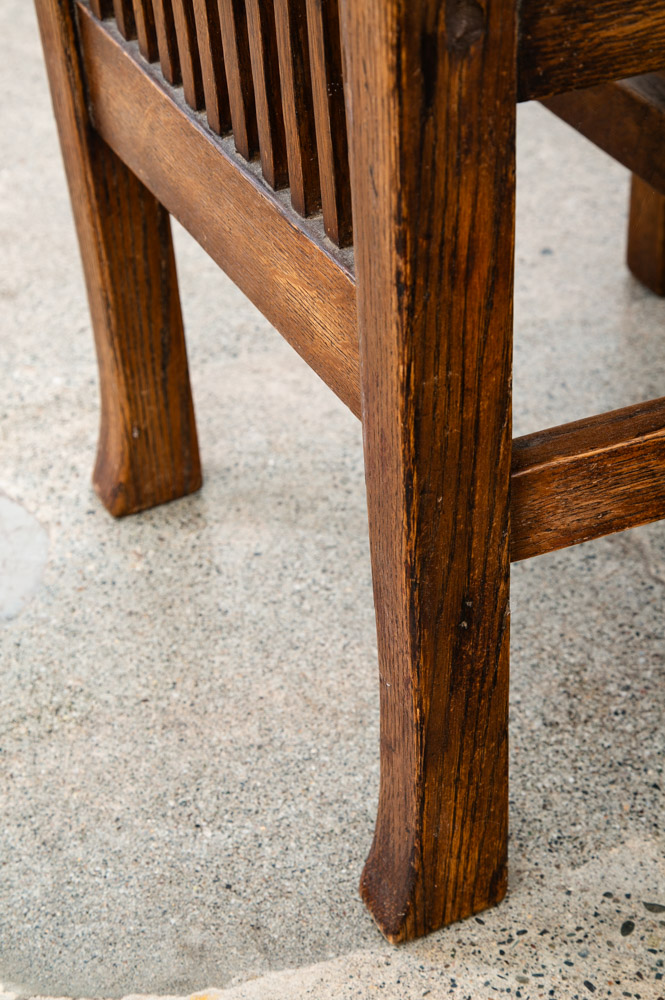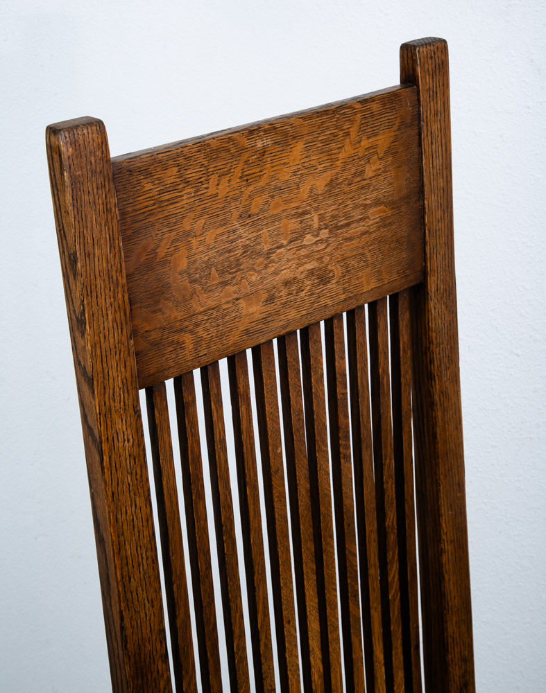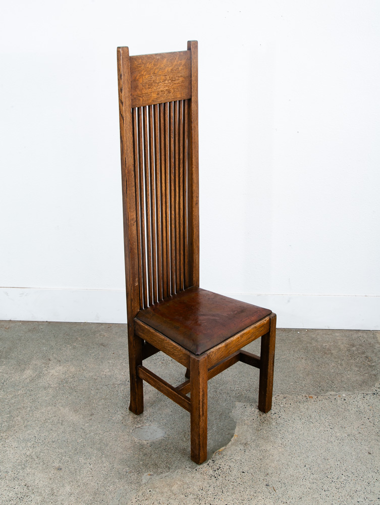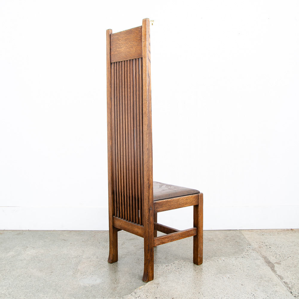 Frank Lloyd Wright Style early 1900s highback side chair made in solid oak and stained in a dark brown color. Unsigned example. one professional repair on one side of the chair. Please see all photos to ensure you know what you are buying. We include FREE SHIPPING in the listing price. Some exceptions apply, so please read the full shipping details below.