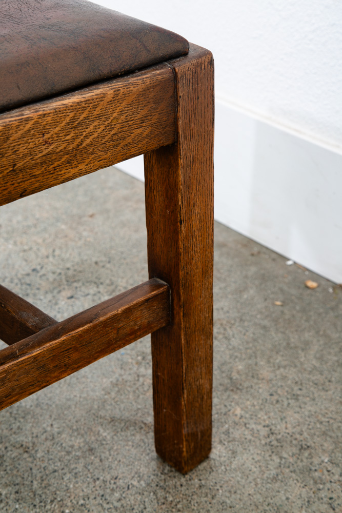 Condition report: good condition with some wear to upholstered seat. wood in good shape and sturdy. one repair to one side. Structurally solid. Unsigned example. 8/10 condition rating.