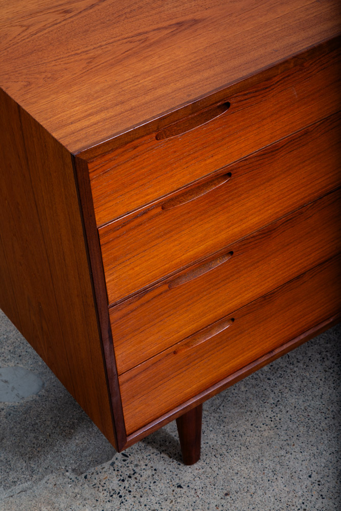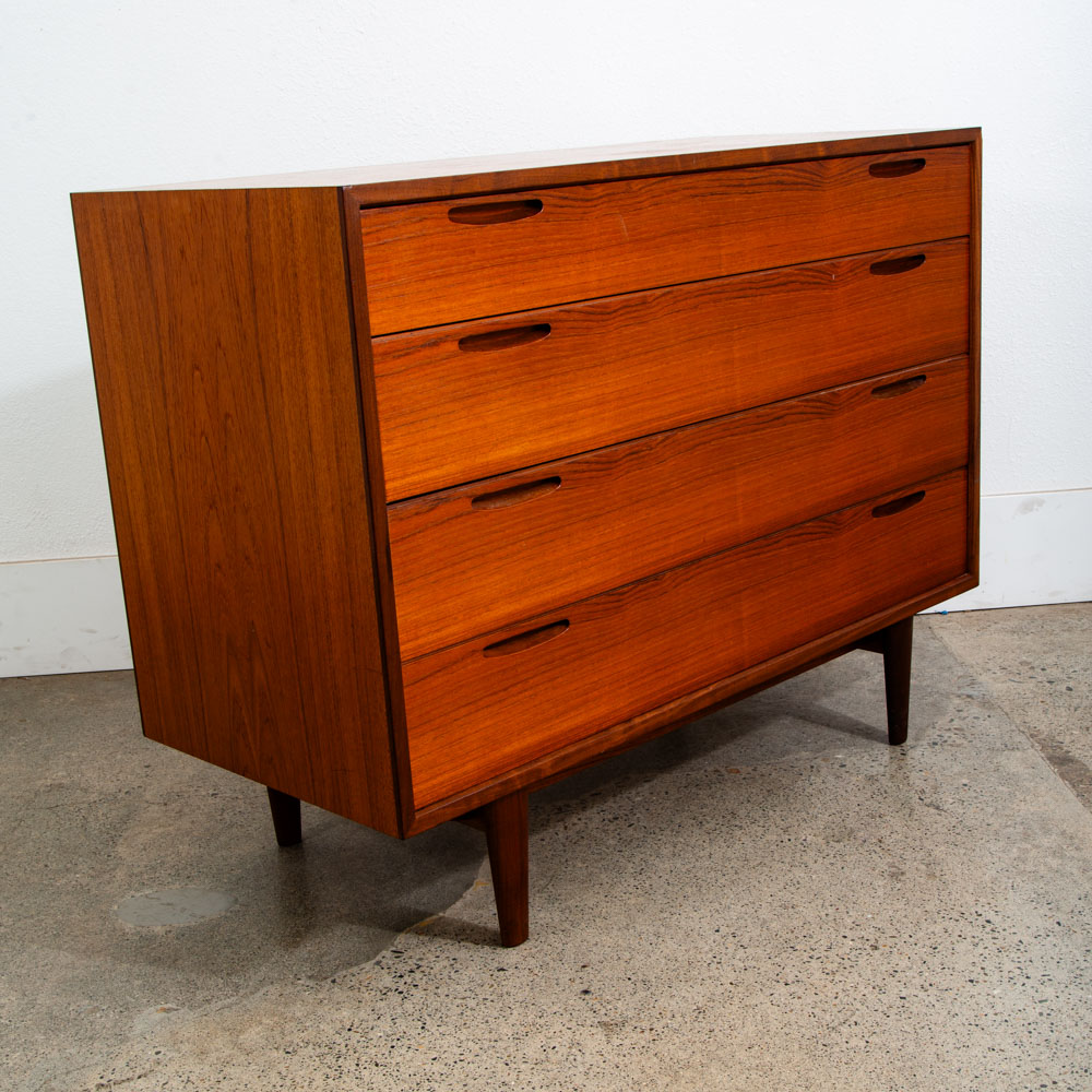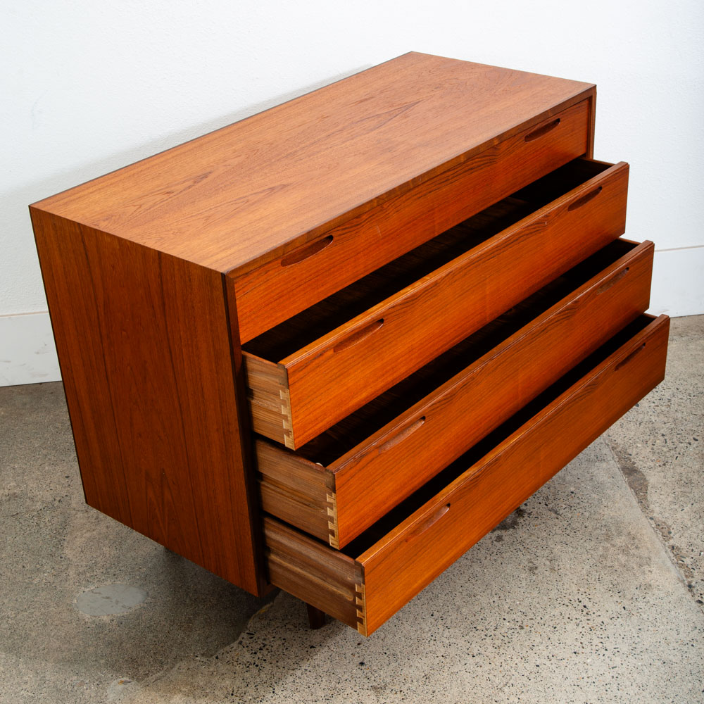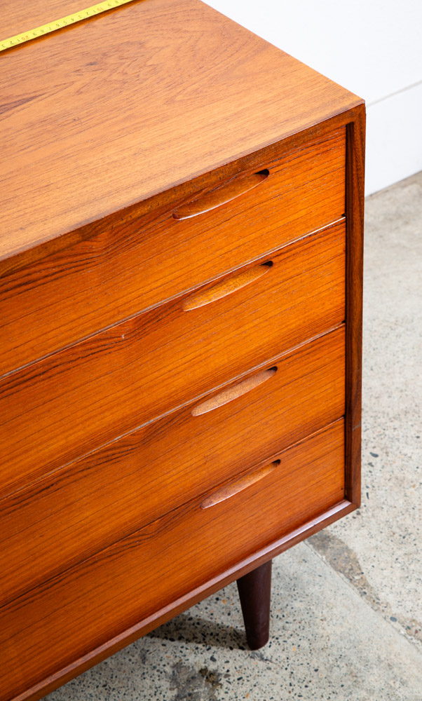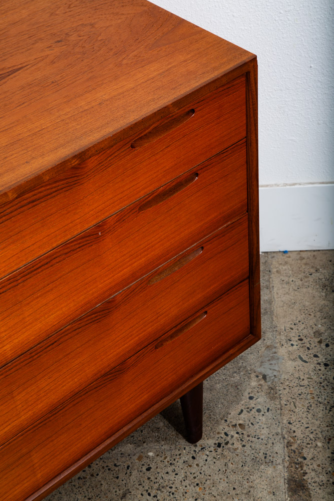 Ib Kofod Larsen 4 Drawer Teak Chest of drawers. Recessed handles give this piece a very sleek unique look. Very nice quality construction. Drawers work properly and smoothly. Please see all photos to ensure you know what you are buying. We include FREE SHIPPING in the listing price. Some exceptions apply, so please read the full shipping details below.