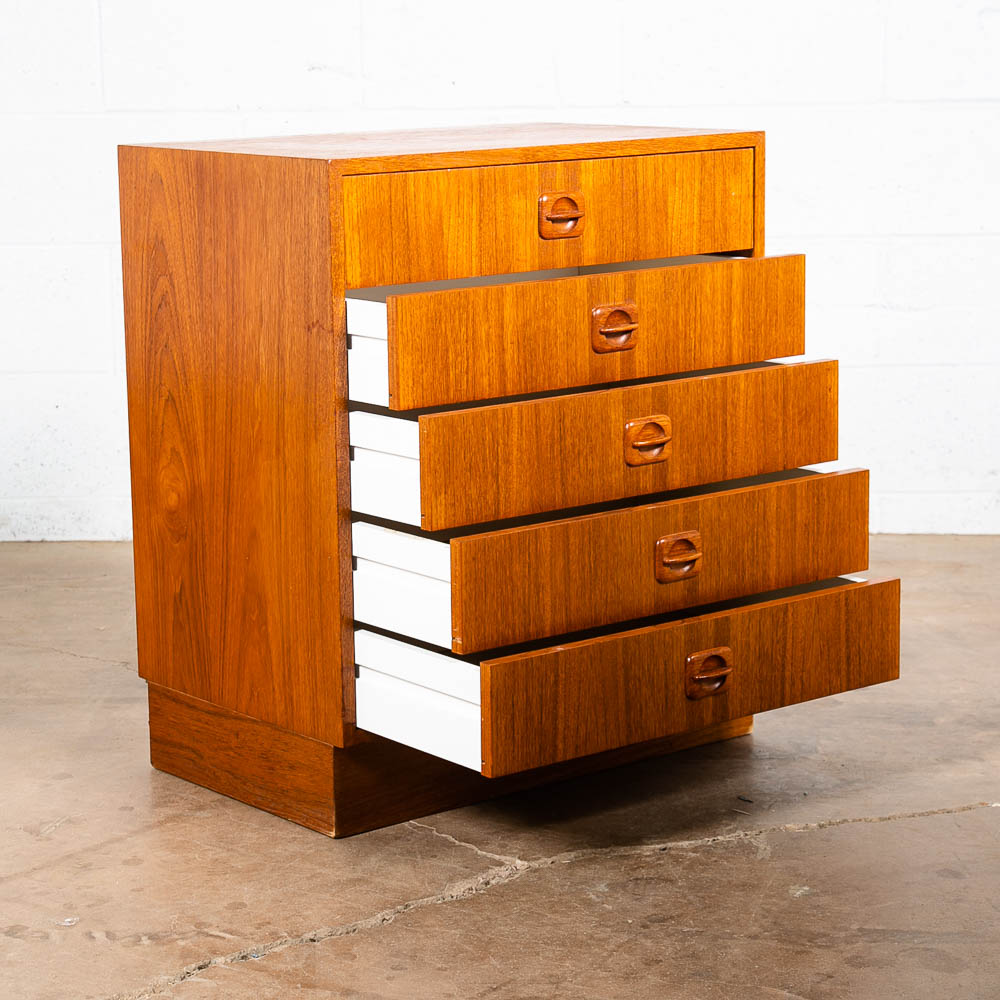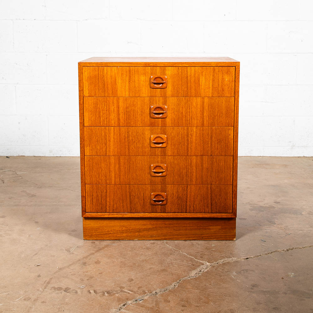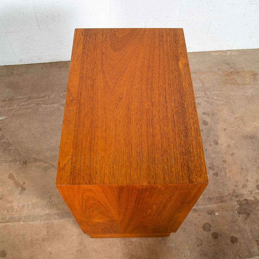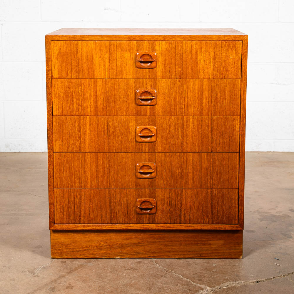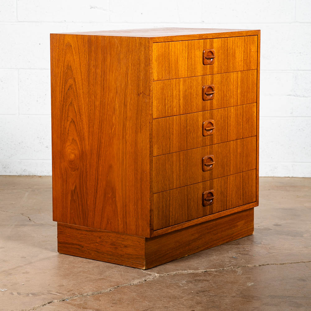 Danish designed mid century modern chest of drawers / compact dresser. Can be used as a nightstand potentially as well due to size. Room on the top surface for display or personal items. Sturdy and well made piece. Unsigned example. Please see all photos to ensure you know what you are buying. We include FREE SHIPPING in the listing price. Some exceptions apply, so please read the full shipping details below.