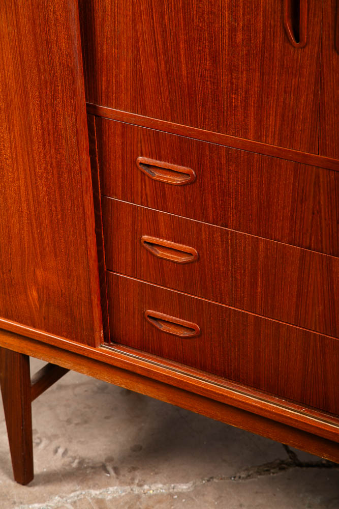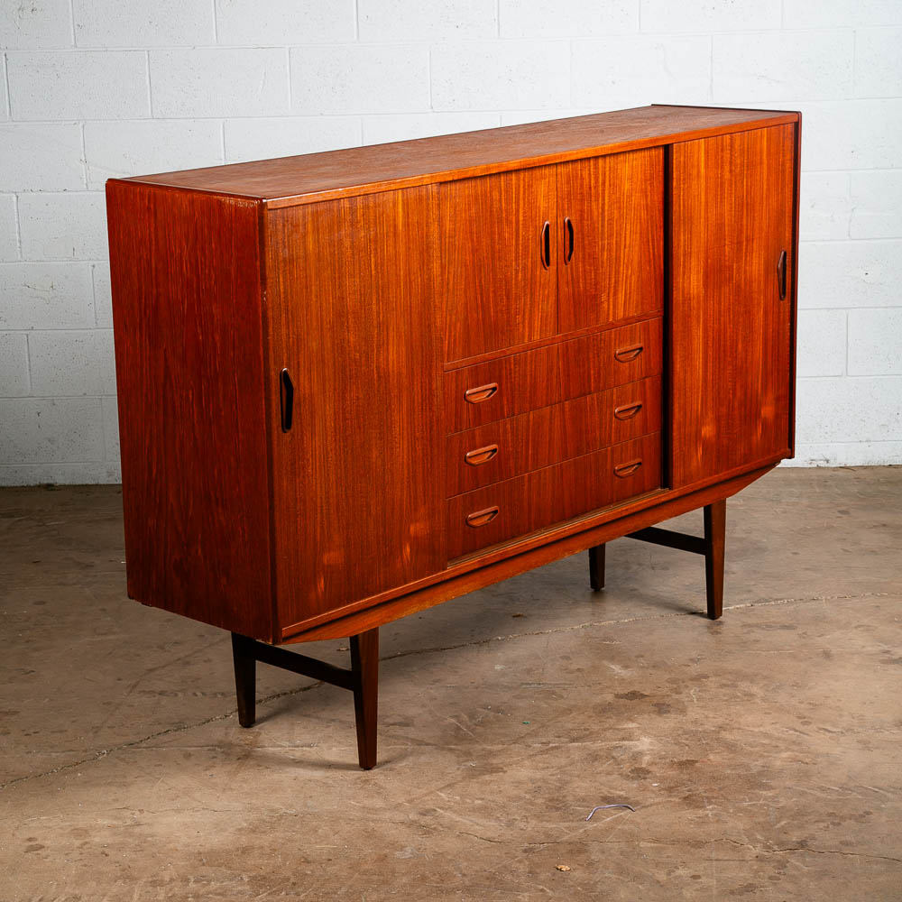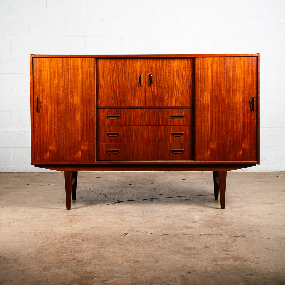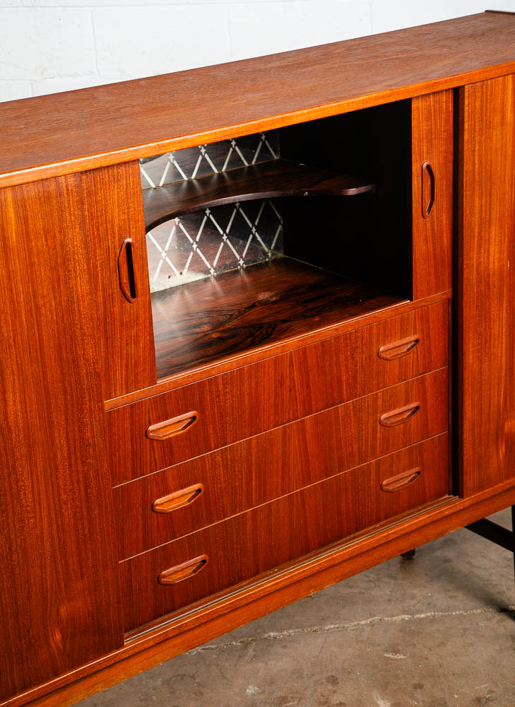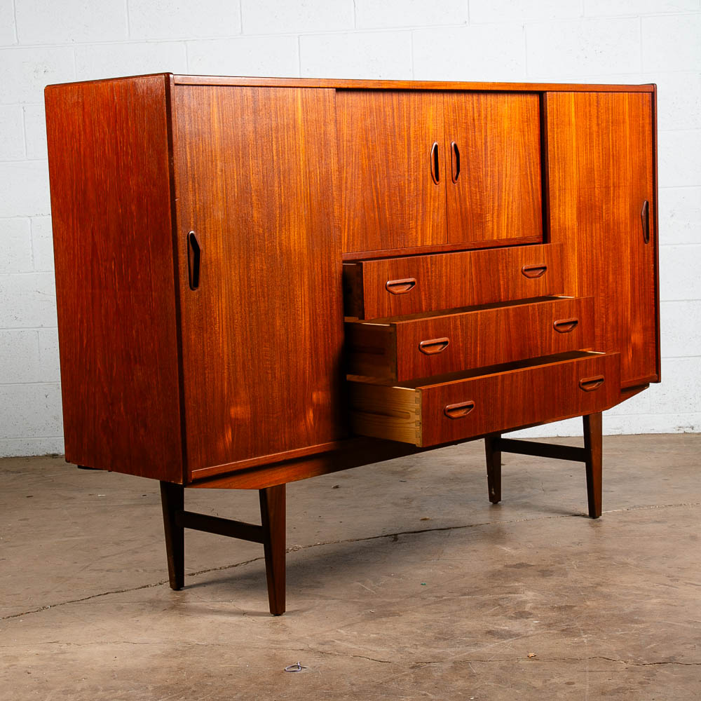 Unique and handsome Danish modern Credenza / Highboard in teak now available. This piece came with our latest shipment straight out of Denmark. These larger cabinets are getting harder and harder to get in the US due to high demand. This one comes with 3 central drawers, solid teak sculpted handles and liquor / Bar storage behind the sliding doors on the left. Additional storage included on the left and right side behind sliding doors . Functional yet beautiful piece. Stamp / tag included in the order. Please see all photos to ensure you know what you are buying. We include FREE SHIPPING in the listing price. Some exceptions apply, so please read the full shipping details below.