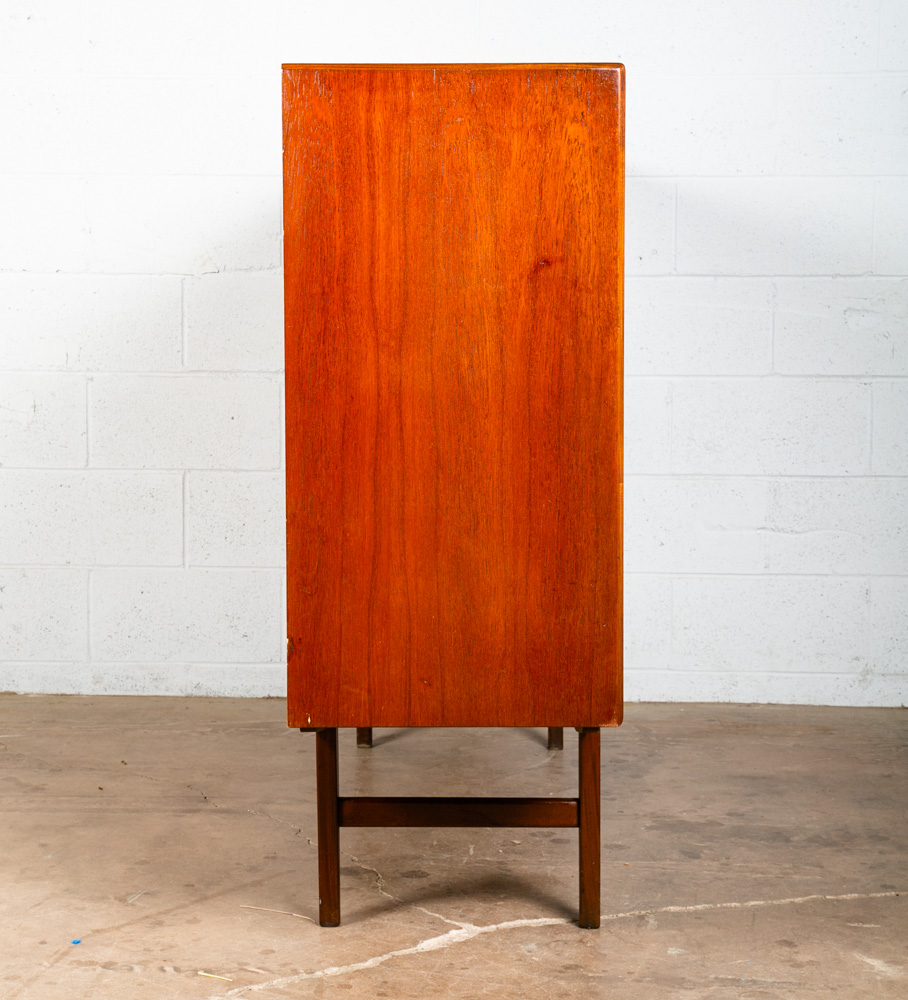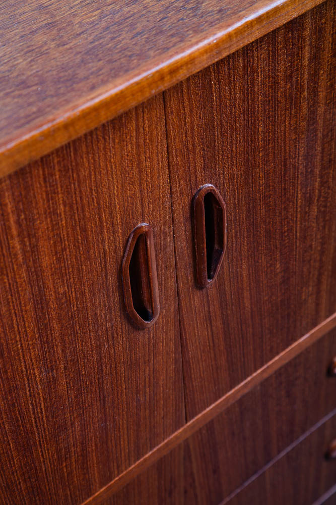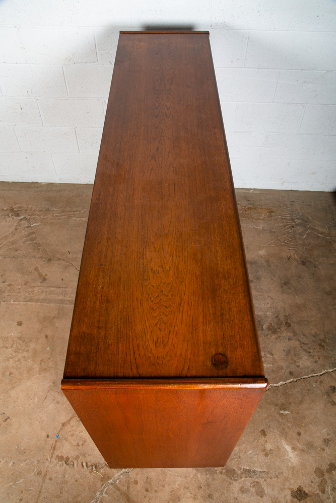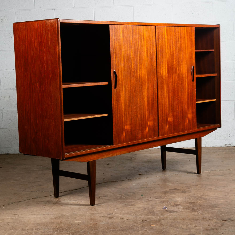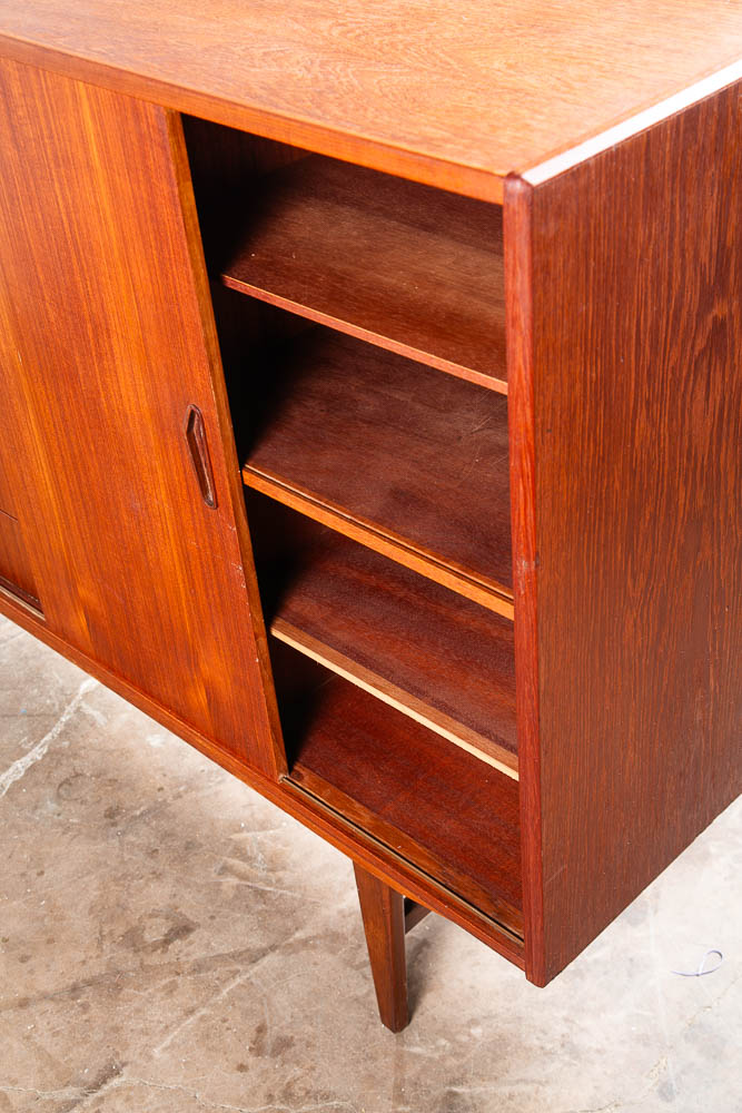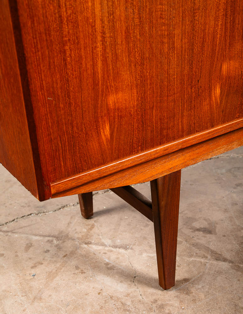 Unique and handsome Danish modern Credenza / Highboard in teak now available. This piece came with our latest shipment straight out of Denmark. These larger cabinets are getting harder and harder to get in the US due to high demand. This one comes with 3 central drawers, solid teak sculpted handles and liquor / Bar storage behind the sliding doors on the left. Additional storage included on the left and right side behind sliding doors . Functional yet beautiful piece. Stamp / tag included in the order. Please see all photos to ensure you know what you are buying. We include FREE SHIPPING in the listing price. Some exceptions apply, so please read the full shipping details below.