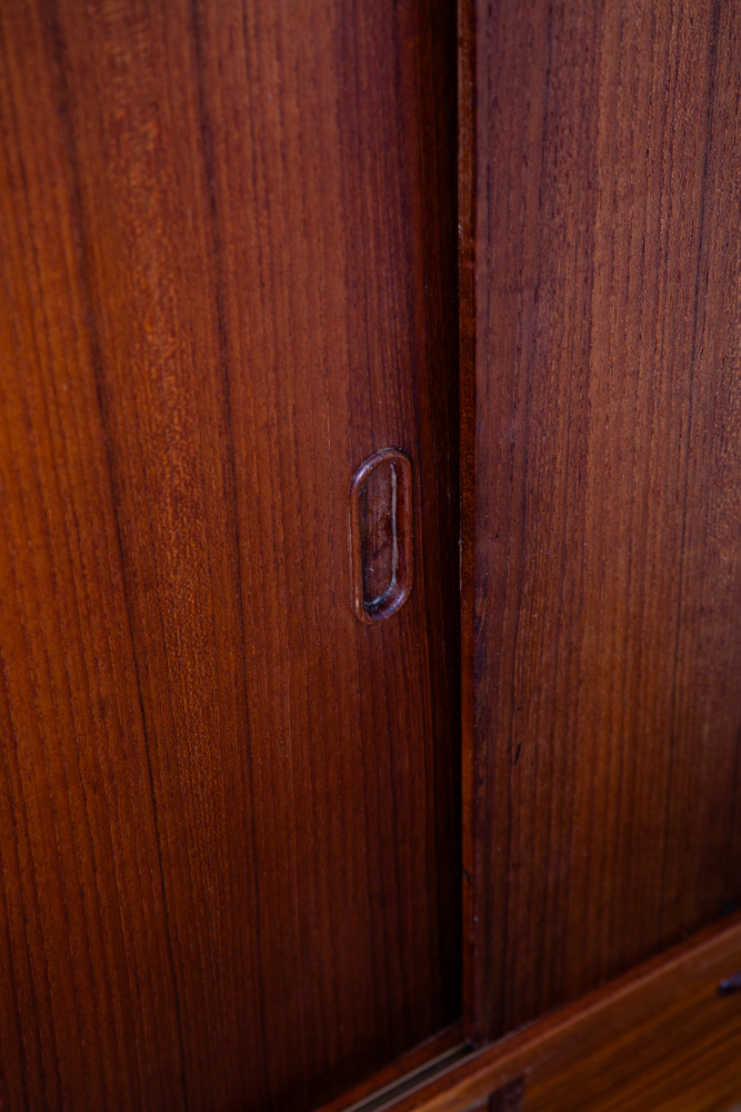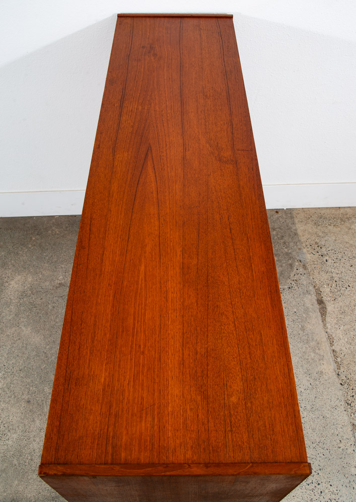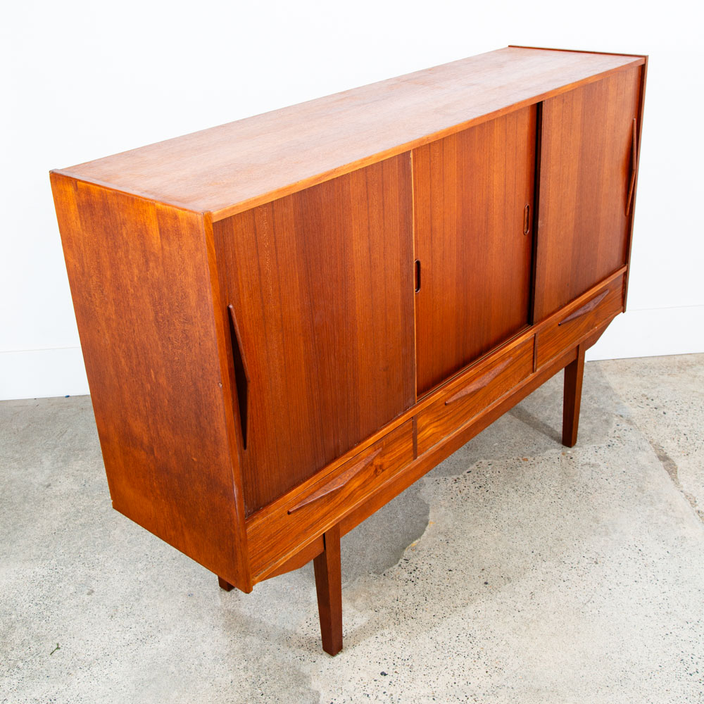 Unique and handsome Danish modern Credenza / Highboard in teak now. This piece came with our latest shipment straight out of Denmark. These larger cabinets are getting harder and harder to get in the US due to high demand. This one comes with 3 drawers, solid teak sculpted handles. storage included on the far left,right and central areas. The thick edging and solid wood construction really add class and style to any room or space. Please see all photos to ensure you know what you are buying. We include FREE SHIPPING in the listing price. Some exceptions apply, so please read the full shipping details below.