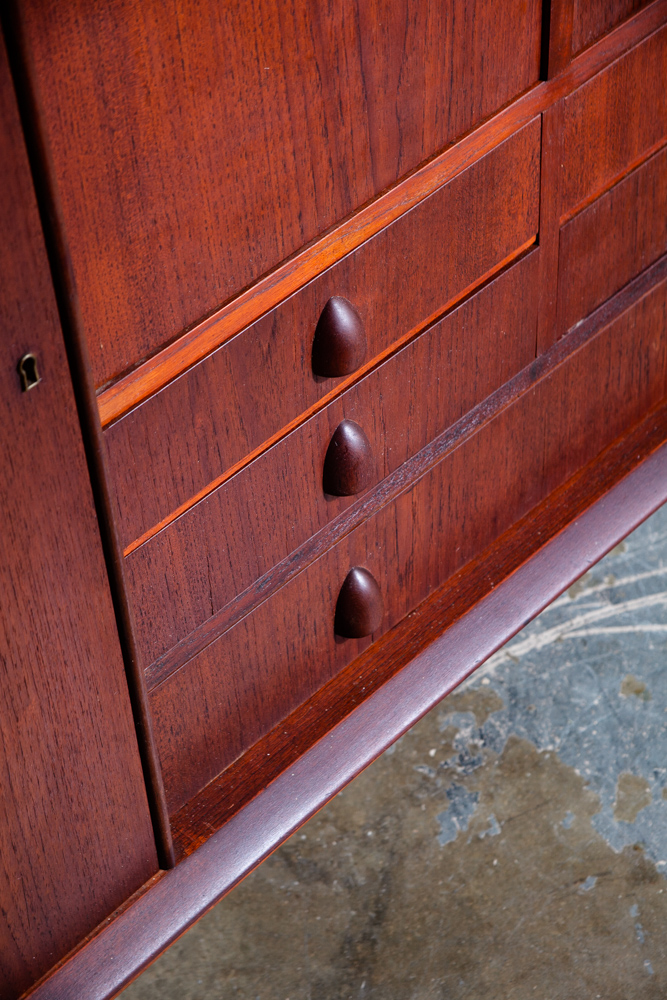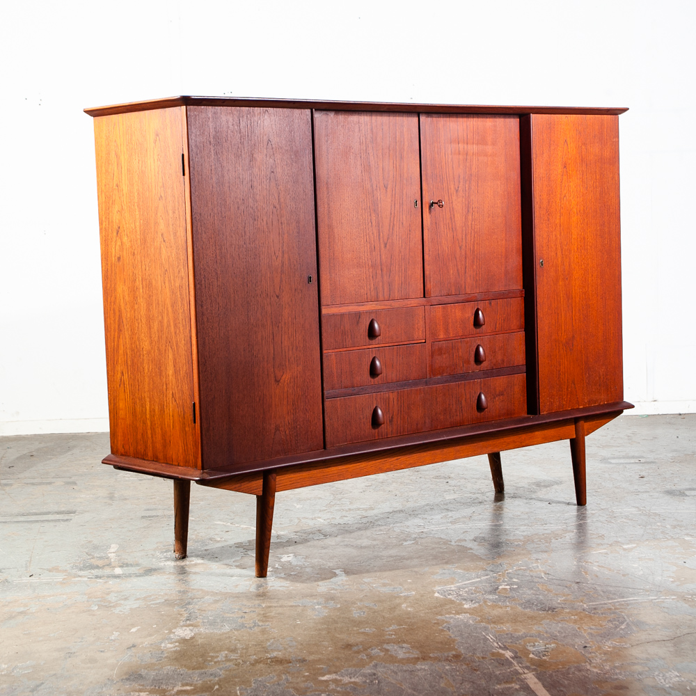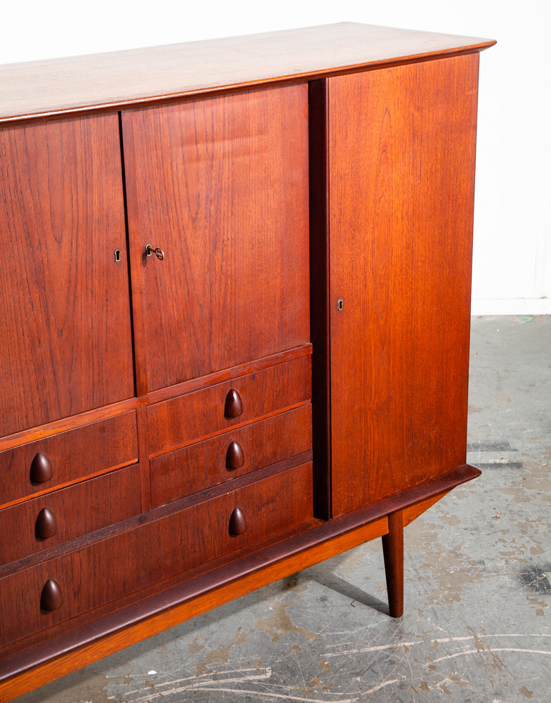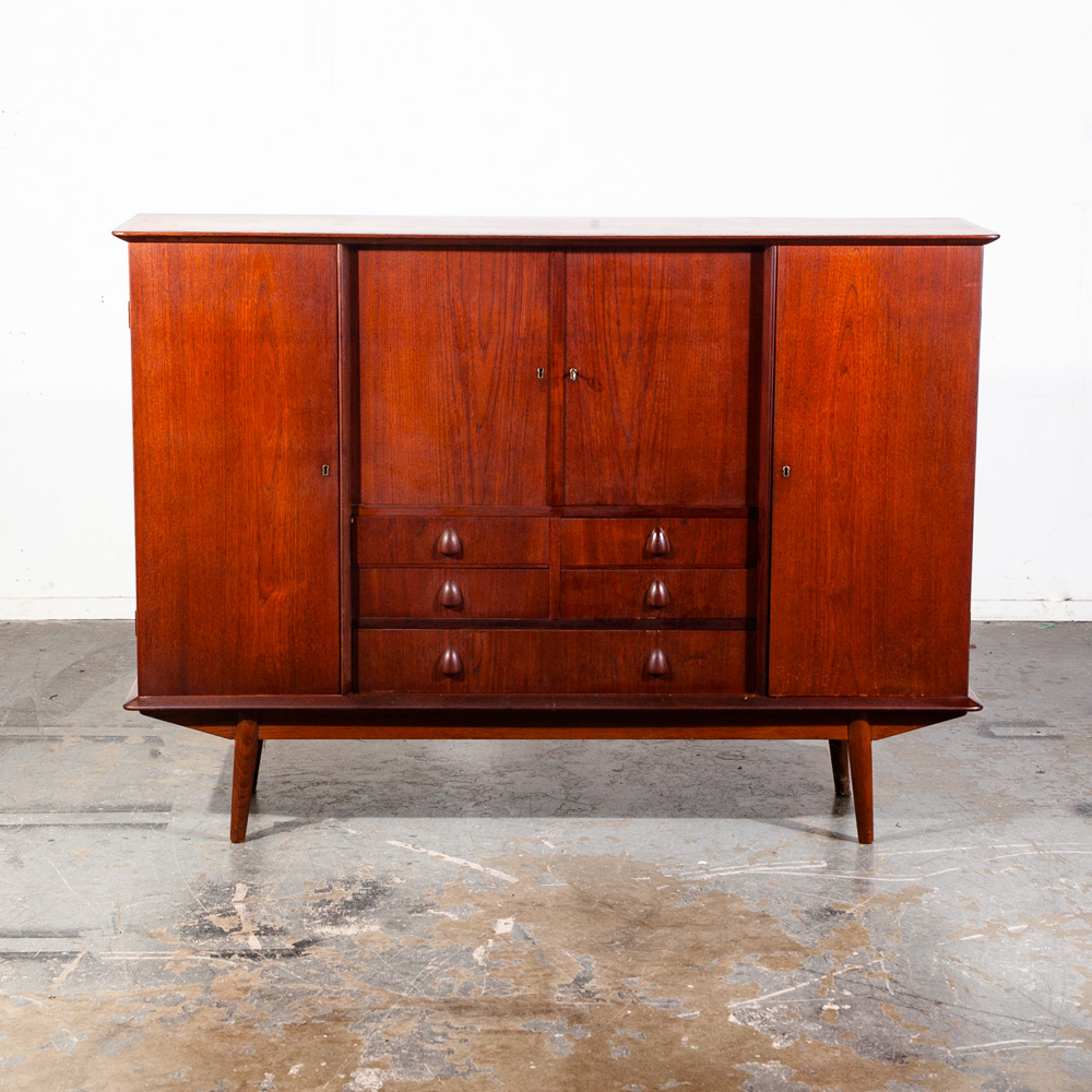 Unique and very well made danish modern credenza in teak. Tons of features included and throughout this piece including 3 locking cabinet sections, one on either side and one in the center. 5 drawers are included within the center section for furniture storage. The cabinet sits upon 4 solid wood tapered legs. We are unsure of the designer but are piece right around 1960. A unique take on danish modern design. This was imported directly from Denmark. Please see all photos to ensure you know what you are buying. We include FREE SHIPPING in the listing price. Some exceptions apply, so please read the full shipping details below.