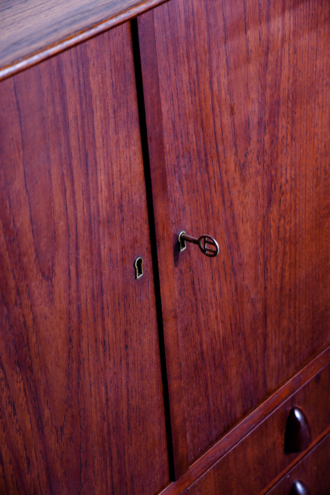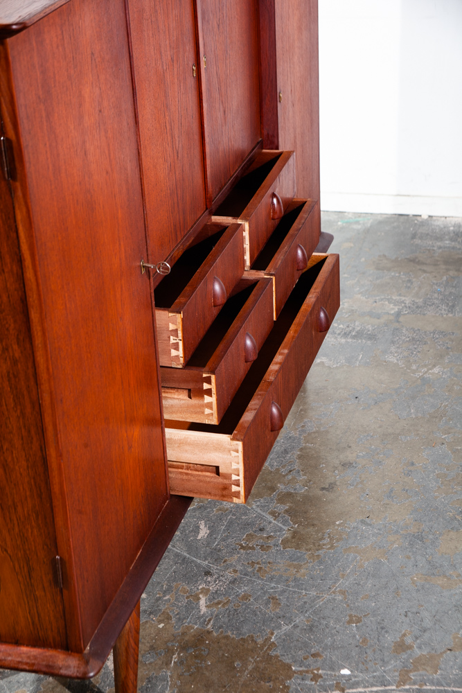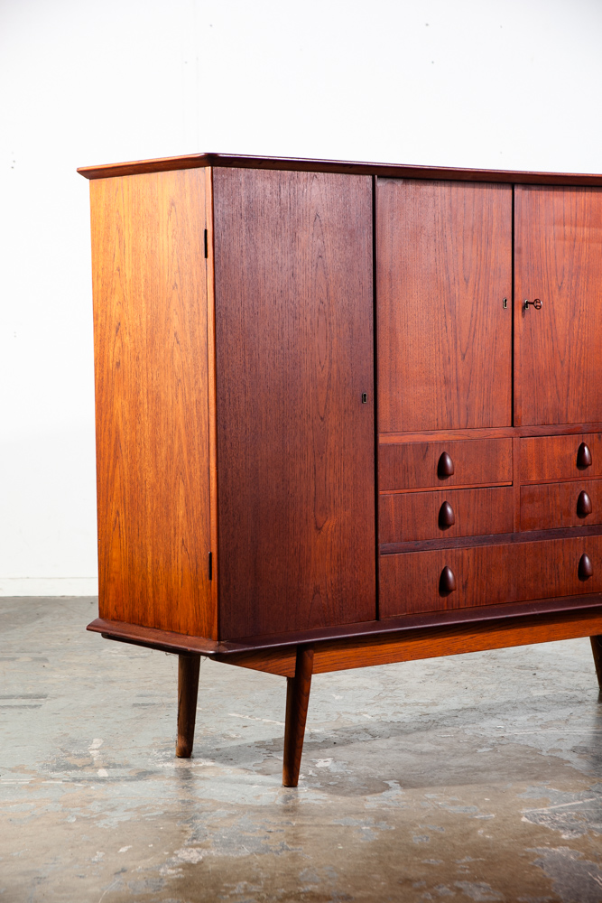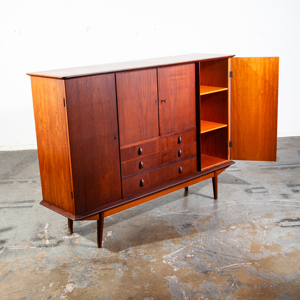 Unique and very well made danish modern credenza in teak. Tons of features included and throughout this piece including 3 locking cabinet sections, one on either side and one in the center. 5 drawers are included within the center section for furniture storage. The cabinet sits upon 4 solid wood tapered legs. We are unsure of the designer but are piece right around 1960. A unique take on danish modern design. This was imported directly from Denmark. Please see all photos to ensure you know what you are buying. We include FREE SHIPPING in the listing price. Some exceptions apply, so please read the full shipping details below.