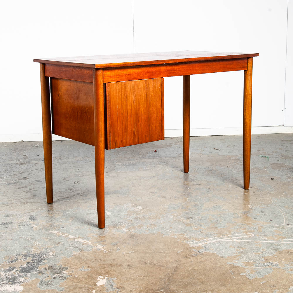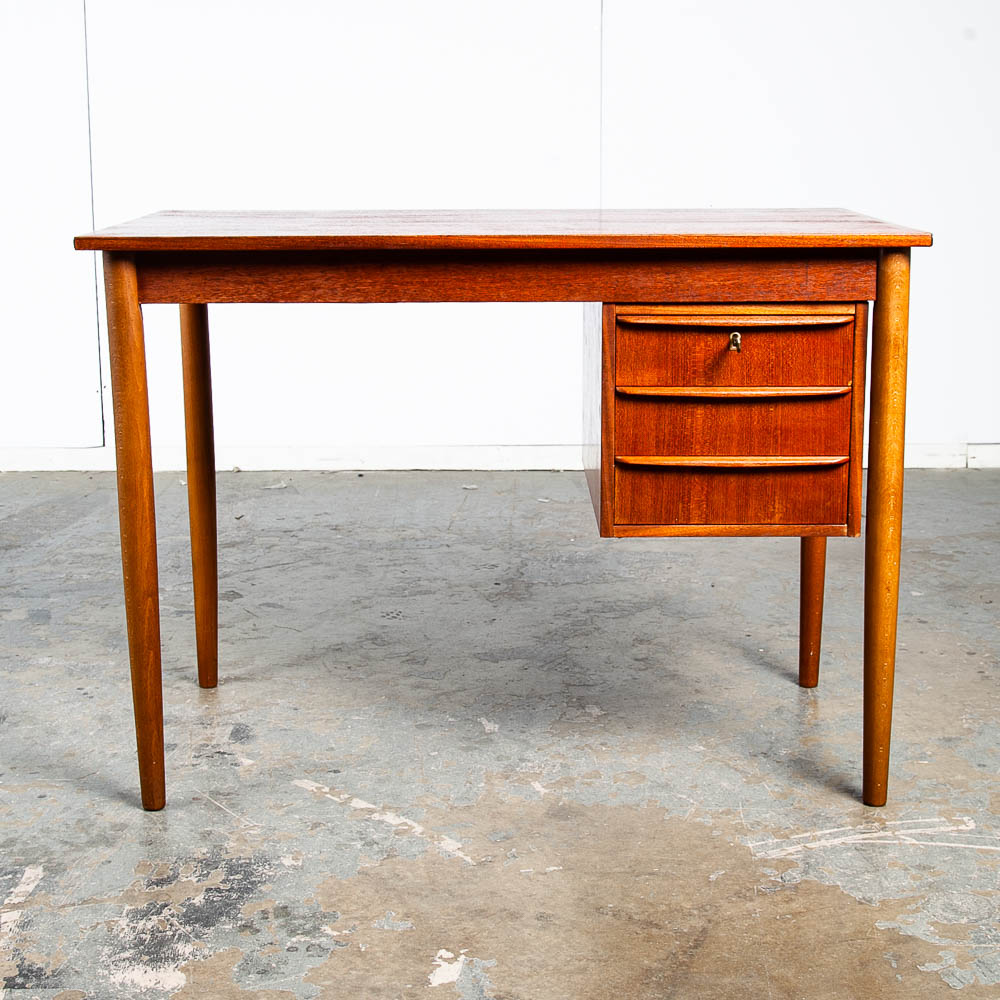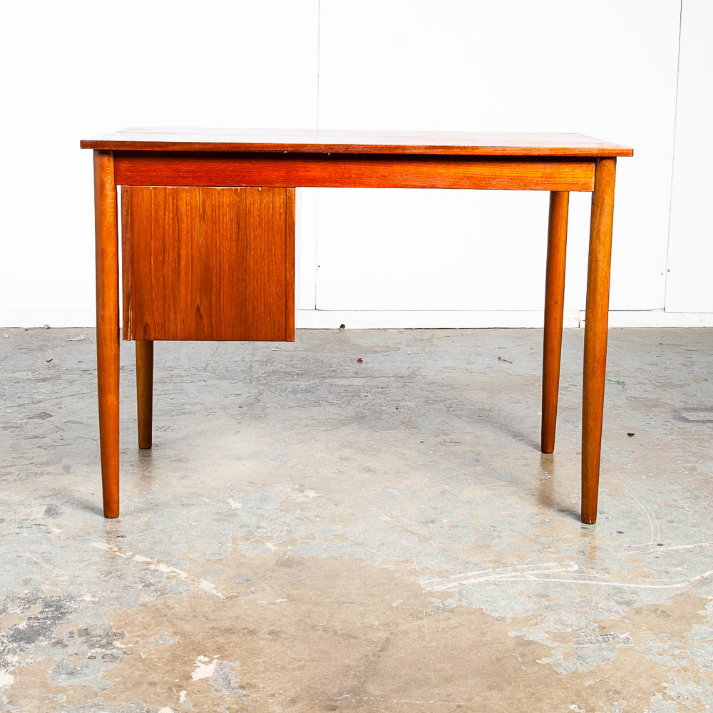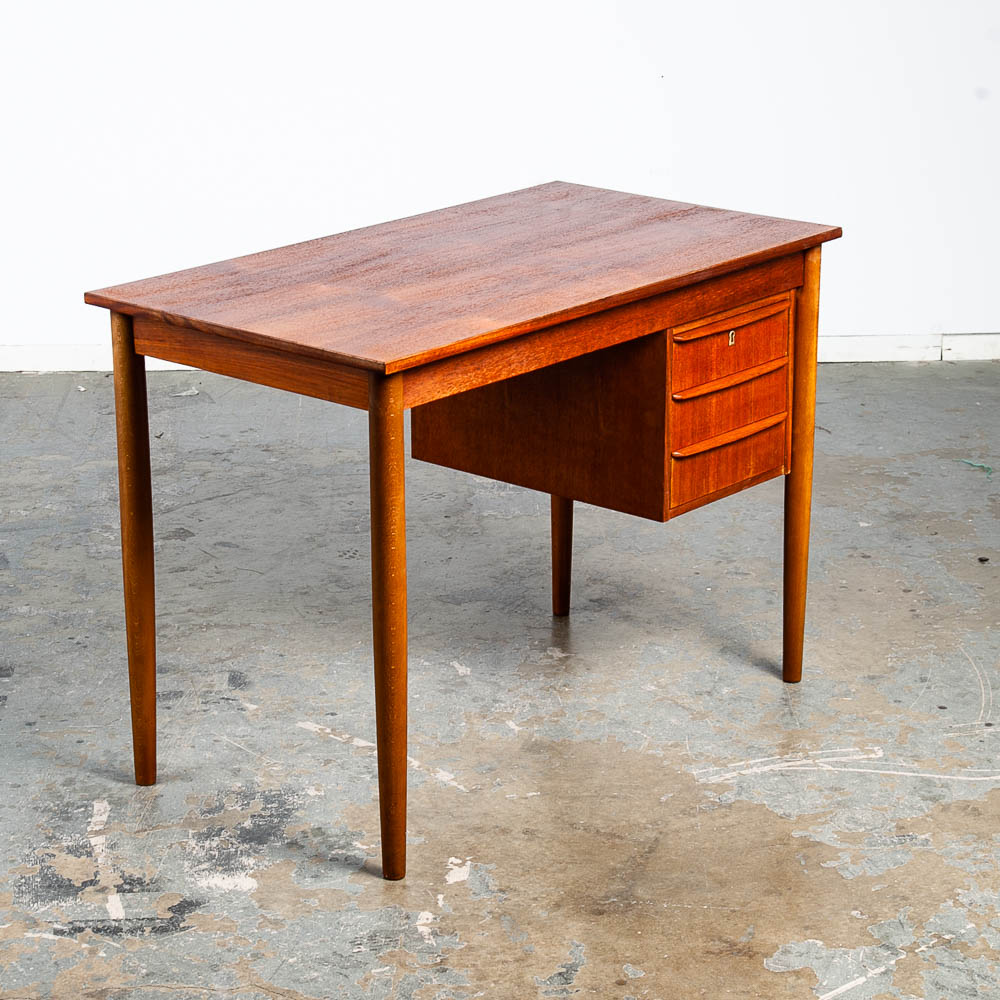 This clean and refinished Danish modern teak desk is ideal for tight spaces. The drawer stack is on the right side of the desk. The back is nicely finished so the desk can float in a room. Minimalist and well made. Great for any home or office space. Made in the 1960s and has been recently imported directly from Denmark. Please see all photos to ensure you know what you are buying. We include FREE SHIPPING in the listing price. Some exceptions apply, so please read the full shipping details below.