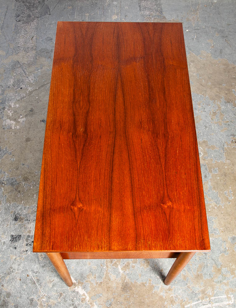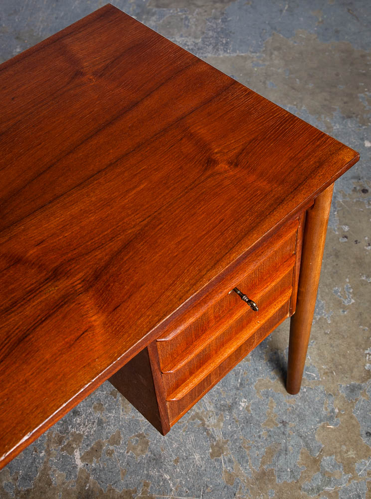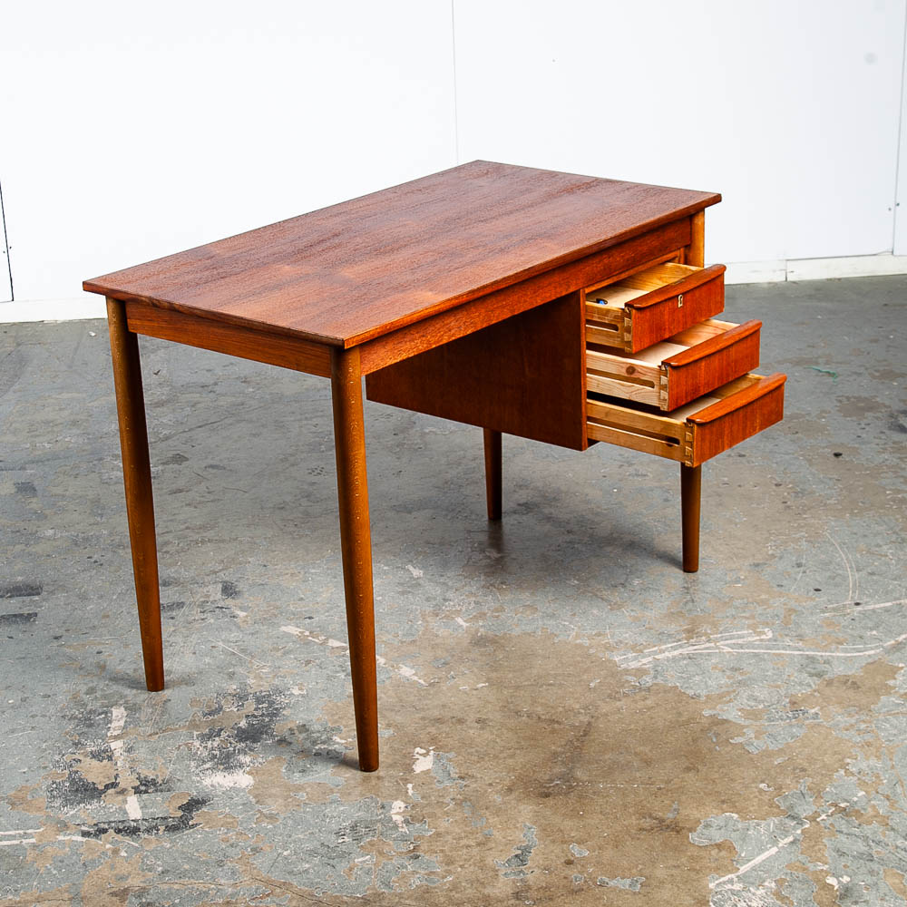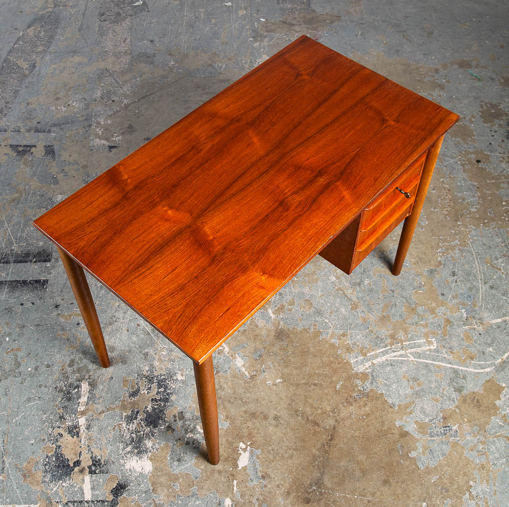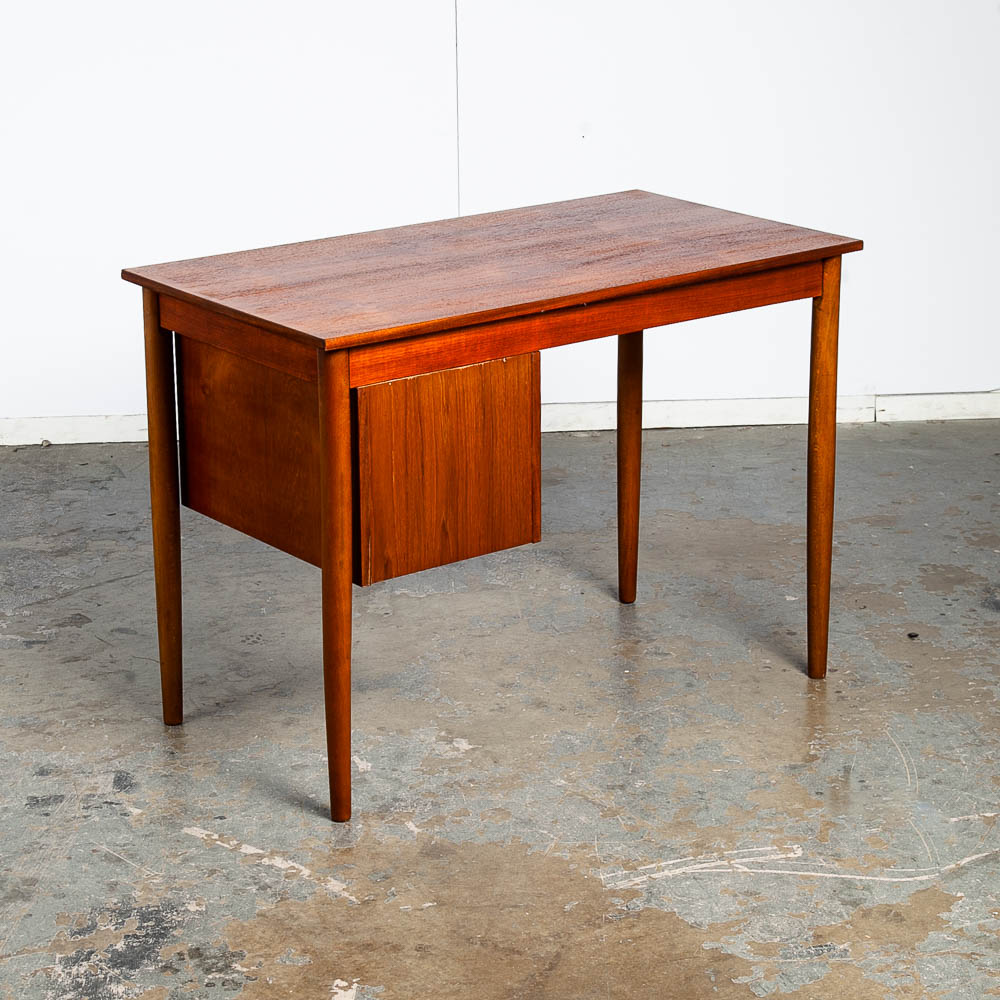This clean and refinished Danish modern teak desk is ideal for tight spaces. The drawer stack is on the right side of the desk. The back is nicely finished so the desk can float in a room. Minimalist and well made. Great for any home or office space. Made in the 1960s and has been recently imported directly from Denmark. Please see all photos to ensure you know what you are buying. We include FREE SHIPPING in the listing price. Some exceptions apply, so please read the full shipping details below.