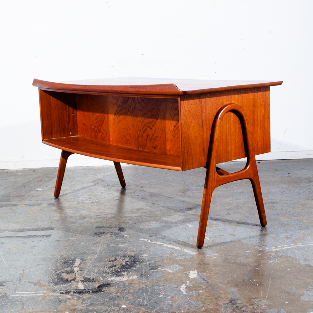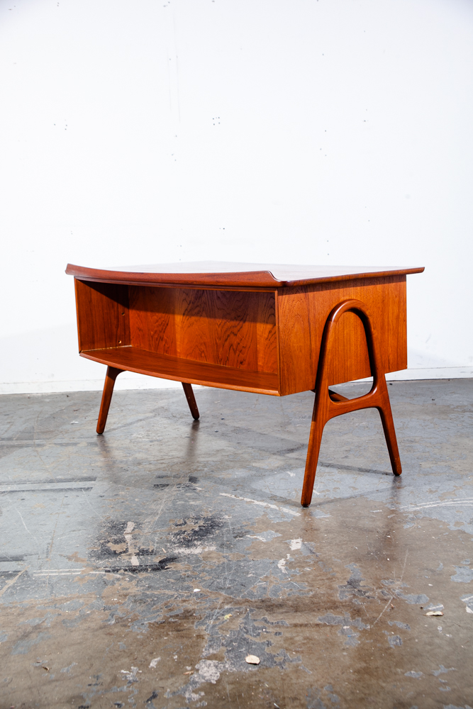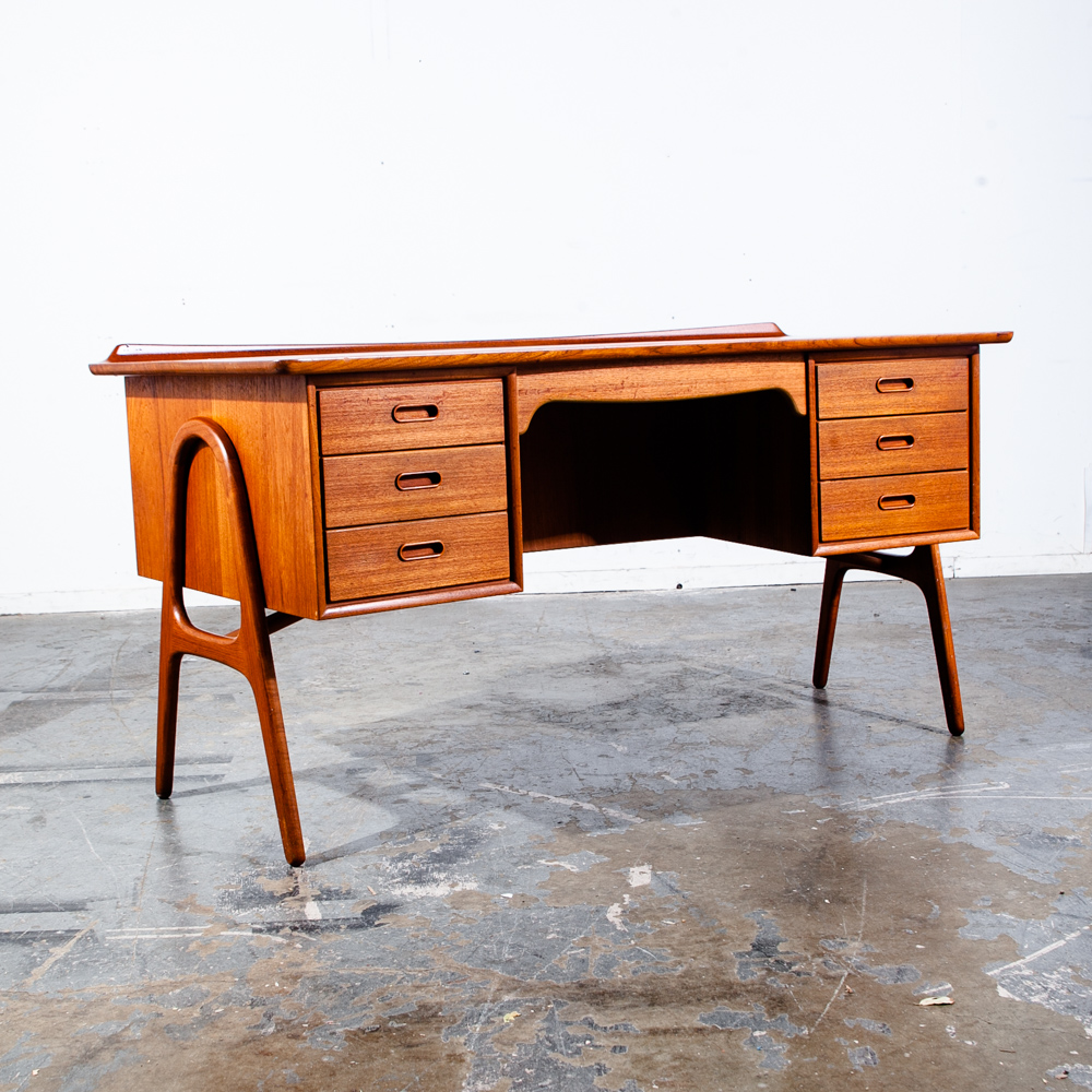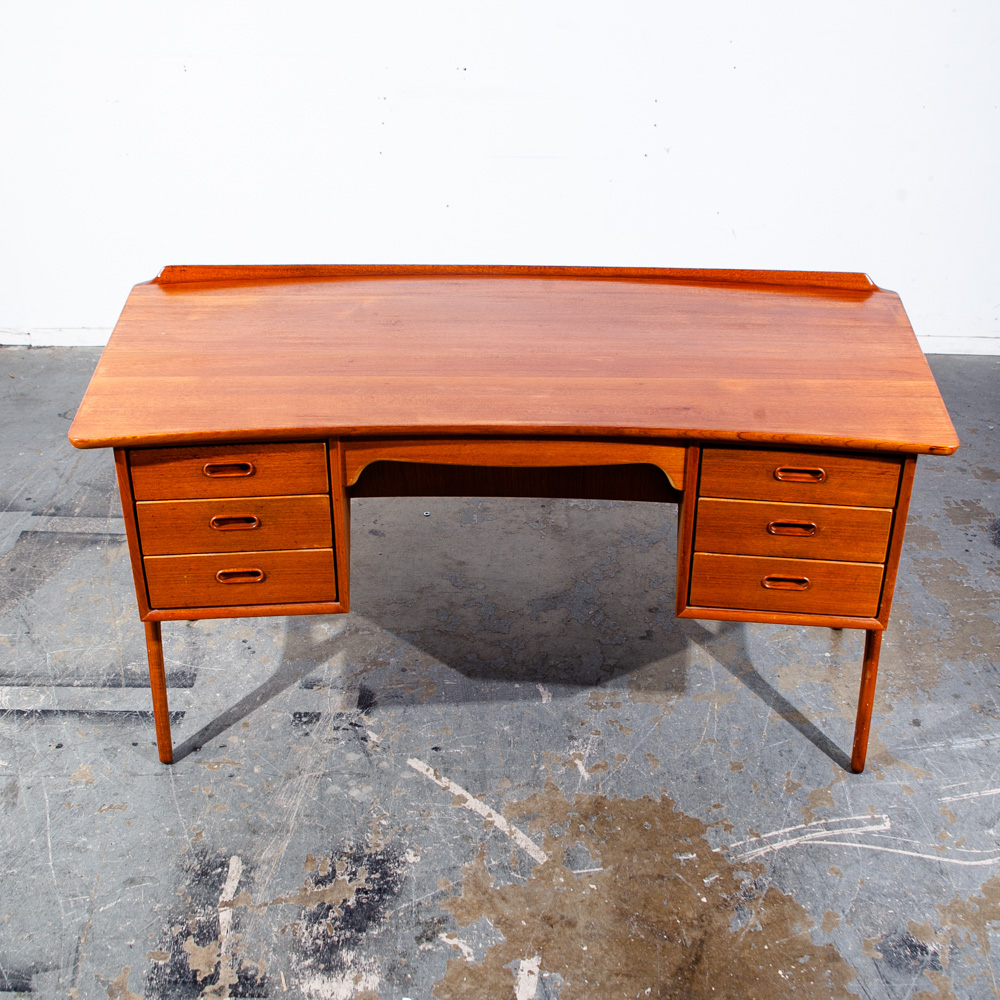 Outstanding Teak Desk, Model SH 180, designed by iconic architect Svend Madsen for Sigurd Hansen. Made in the in the early 1960s. The curved case sits on a teak frame with contrasting solid Teak sculpted legs. It has 6 drawers in front and an open back for further storage or to be used as a bookshelf. Each drawer is signed and marked beneath. The front of the piece offers a bookshelf and can therefore be floated in the middle of a room or space. Truly a fine example of the SH 180 Executive desk in teak. Please see all photos to ensure you know what you are buying. We include FREE SHIPPING in the listing price. Some exceptions apply, so please read the full shipping details below.