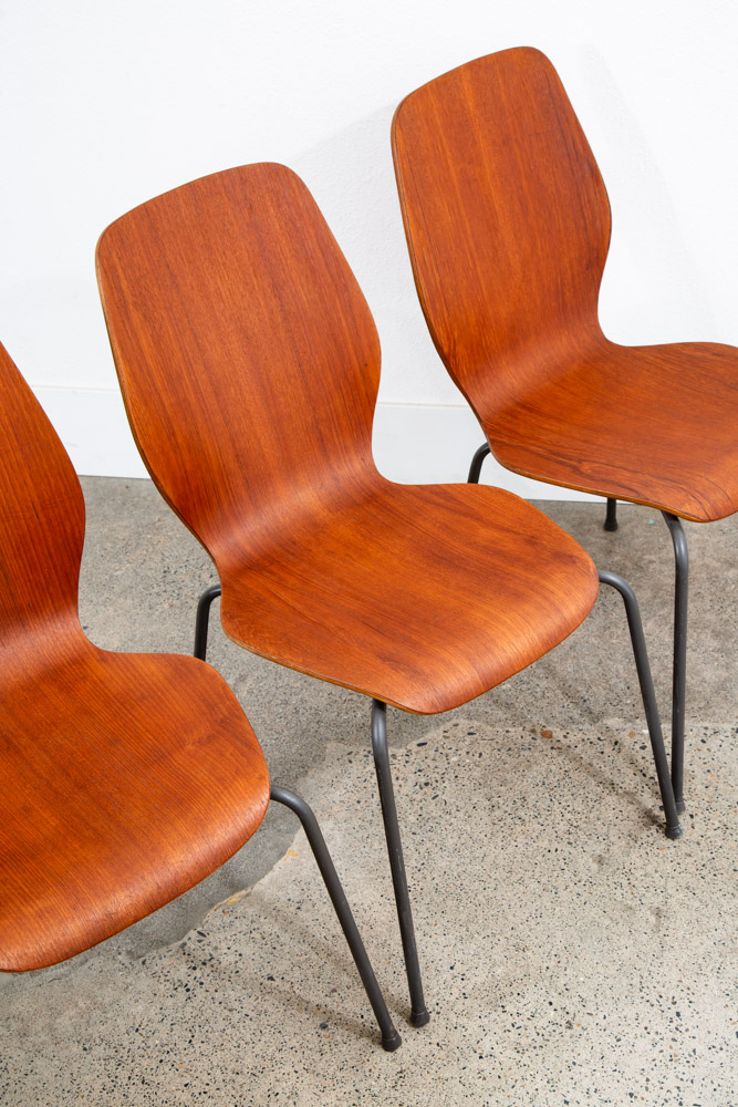 Chair set of 4 by Herbert Hirche for Jofa Stalmobler. Made in Denmark. Beautiful Scandinavian design with beautiful teak wood grain throughout. well built and very comfortable. Stackable. Legs are plated tubular steel frame. Structurally sound and not shaky. Seat is made of thick plywood with teak veneer. Stamped "Made in Denmark" beneath. We include FREE SHIPPING in the listing price. Some exceptions apply, so please read the full shipping details below.