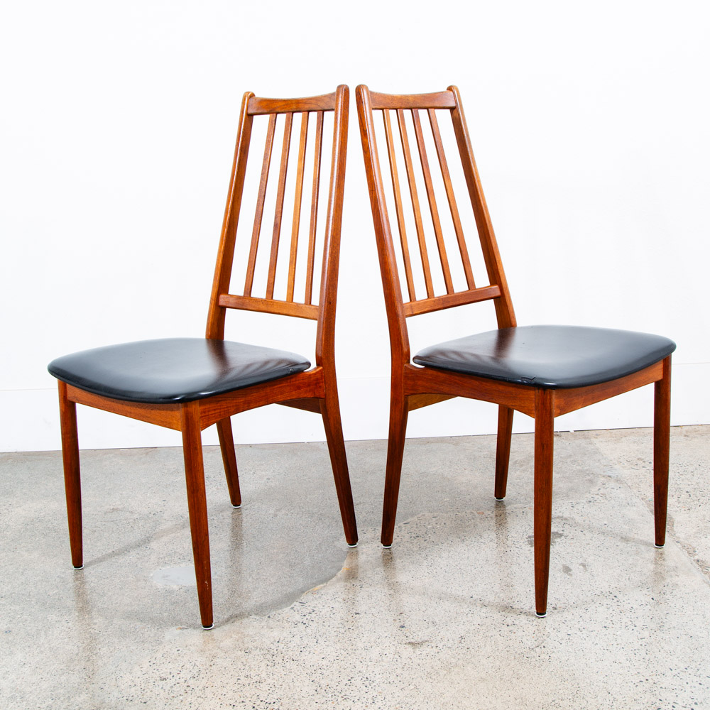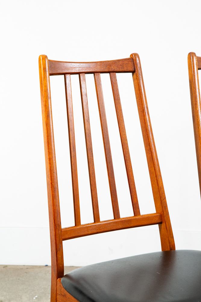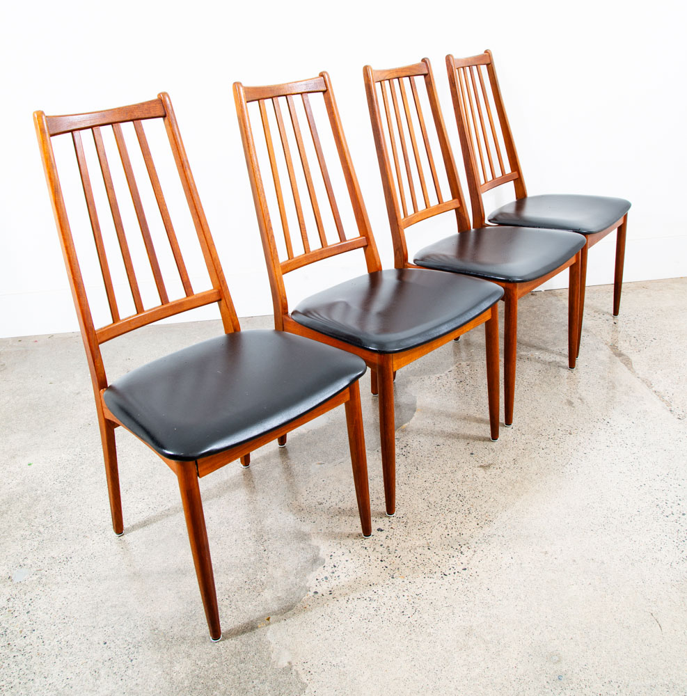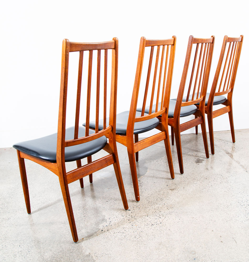Clean and classic Danish modern round back ladder back dining chairs in black faux leather. Comes in a set of 4 and marked "Made in Denmark". Recently reupholstered in black vinyl. The frames are made up of solid wood. beautiful lines that are sure to add style and sophistication to any space. Please see all photos to ensure you know what you are buying. We include FREE SHIPPING in the listing price. Some exceptions apply, so please read the full shipping details below.