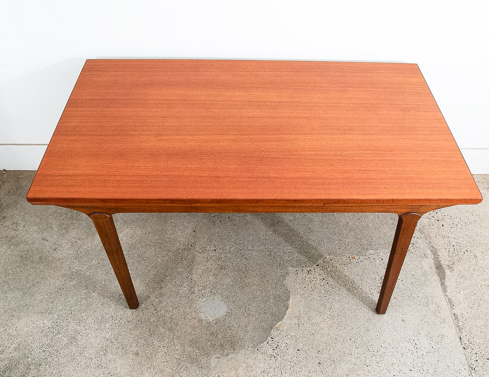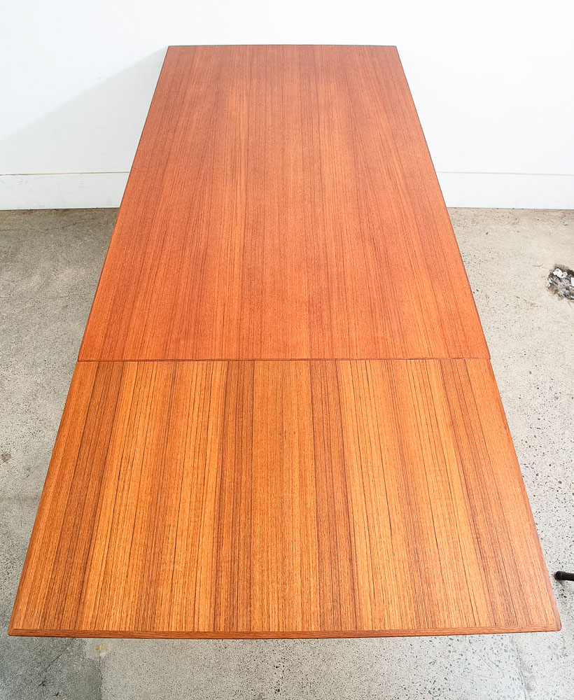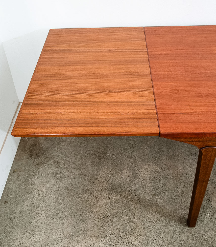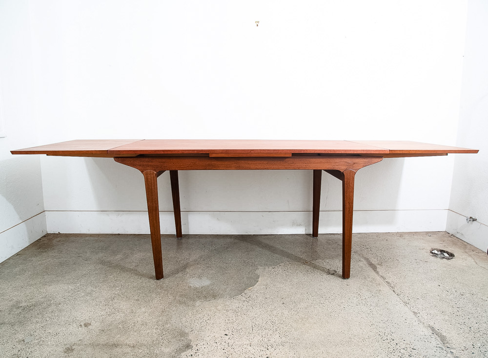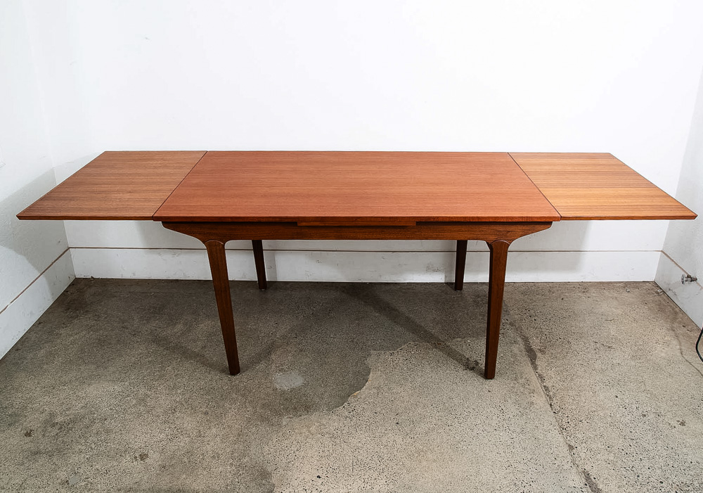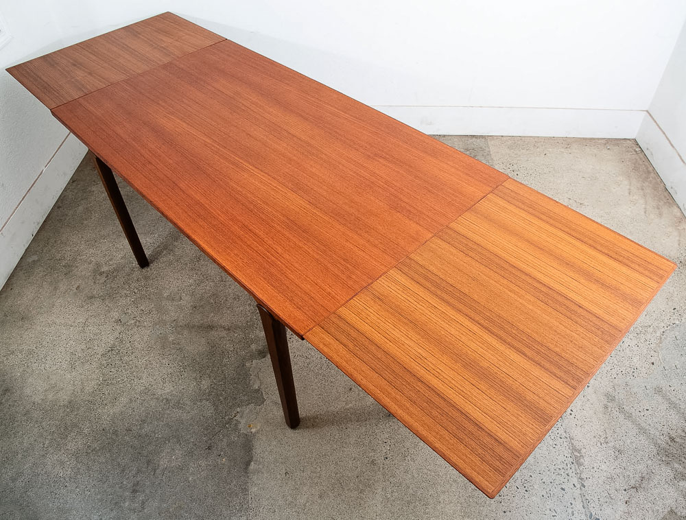 This is an excellent restored teak dining table, made in Denmark. It features two extendable draw leaves, that pull out to extend the table to 101" long. When not in use, the leaves slide under the table's deck and nest there visibly. No tools needed to convert it, no cumbersome leaves to store under the bed. Please see all photos to ensure you know what you are buying. We include FREE SHIPPING in the listing price. Some exceptions apply, so please read the full shipping details below.