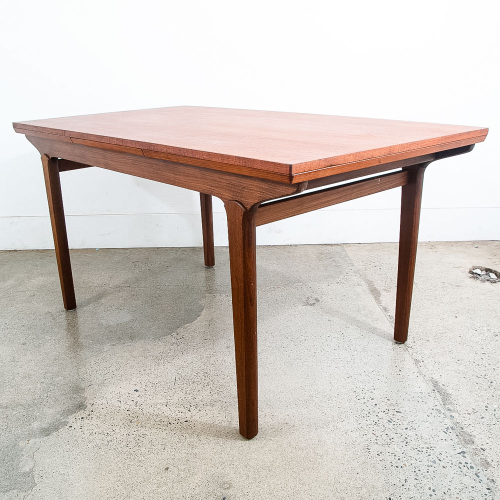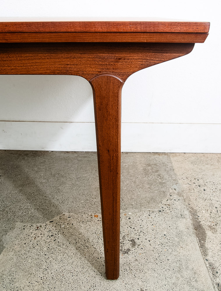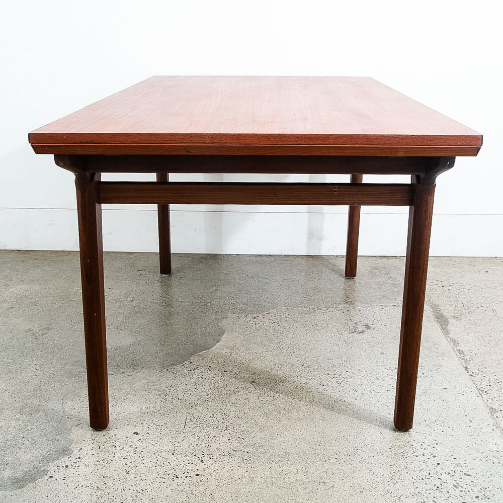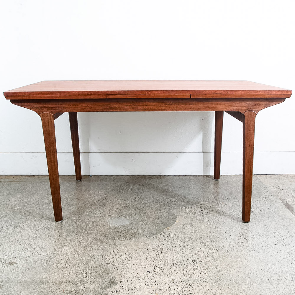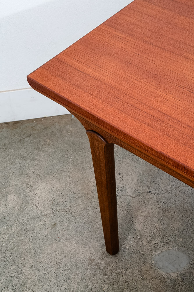 This is an excellent restored teak dining table, made in Denmark. It features two extendable draw leaves, that pull out to extend the table to 101" long. When not in use, the leaves slide under the table's deck and nest there visibly. No tools needed to convert it, no cumbersome leaves to store under the bed. Please see all photos to ensure you know what you are buying. We include FREE SHIPPING in the listing price. Some exceptions apply, so please read the full shipping details below.