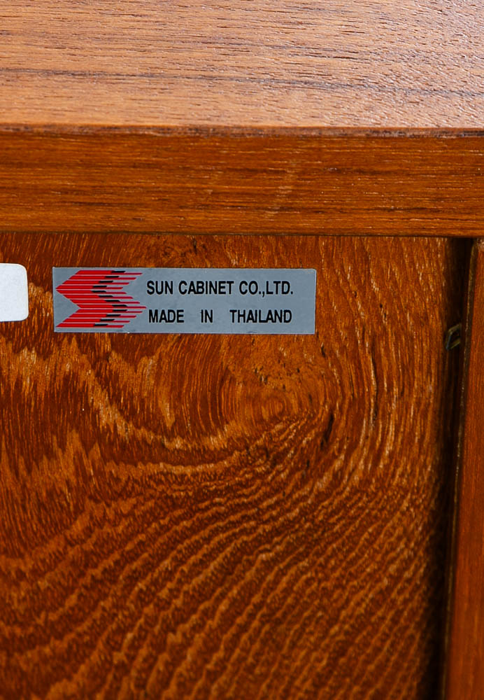 Mid century Danish modern teak 6 drawer dresser by Sun Cabinet Co. Each drawer offers smooth sliding action. The center offers a single cabinet section with shelf. These pieces are extremely well made and will last a lifetime if maintained. stamped example. Please see all photos to ensure you know what you are buying. We include FREE SHIPPING in the listing price. Some exceptions apply, so please read the full shipping details below.