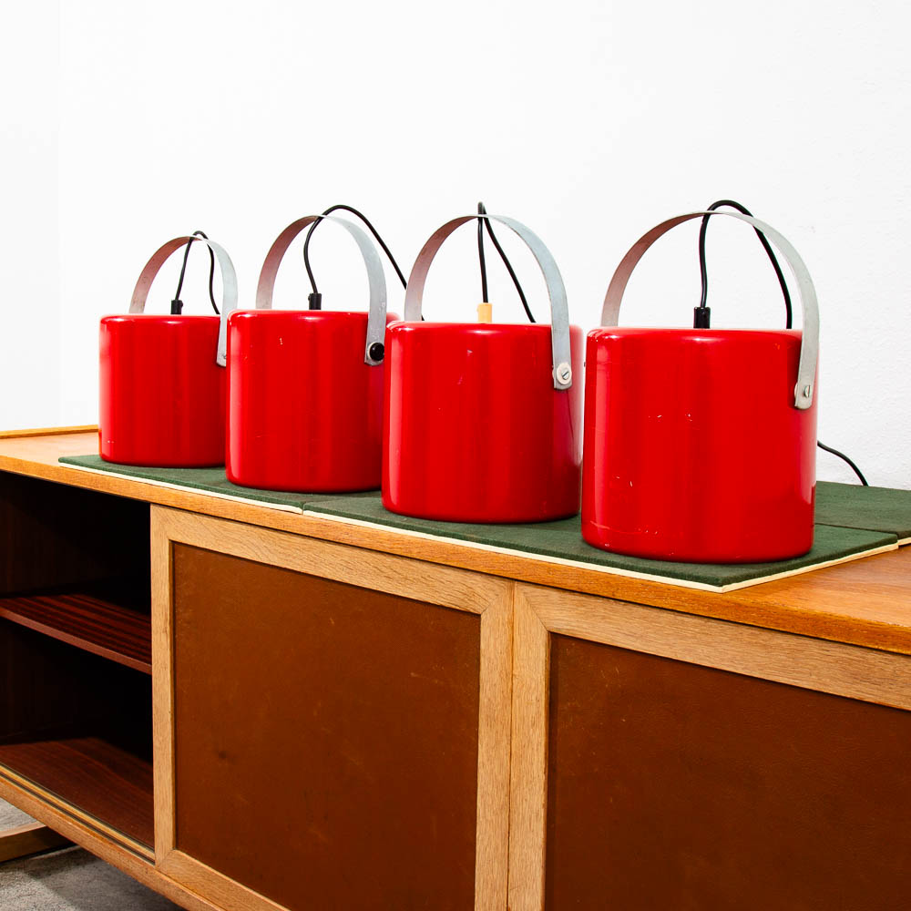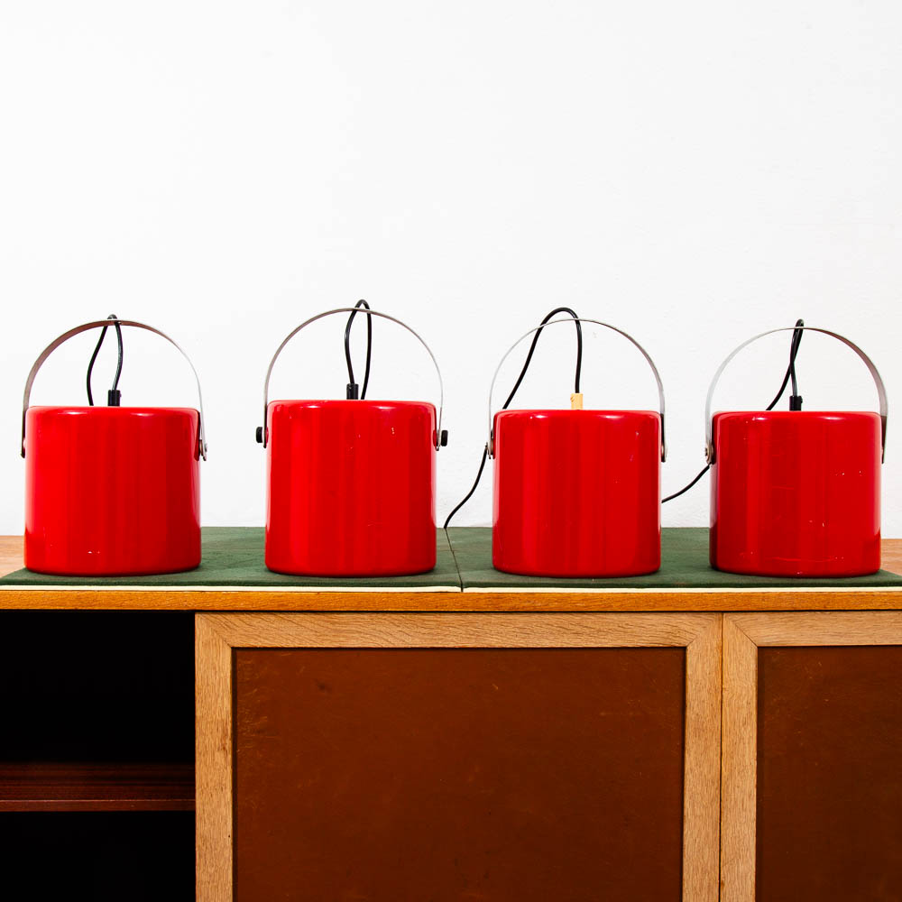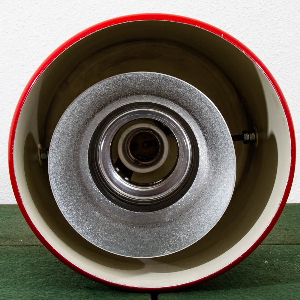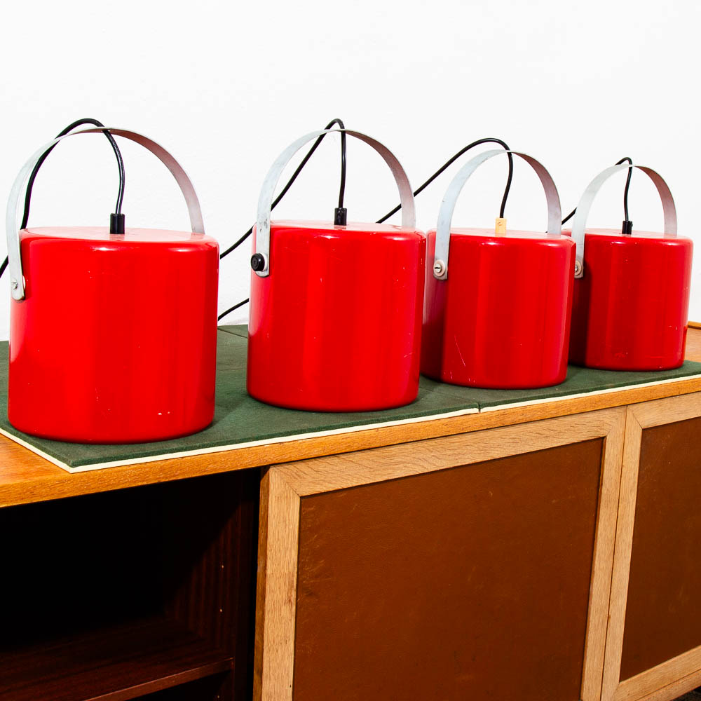 Louis Poulsen red metal and iron drum pendant / drum lamps. Sold as a set of 4 Will need to be hardwired in for operation. We include FREE SHIPPING in the listing price. Some exceptions apply, so please read the full shipping details below.