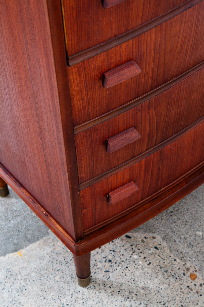 Danish modern 6 drawer highboy dresser in solid teak and teak veneer. Each drawer offers 2 solid teak drawer handles. Great piece for any smaller apartment or space with limited bedroom space. Don't lose out on this classic danish design. Recently imported from Denmark. Please see all photos to ensure you know what you are buying. We include FREE SHIPPING in the listing price. Some exceptions apply, so please read the full shipping details below.