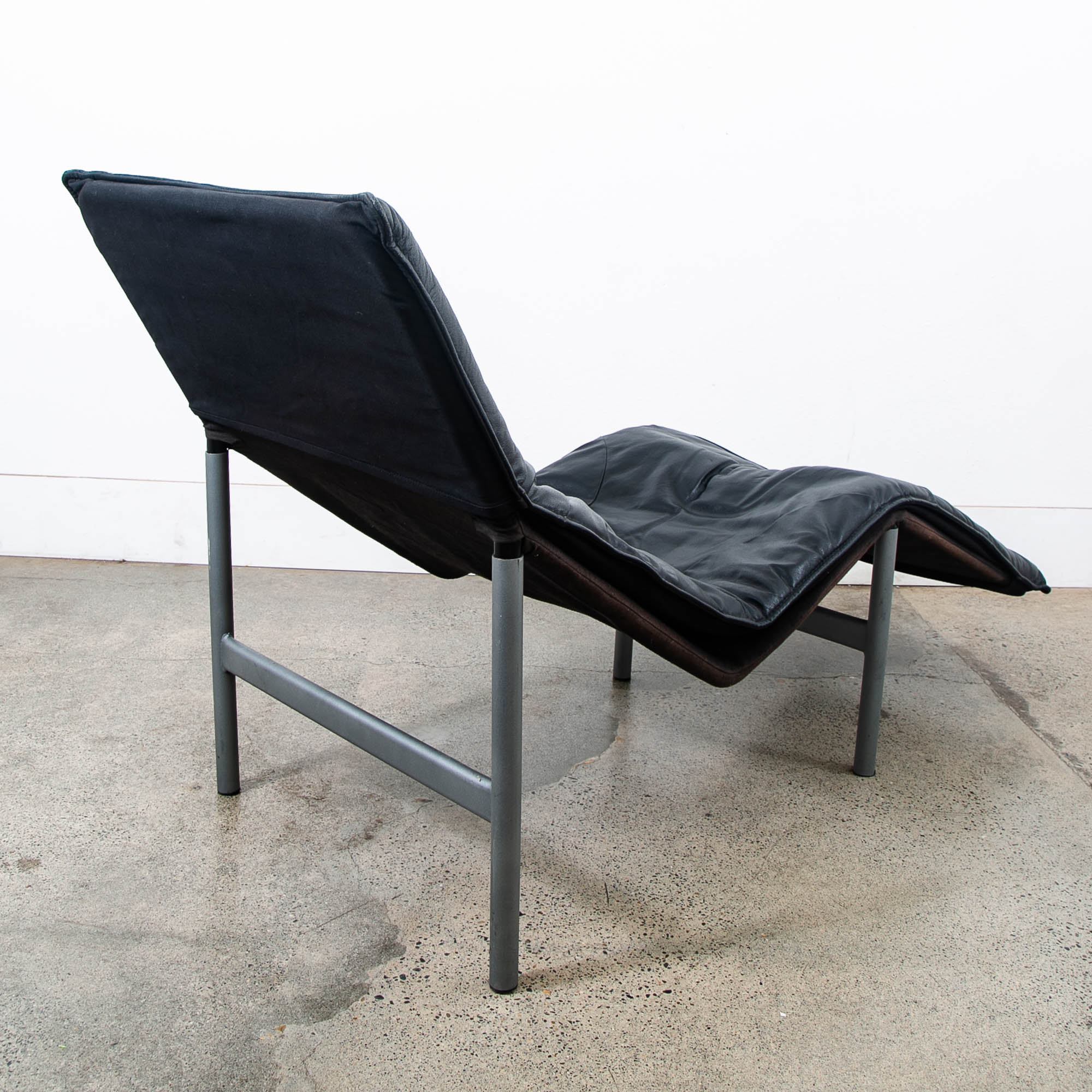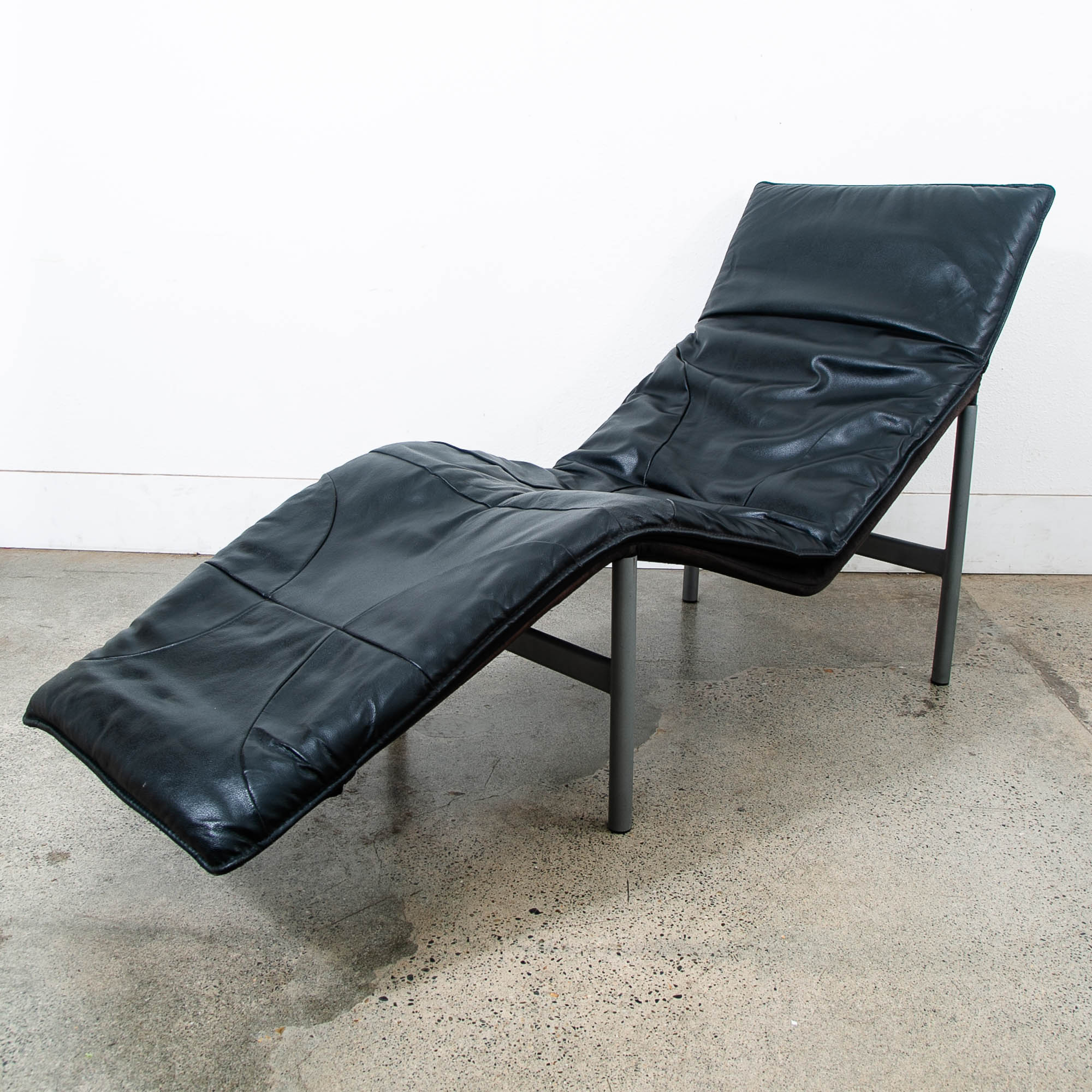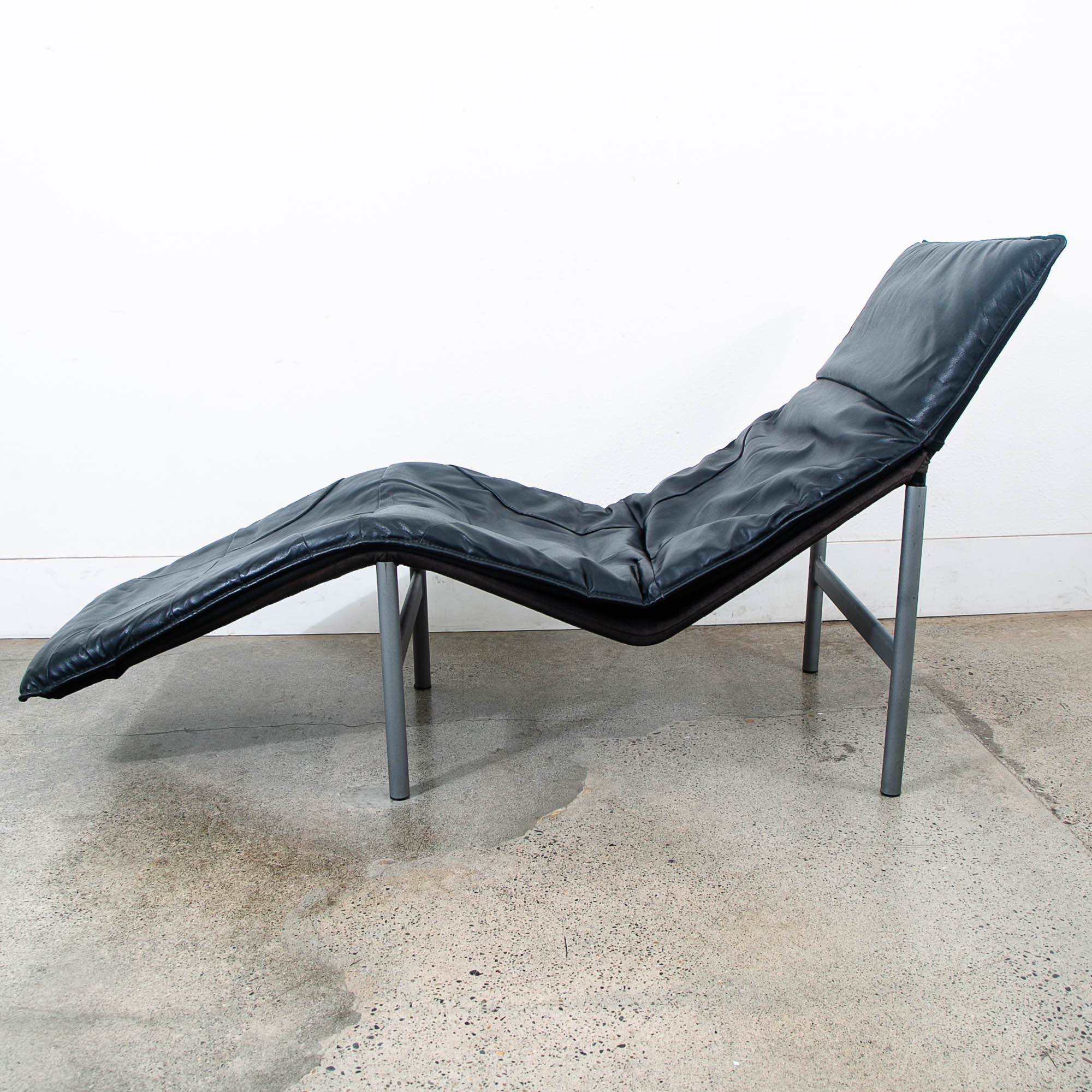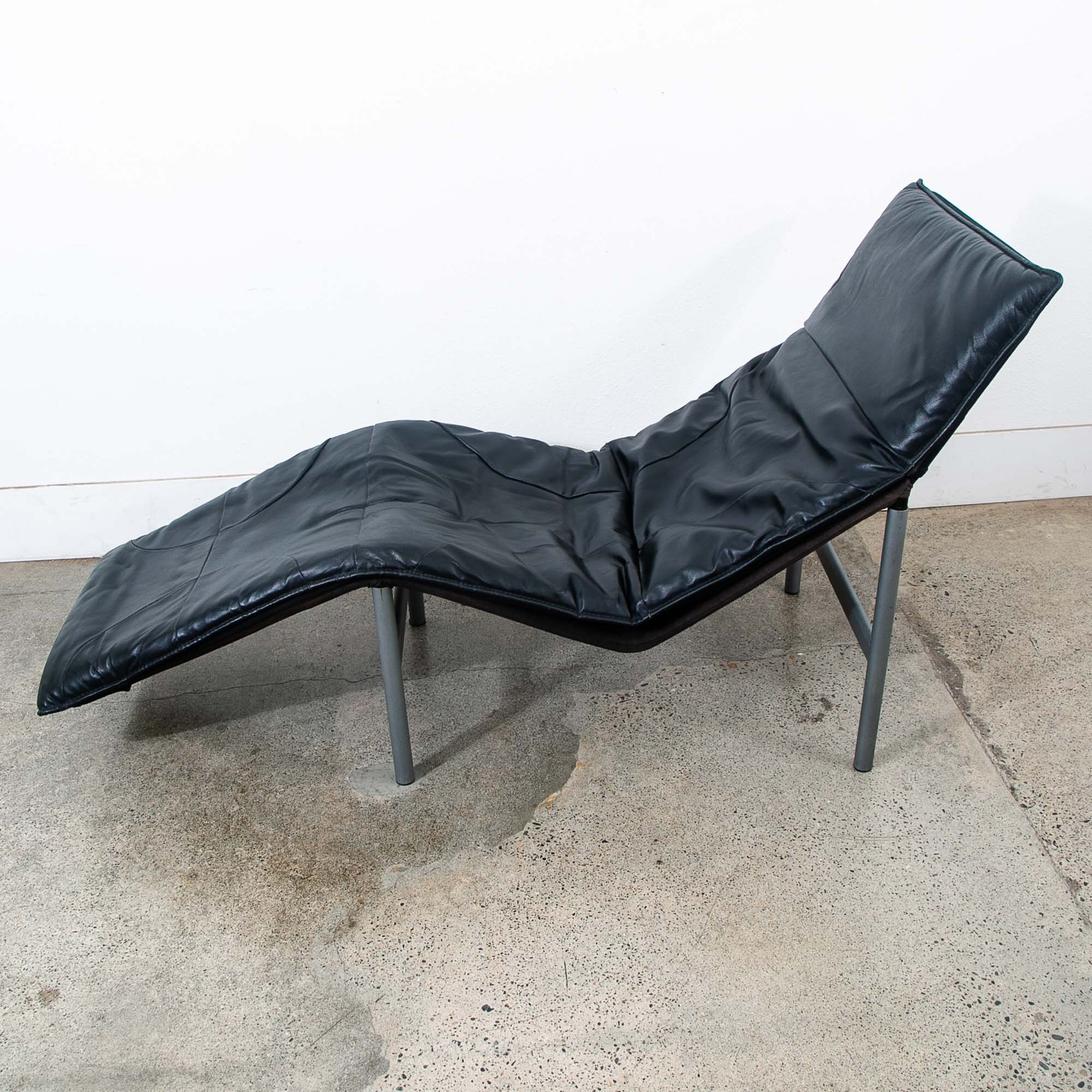 Equal parts comfort and style the "Skye" chaise lounge chair, designed by Tord Björklund and produced in Sweden in the 1970's, features a light-weight aluminum frame with soft black genuine leather. This visually captivating lounger will bring a minimalistic pop to its environment. Looks great with modern or post modern furniture or spaces. Unmarked example. Please see all photos to ensure you know what you are buying. We include FREE SHIPPING in the listing price. Some exceptions apply, so please read the full shipping details below.