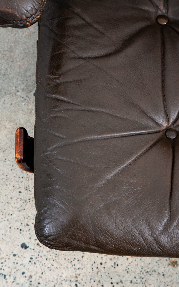Condition report: Near mint condition. No major rips or damage in leather or wood frames. lightly worn in leather throughout. Comfortable and functional. 9.5/10 condition. Sturdy and very solid. A fine example. Unsigned.