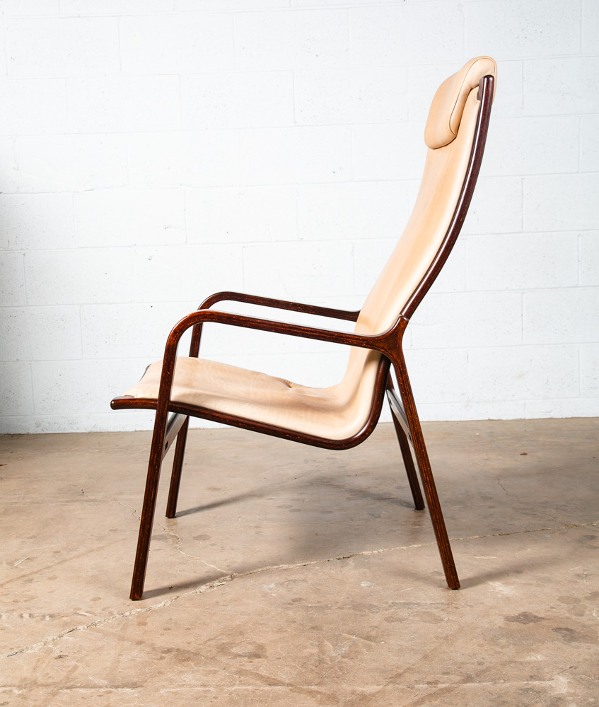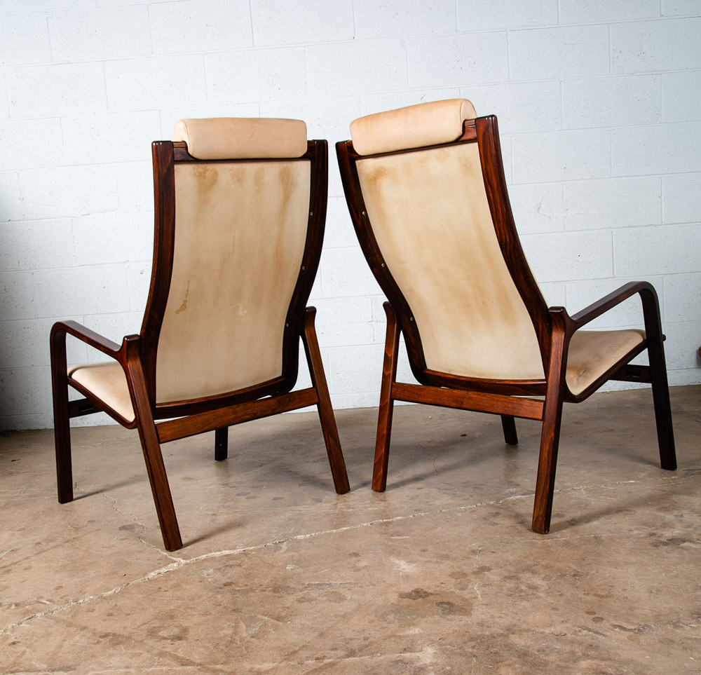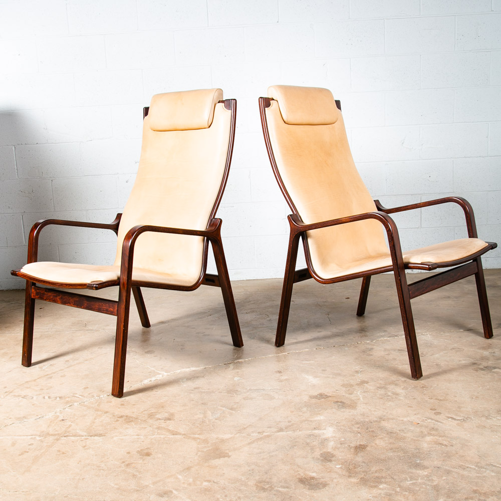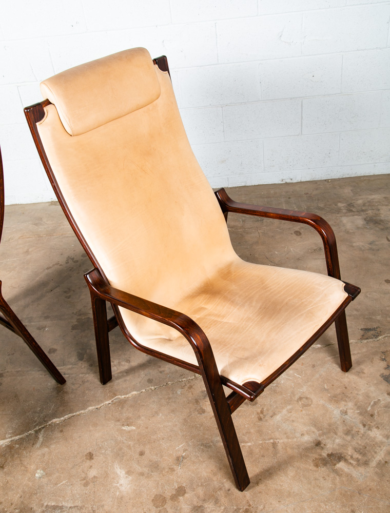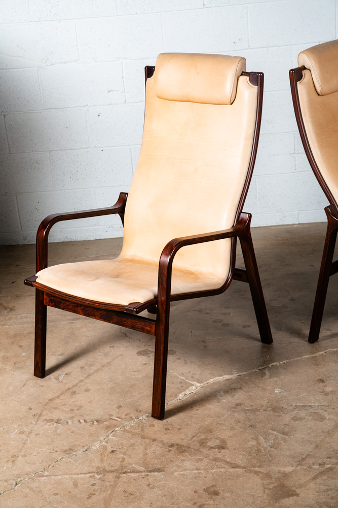 Unique bentwood Scandanavian armchairs / Lounge chairs in tan leather w/ headrest. The cushions sit attached to the frame. Well made and uniquely designed. Reminiscent of designs by Westnofa but potentially higher quality. The leather is very thick and top quality. Comfortable and well designed chairs. Please see all photos to ensure you know what you are buying. We include FREE SHIPPING in the listing price. Some exceptions apply, so please read the full shipping details below.
