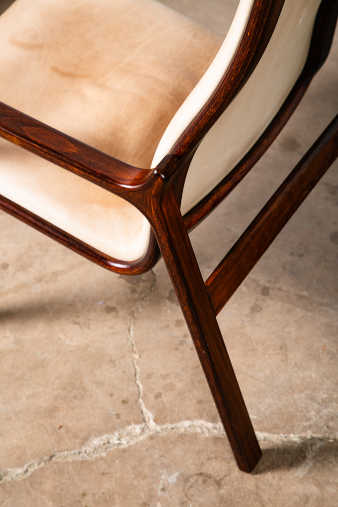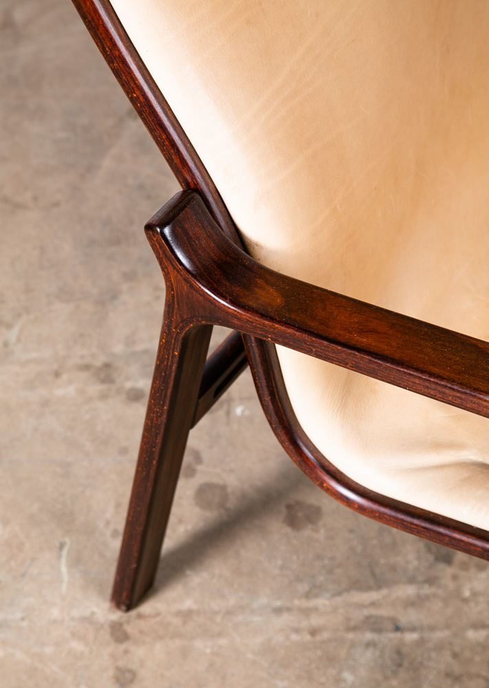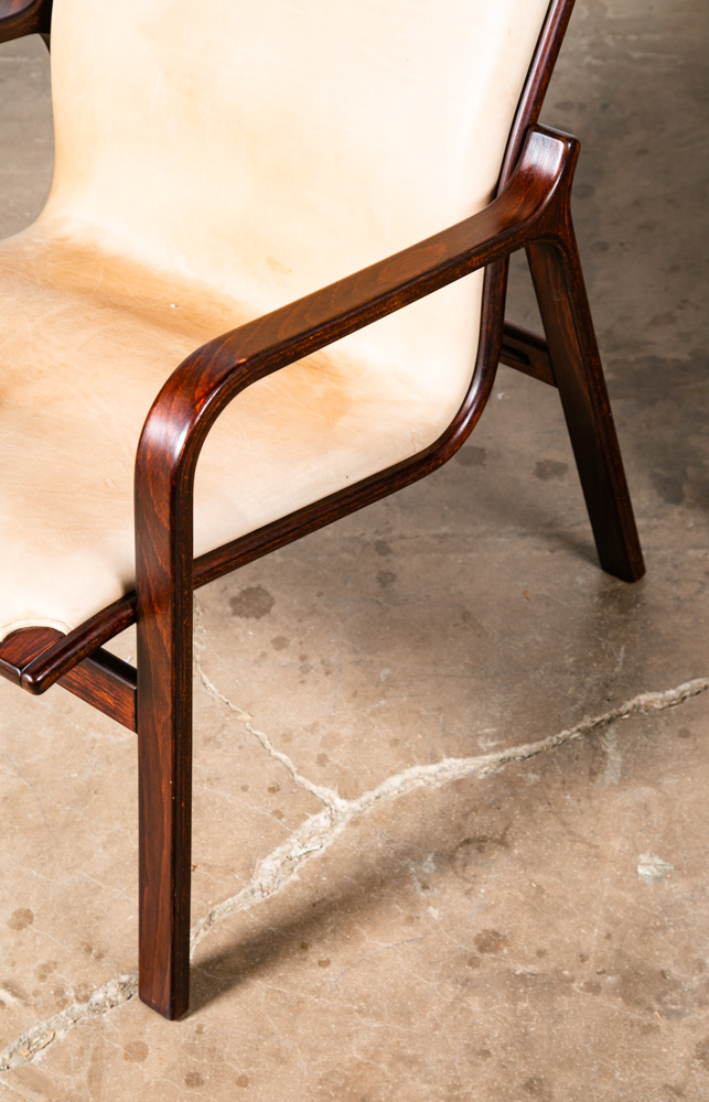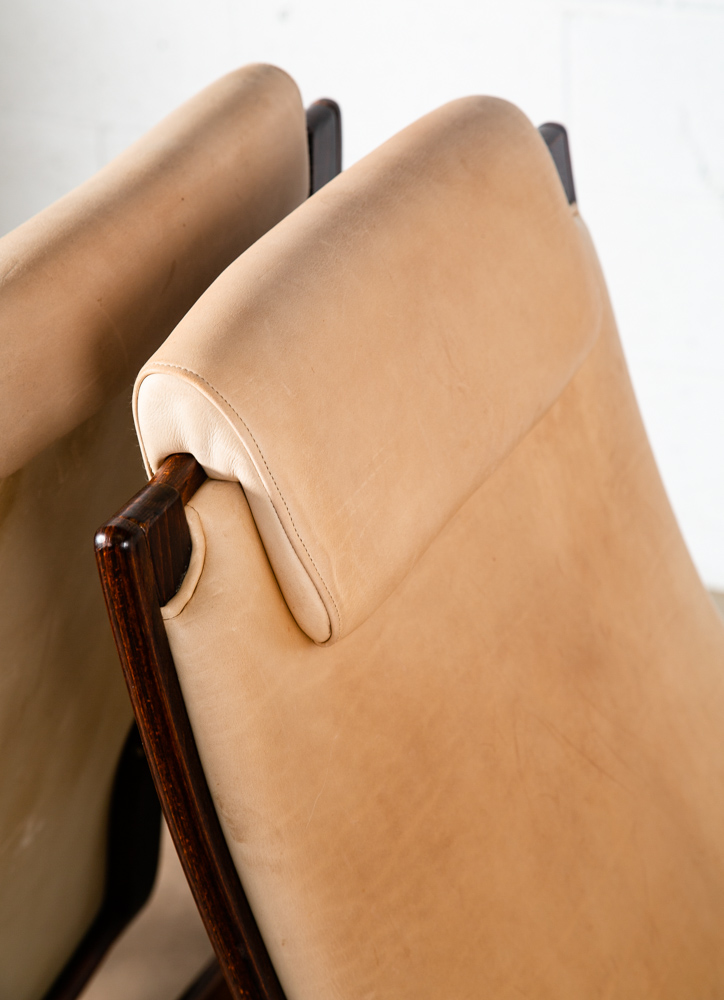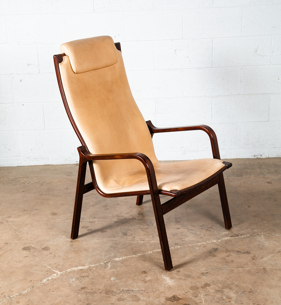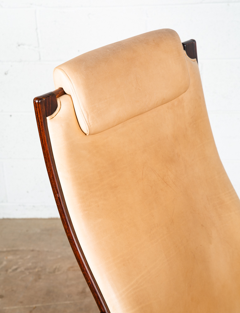 Unique bentwood Scandanavian armchairs / Lounge chairs in tan leather w/ headrest. The cushions sit attached to the frame. Well made and uniquely designed. Reminiscent of designs by Westnofa but potentially higher quality. The leather is very thick and top quality. Comfortable and well designed chairs. Please see all photos to ensure you know what you are buying. We include FREE SHIPPING in the listing price. Some exceptions apply, so please read the full shipping details below.