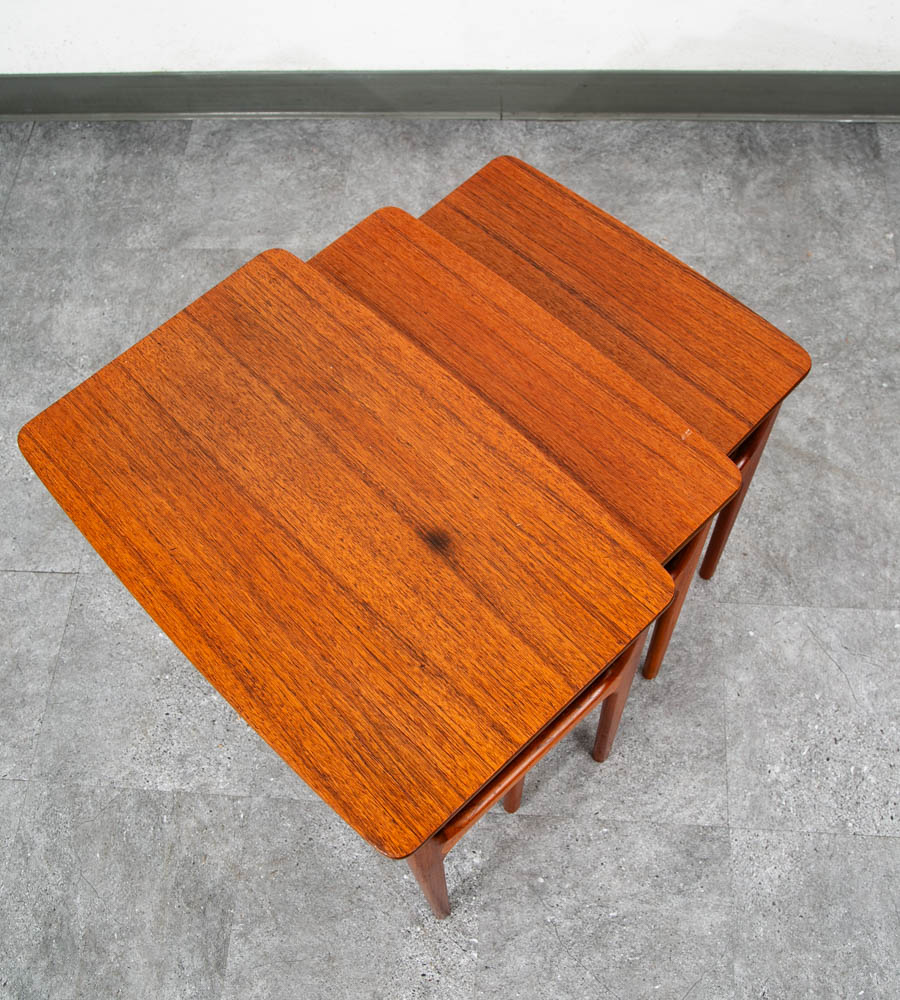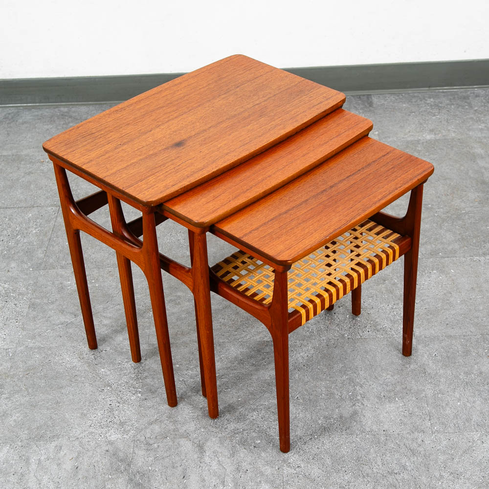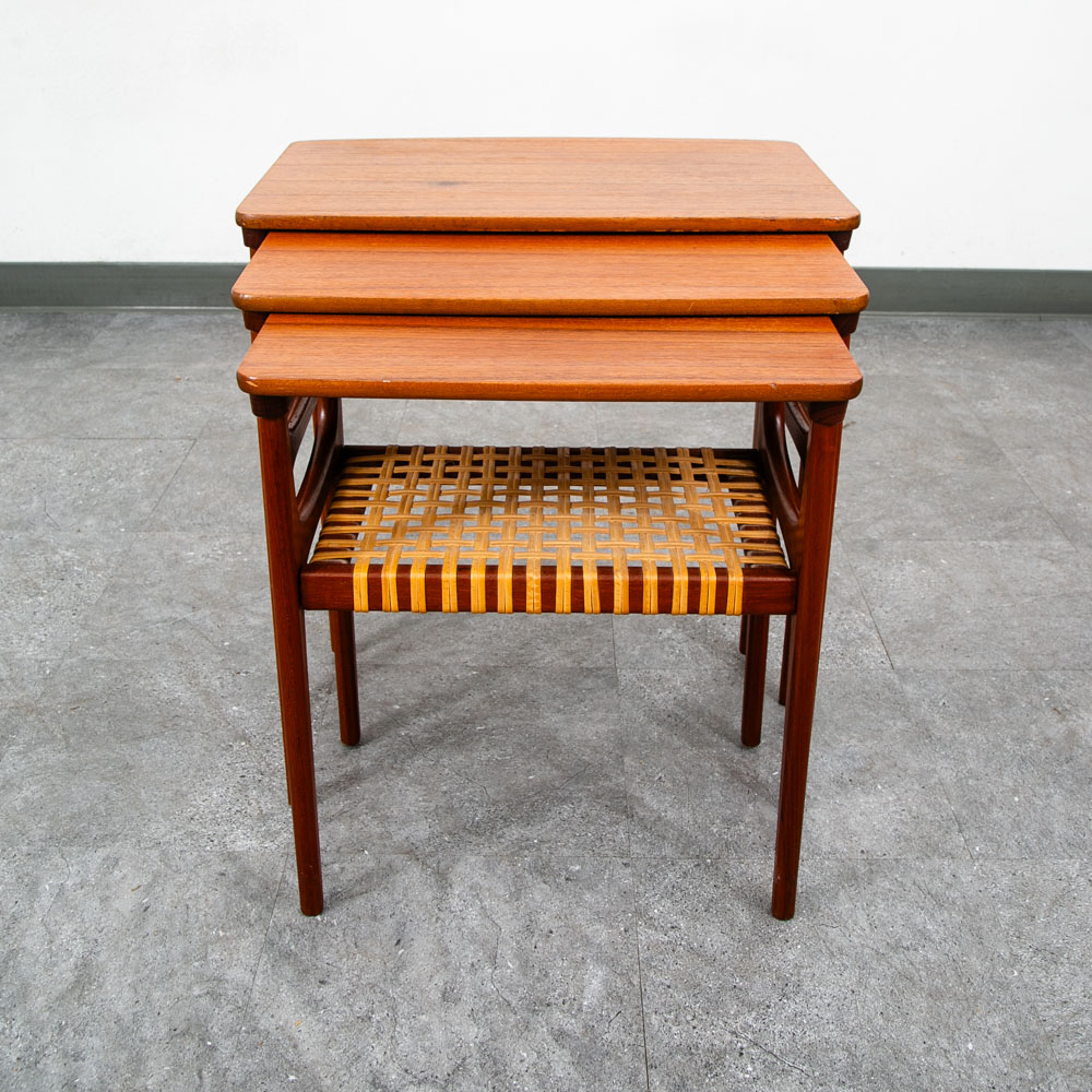 This set of three teak tables were recently refinished and are now available. The tables are made of solid teak and teak veneer and the two smaller tables slide under the main table for storage. The smallest table offers a cane shelf beneath. The tables are stamped and comes with the danish control stamp. This clever design means that the table set can be stored as one unit and can therefore be easily moved to any area of your home as required. Each table slides into the larger one. We include FREE SHIPPING in the listing price. Some exceptions apply, so please read the full shipping details below.