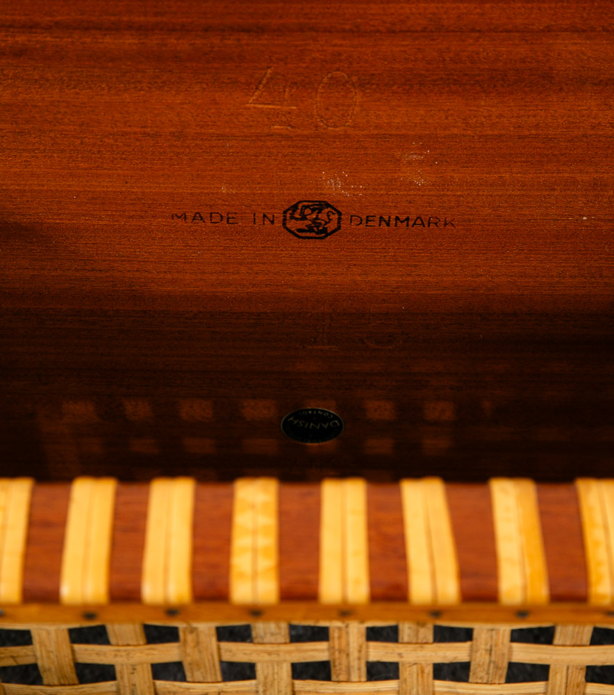 Condition report: refinished condition. Top surface has one small dark area, otherwise mint condition. Slides together nicely and as intended. teak frames are structurally sound as well as the cane intact. stamped examples. 8.5/10 condition rating.