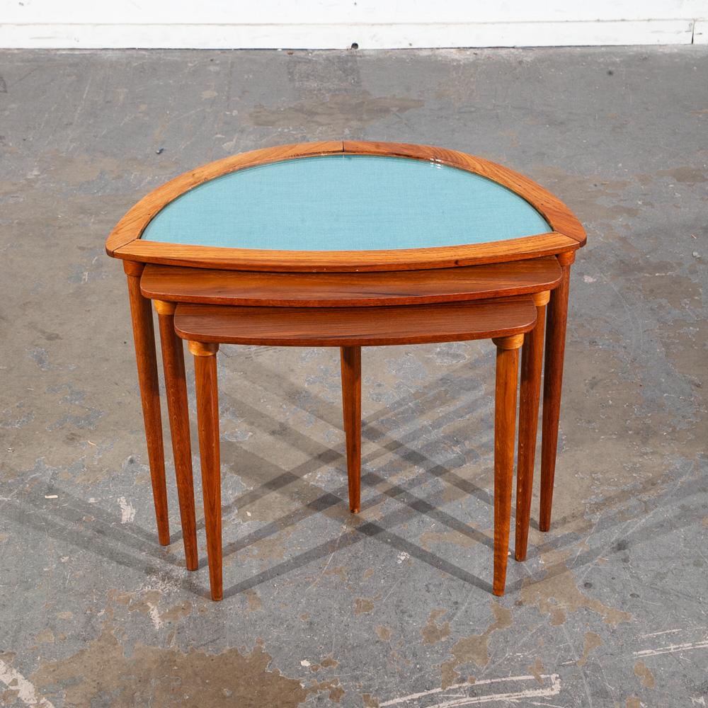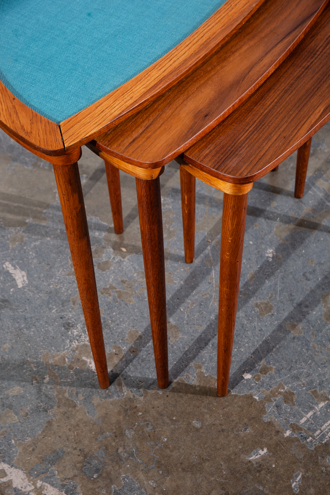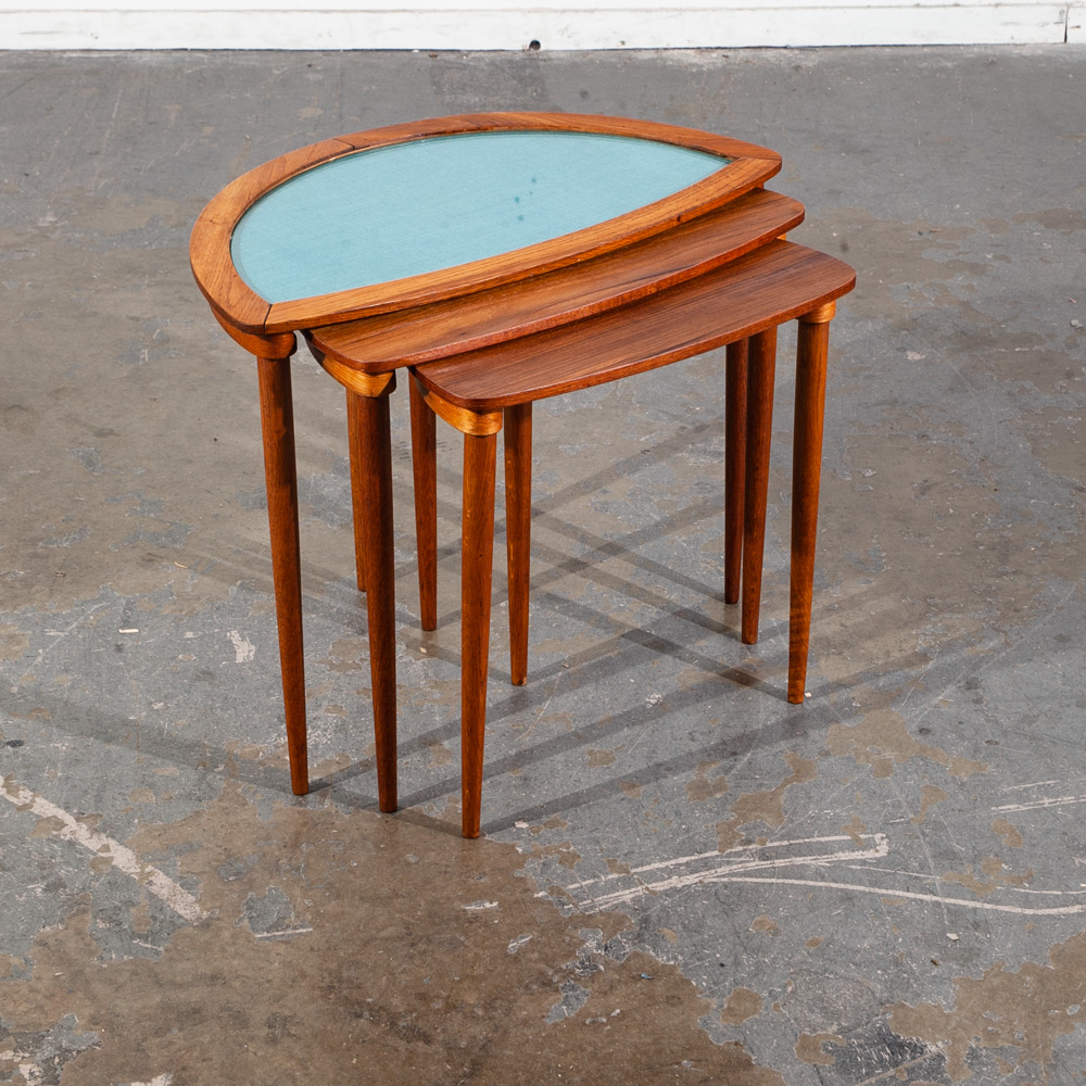 Unique Danish modern Teak and oak restored nesting table set. The top table offers a glass surface over teak fabric while the other 2 tables offer teak surfaces. Each table collapses into the next larger one. each table has 3 oak legs. Unknown maker or designer. This piece was imported directly from Denmark in our latest shipment and was restored in house.