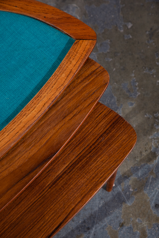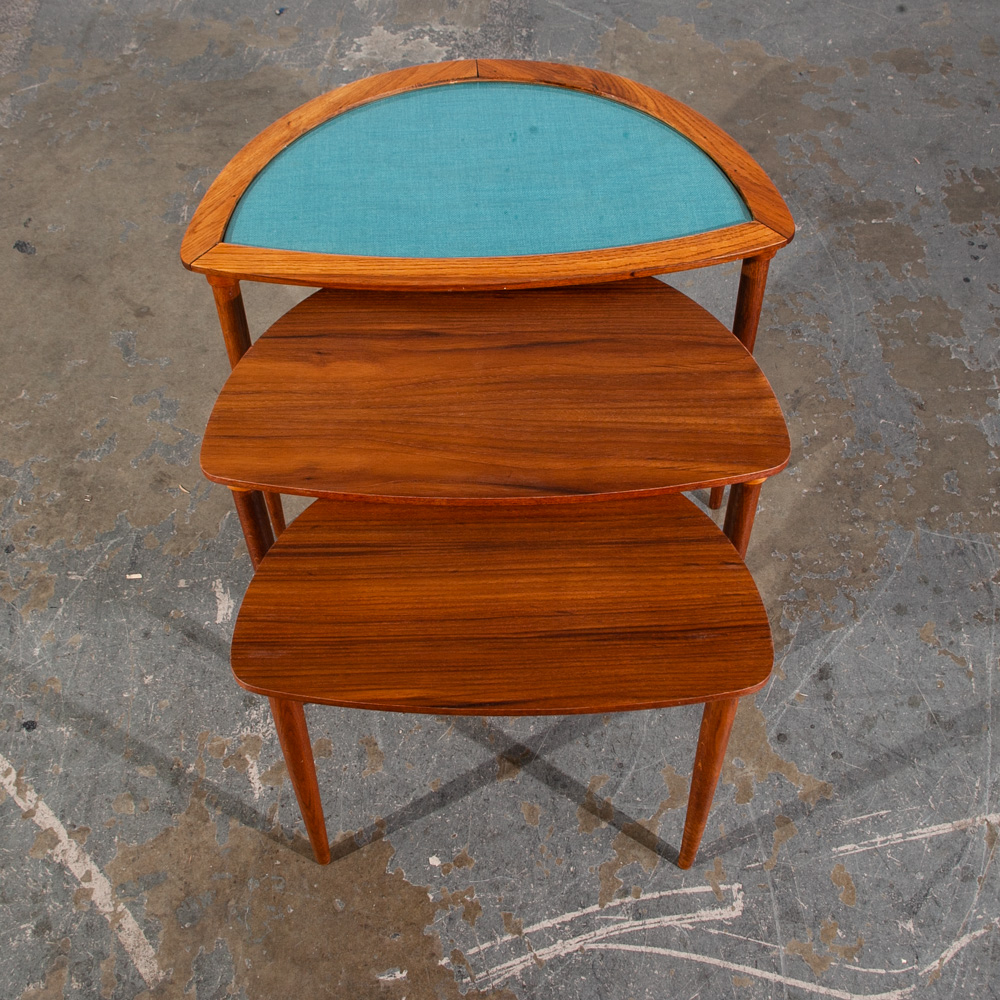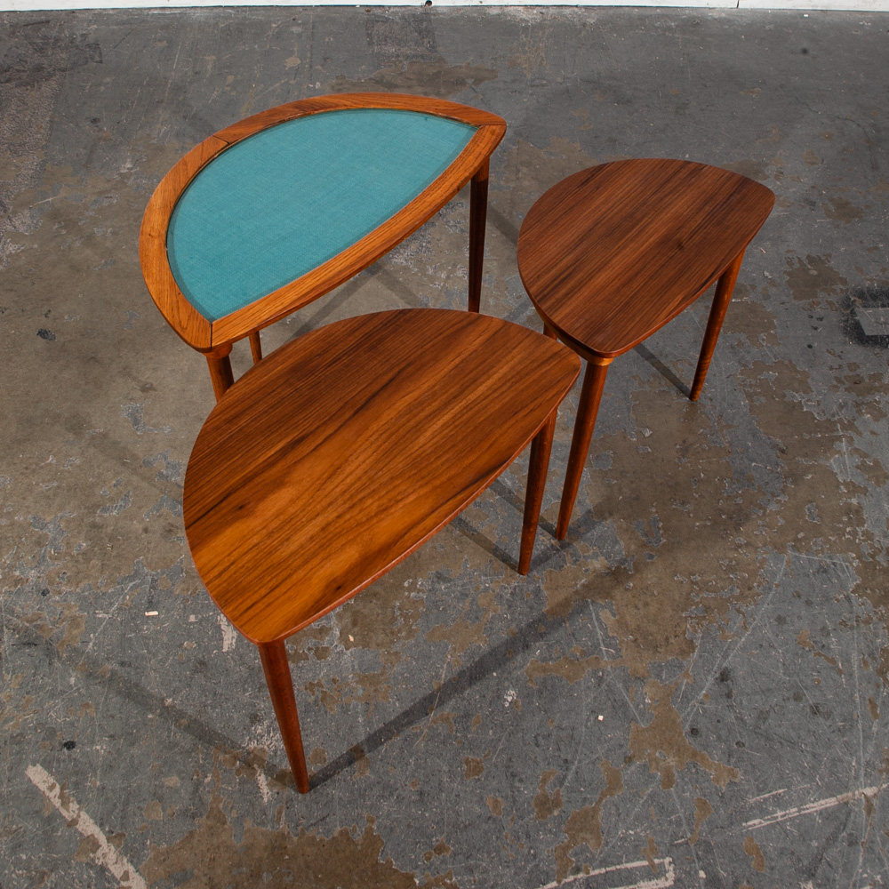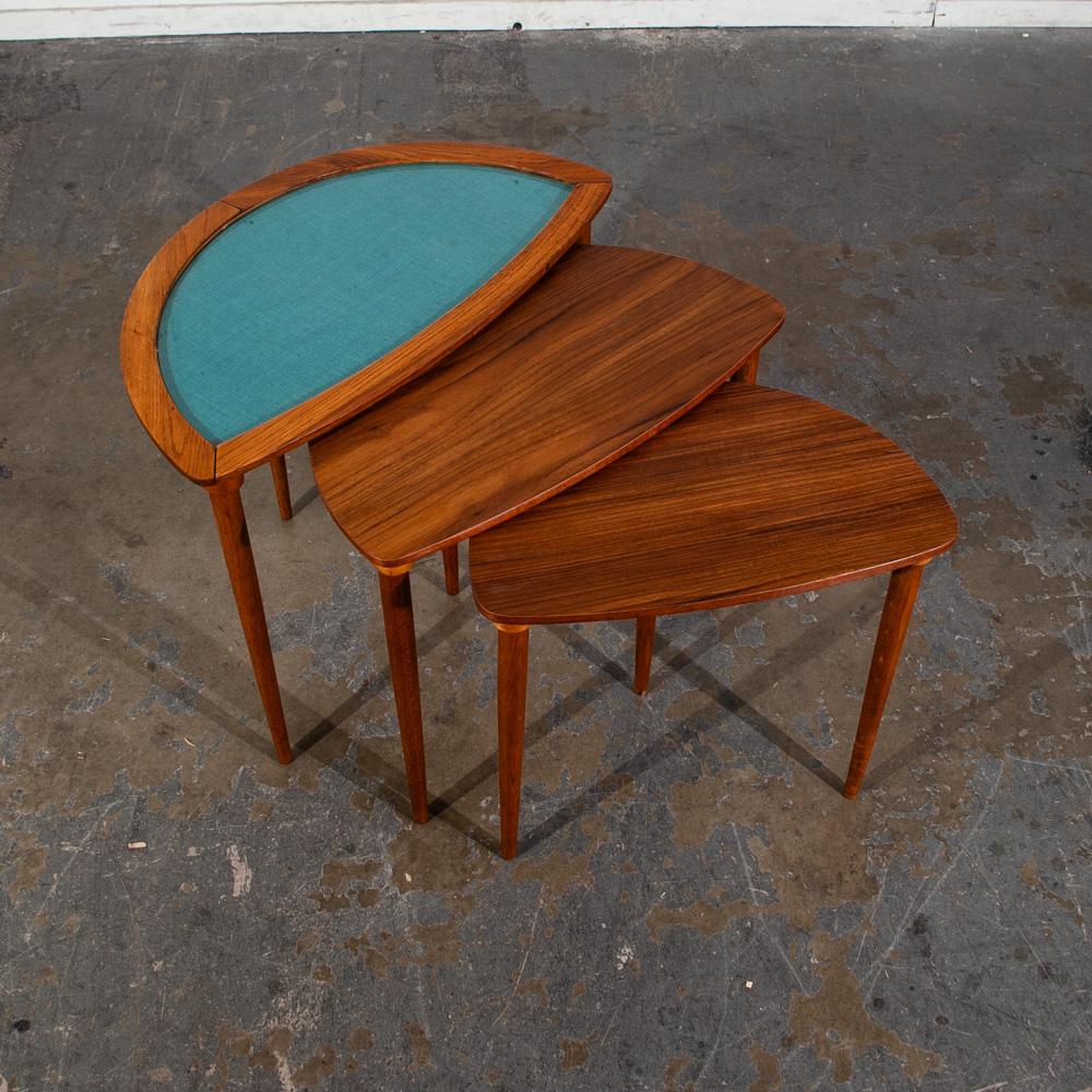 Unique Danish modern Teak and oak restored nesting table set. The top table offers a glass surface over teak fabric while the other 2 tables offer teak surfaces. Each table collapses into the next larger one. each table has 3 oak legs. Unknown maker or designer. This piece was imported directly from Denmark in our latest shipment and was restored in house.