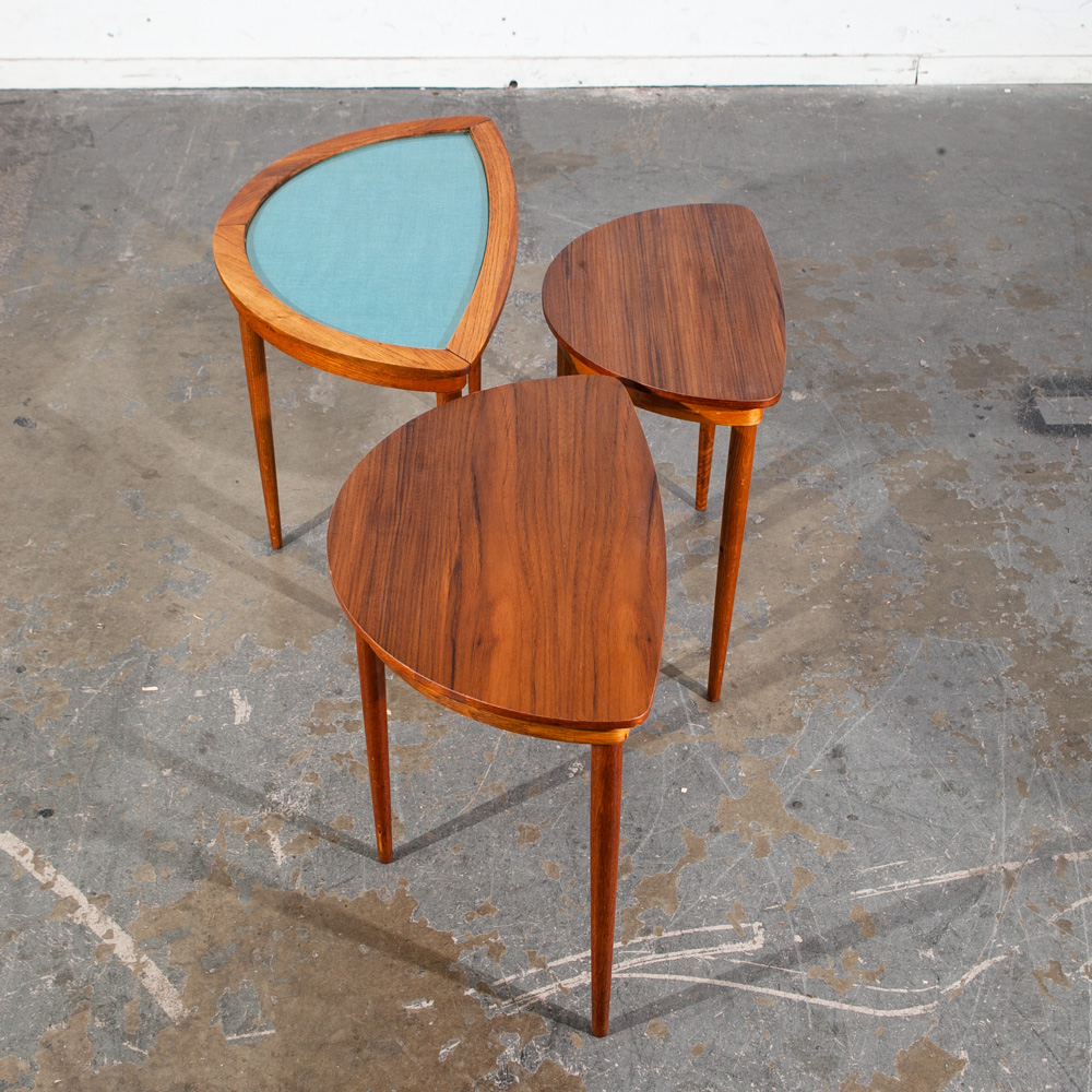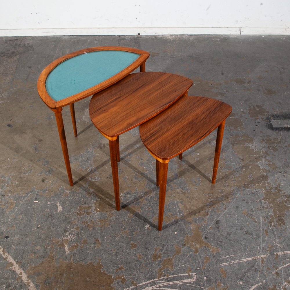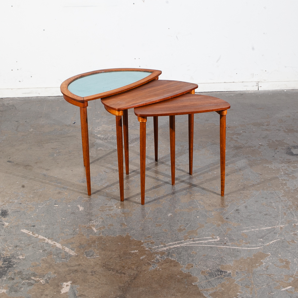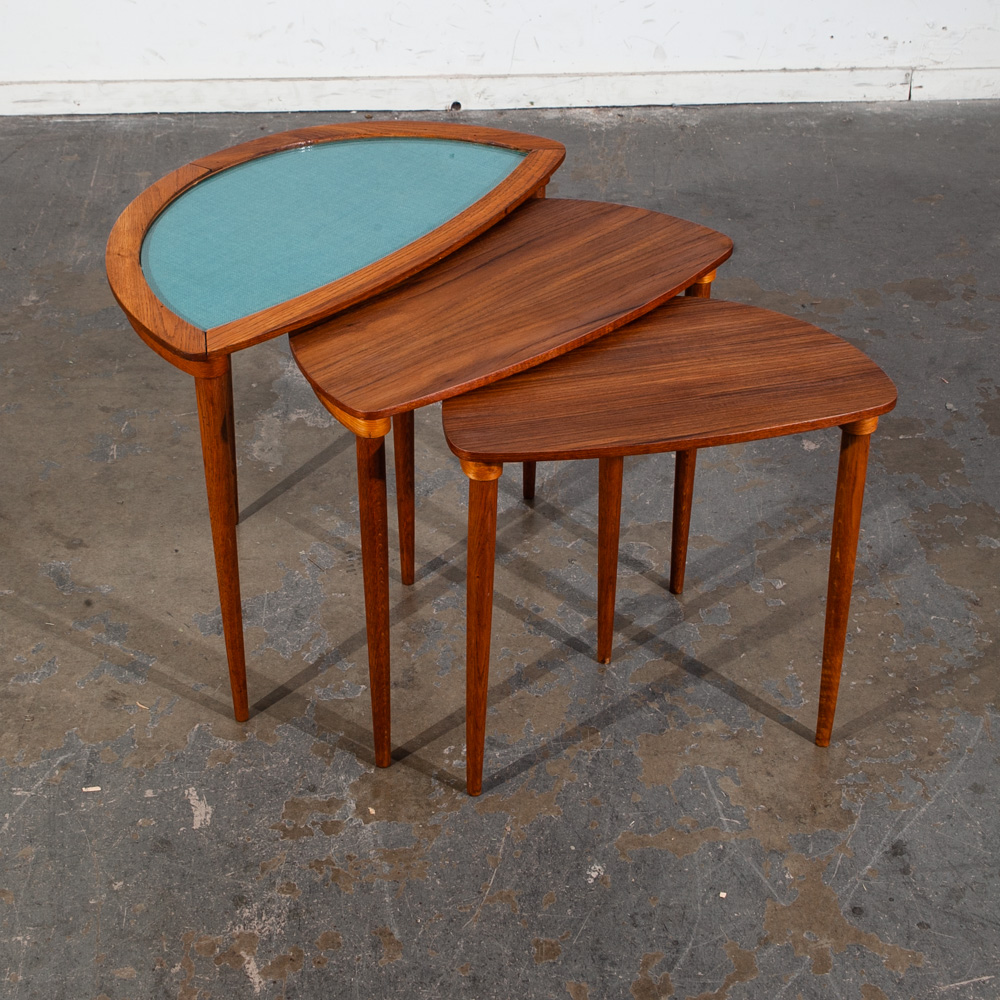 Condition report: Very good condition. The pieces have been fully restored and new glass installed. Structurally sound. The tables slide into each other easily. unstamped examples. 9.5/10 condition rating.