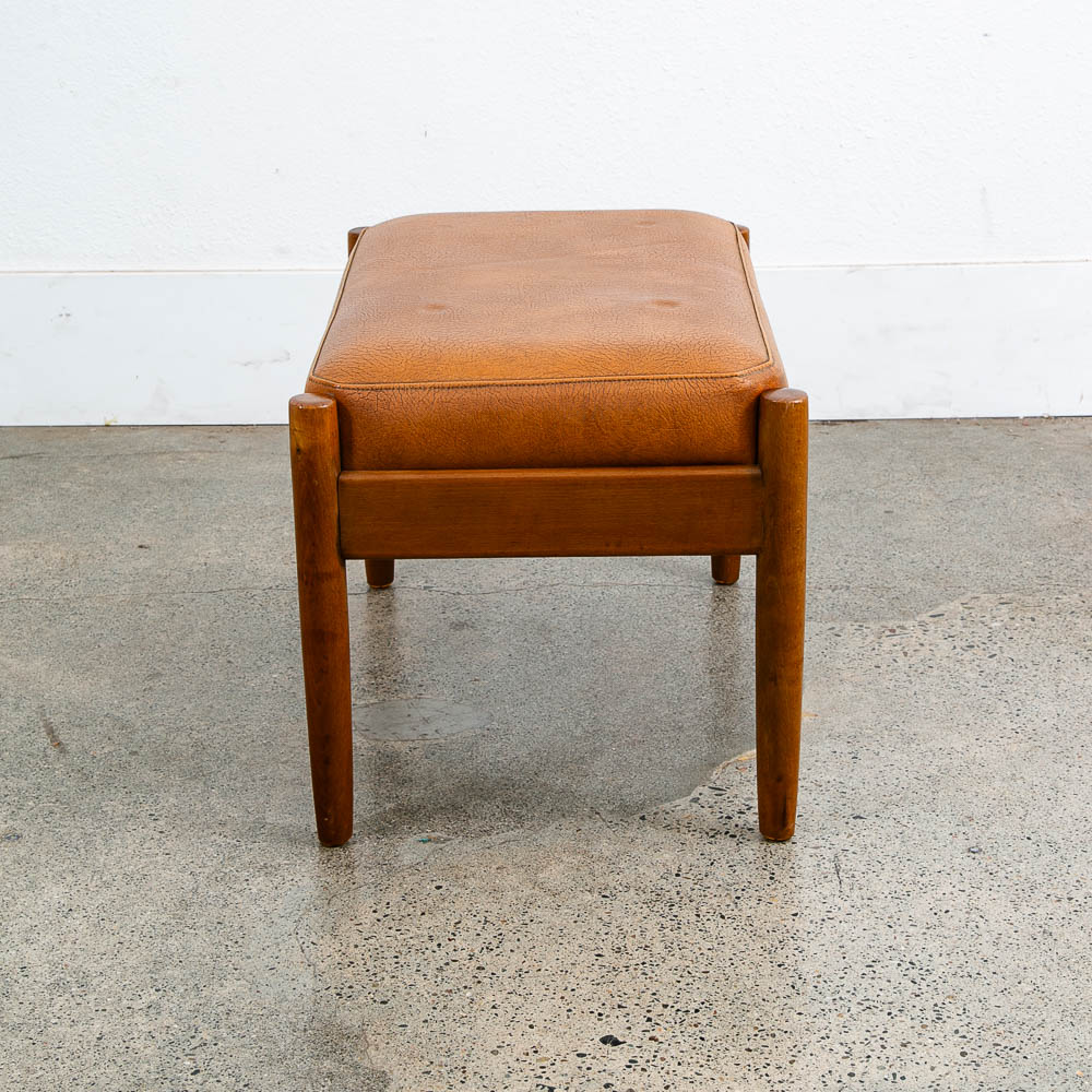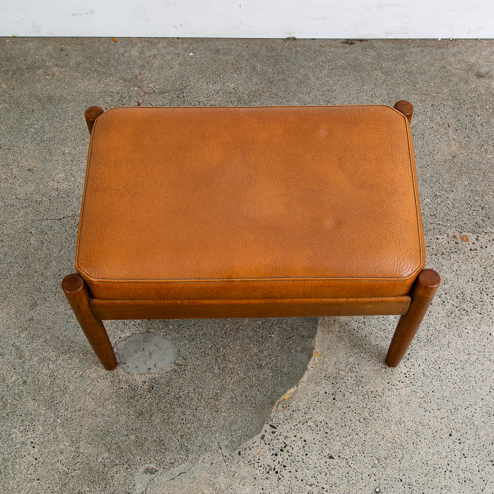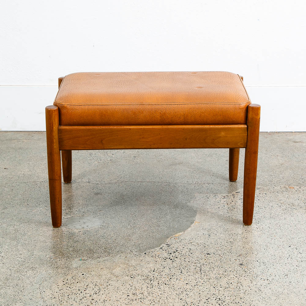 Tan leather and wood ottoman. Recently imported from Denmark. We include FREE SHIPPING in the listing price. Some exceptions apply, so please read the full shipping details below.