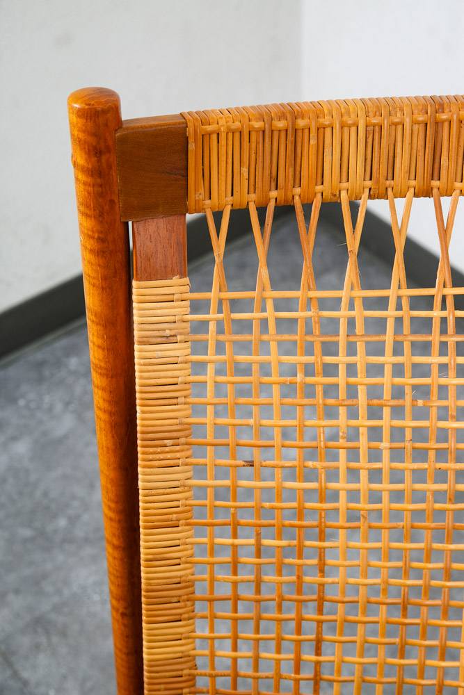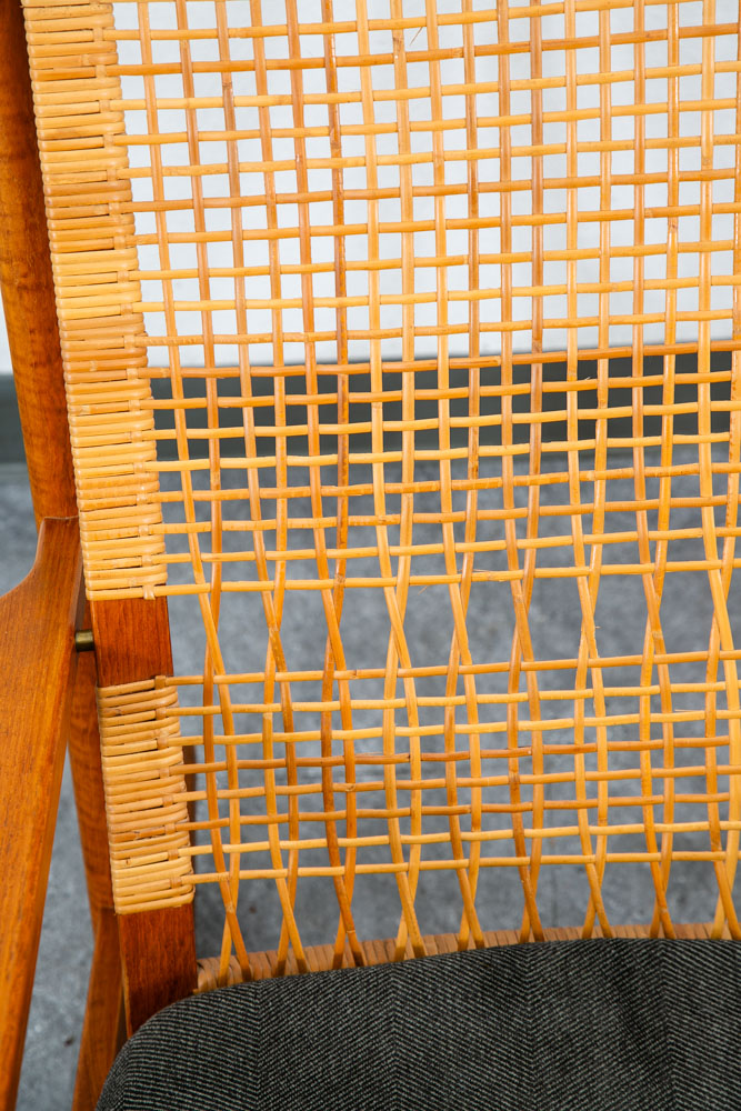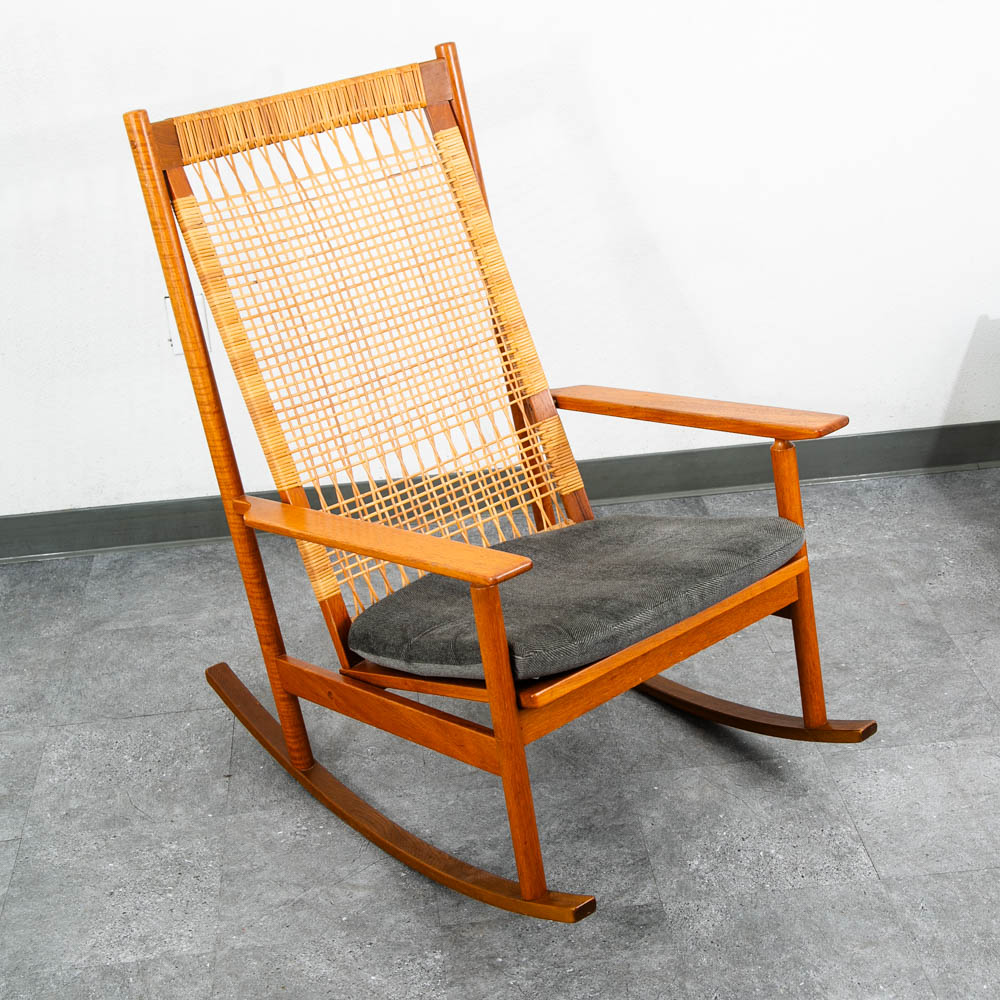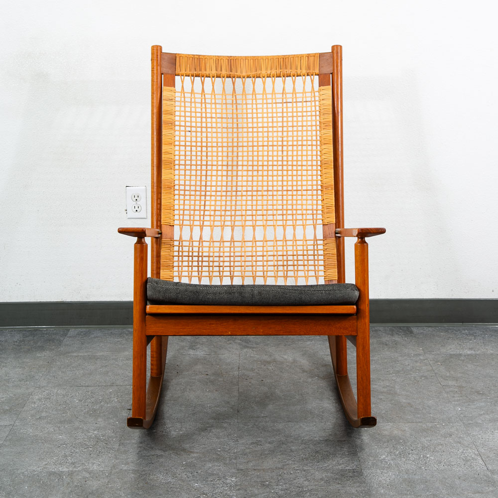 Denmark, ca. 1950s. An elegant rocking chair by Hans Olsen for Juul Kristensen. Features a solid teak frame with straight beveled arms and high caned back. Reversible seat cushion was upholstered in a handsome grey velvet style fabric. Accommodating – yet visually light – this chair would be a welcome addition to any nursery, bedroom, or den. Please see all photos to ensure you know what you are buying. We include FREE SHIPPING in the listing price. Some exceptions apply, so please read the full shipping details below.