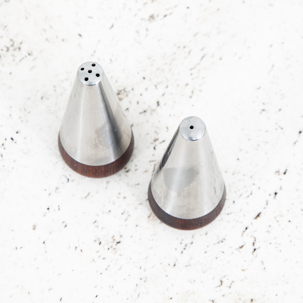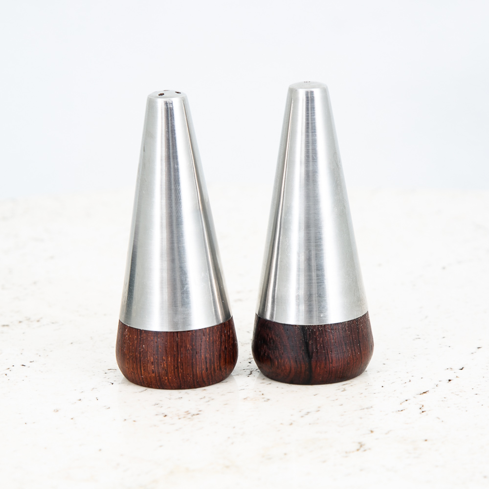 Unique Danish Rosewood and Stainless steel salt and pepper shakers. Well made pieces that are signed beneath. Great example of a unique mid century modern Salt and pepper Set. We include FREE SHIPPING in the listing price. Some exceptions apply, so please read the full shipping details below.