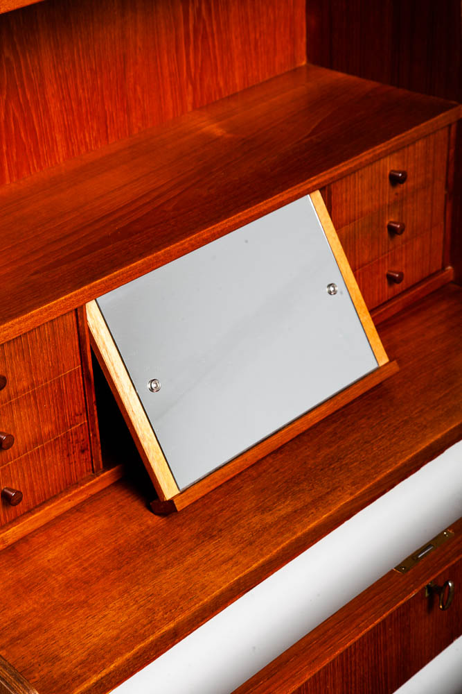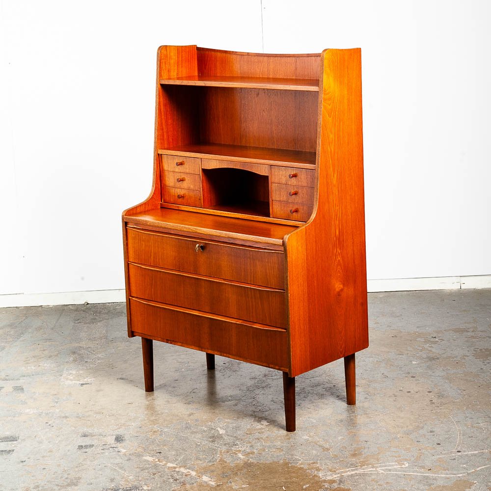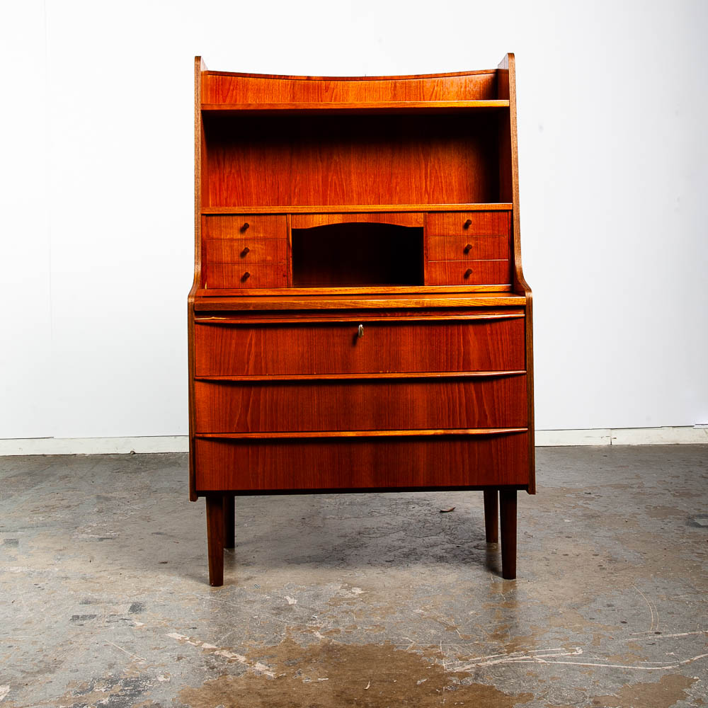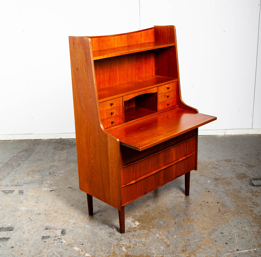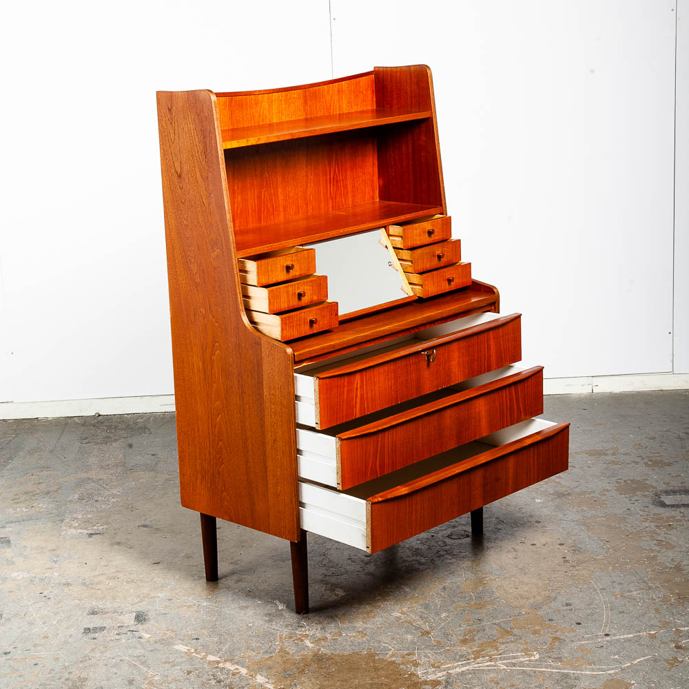 Vintage Danish modern bureau from the 1960s-1970s – a classic Danish design. A exceptional form finished with teak veneer while the structure is built with solid teak wood.. The secretary has a slide out writing desk, 9 practical drawers and one area in the top center for a drop down menu. The sculpted legs and elegant style really make this piece stand out from the crowd. At the top, the mirror slides out from between the drawers. To see the rest of the items we imported from Europe, see our store and other listings. Please see all photos to ensure you know what you are buying.