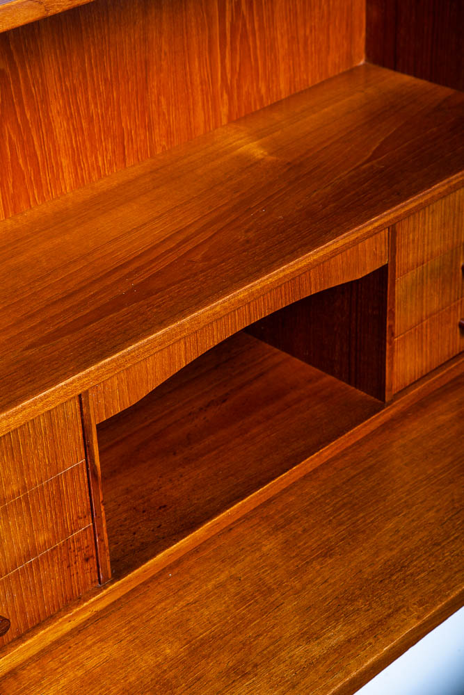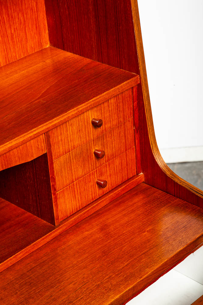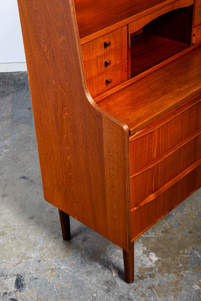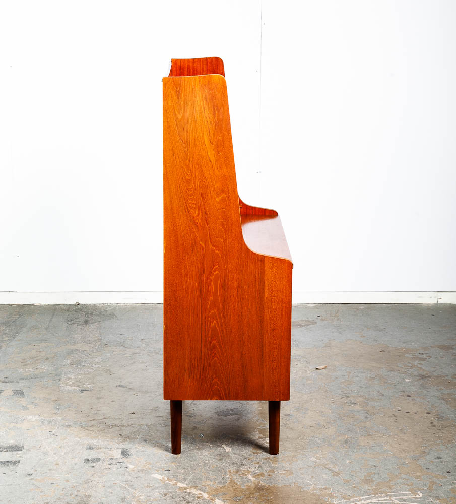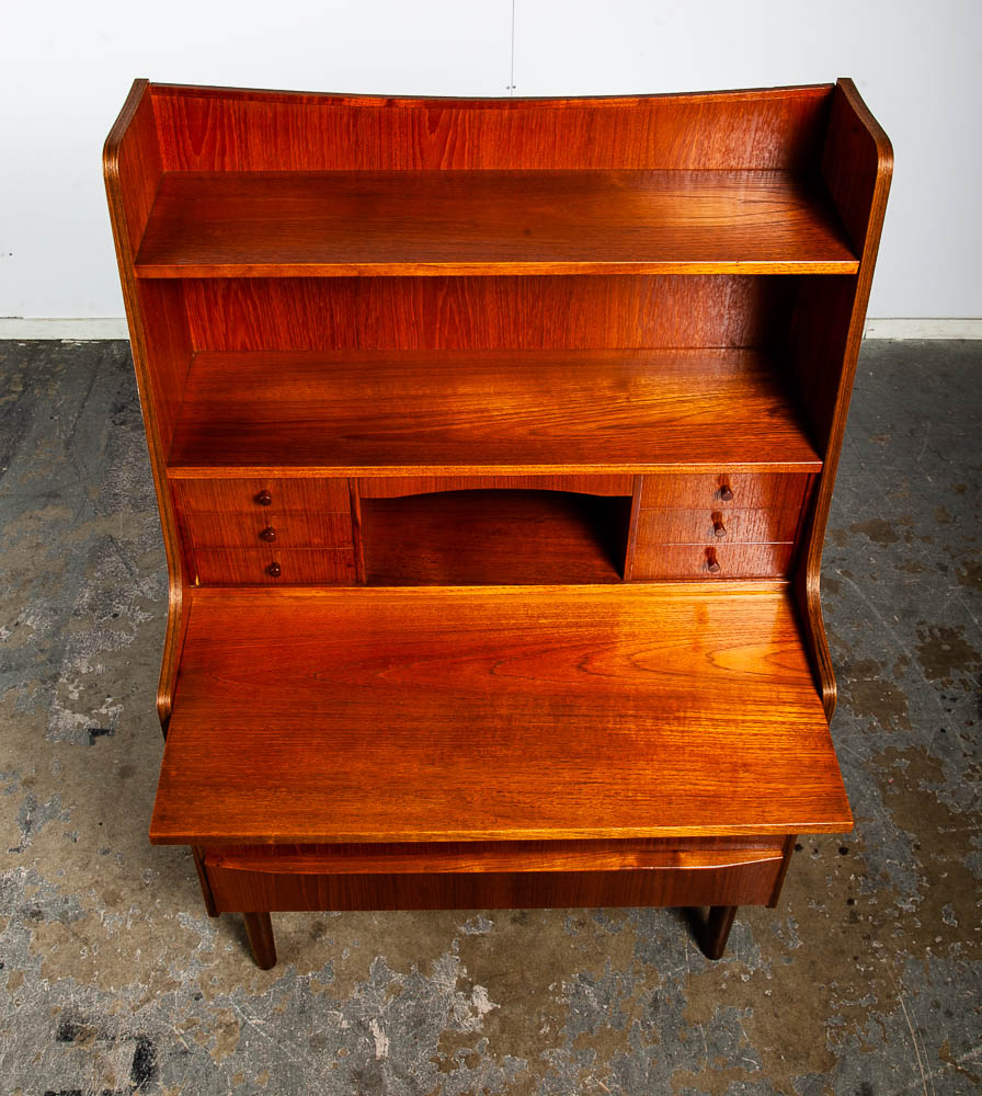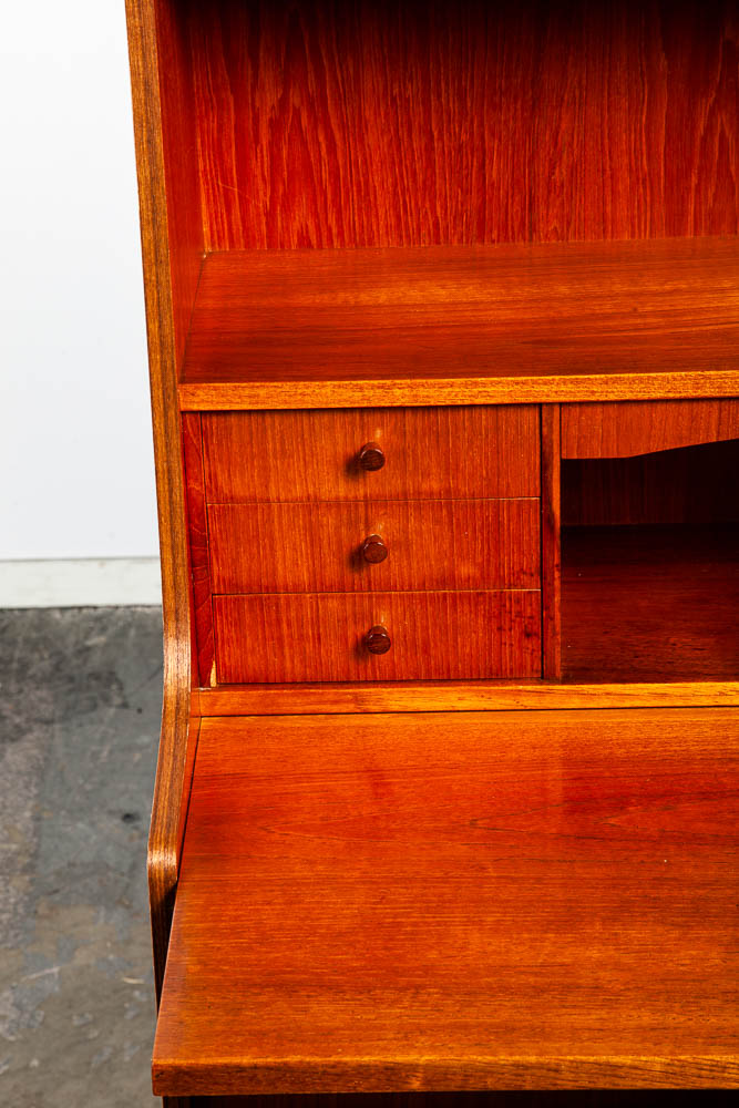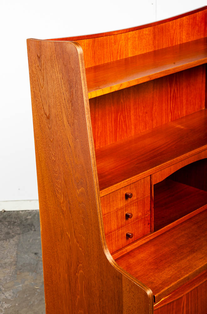 Vintage Danish modern bureau from the 1960s-1970s – a classic Danish design. A exceptional form finished with teak veneer while the structure is built with solid teak wood.. The secretary has a slide out writing desk, 9 practical drawers and one area in the top center for a drop down menu. The sculpted legs and elegant style really make this piece stand out from the crowd. At the top, the mirror slides out from between the drawers. To see the rest of the items we imported from Europe, see our store and other listings. Please see all photos to ensure you know what you are buying.