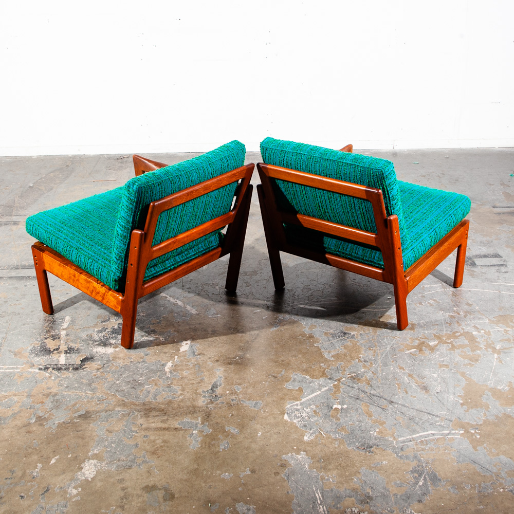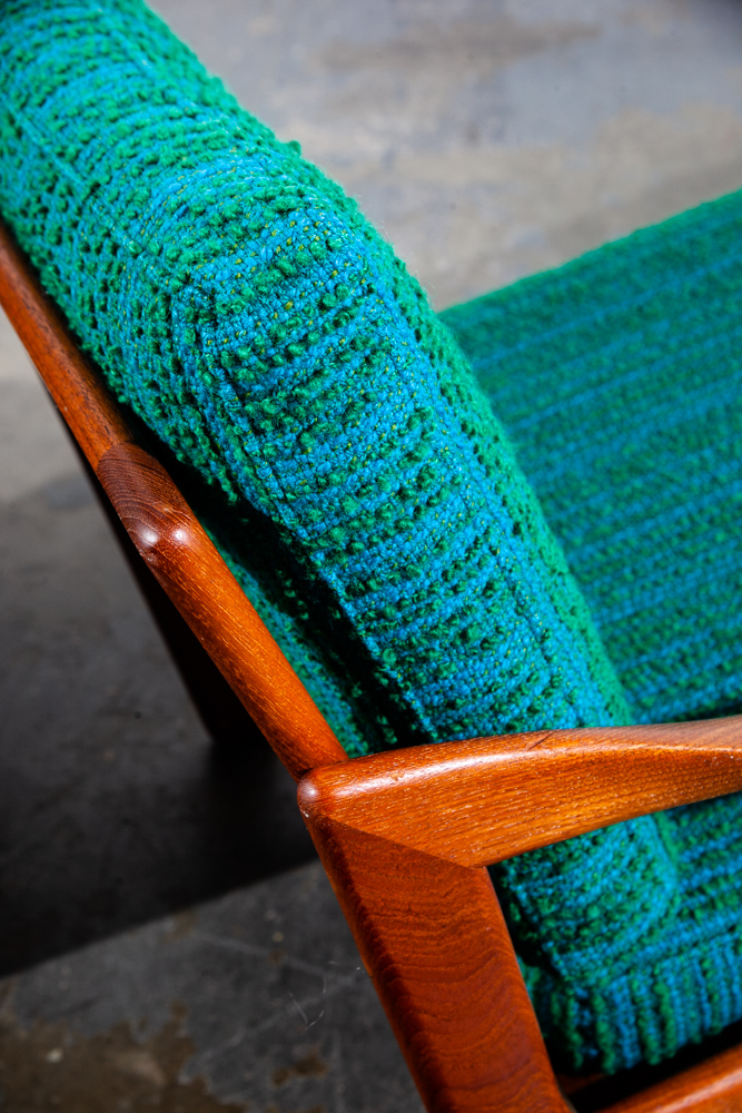 Very high quality Danish Settee by Illum Wikkelso for N. Eilersen in solid teak and nubby aqua colored fabric. Each piece is modular and can be used around the room separately. When used together they are used with dowels in the center. This piece is made in the highest quality and materials. Illum Wikkelso is an iconic danish designer from the 60s era. Very functional and usable item. Stamped beneath with the makers stamp as well as the danish control stamp. Please see all photos to ensure you know what you are buying. We include FREE SHIPPING in the listing price. Some exceptions apply, so please read the full shipping details below.