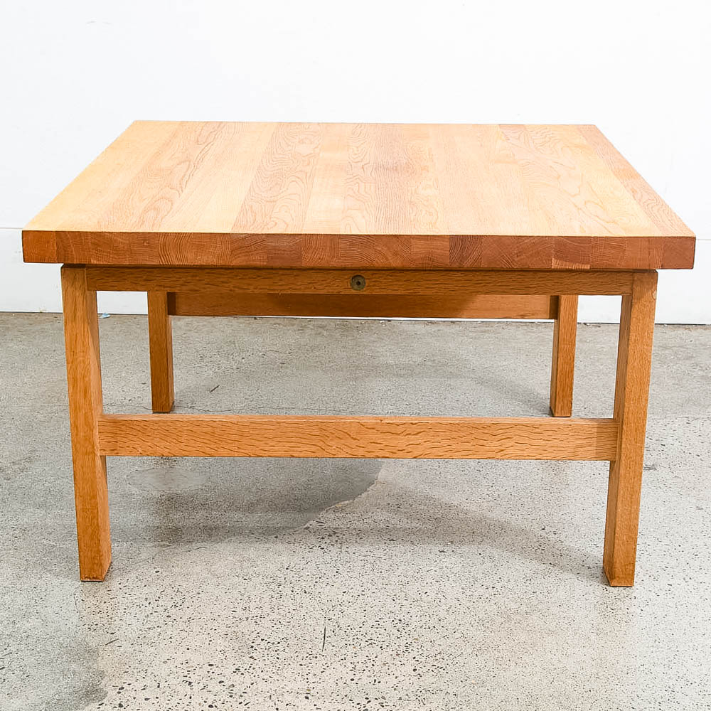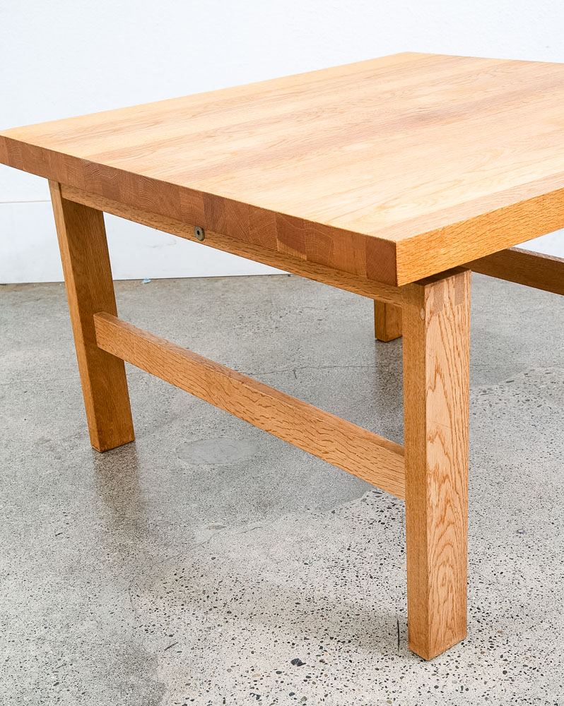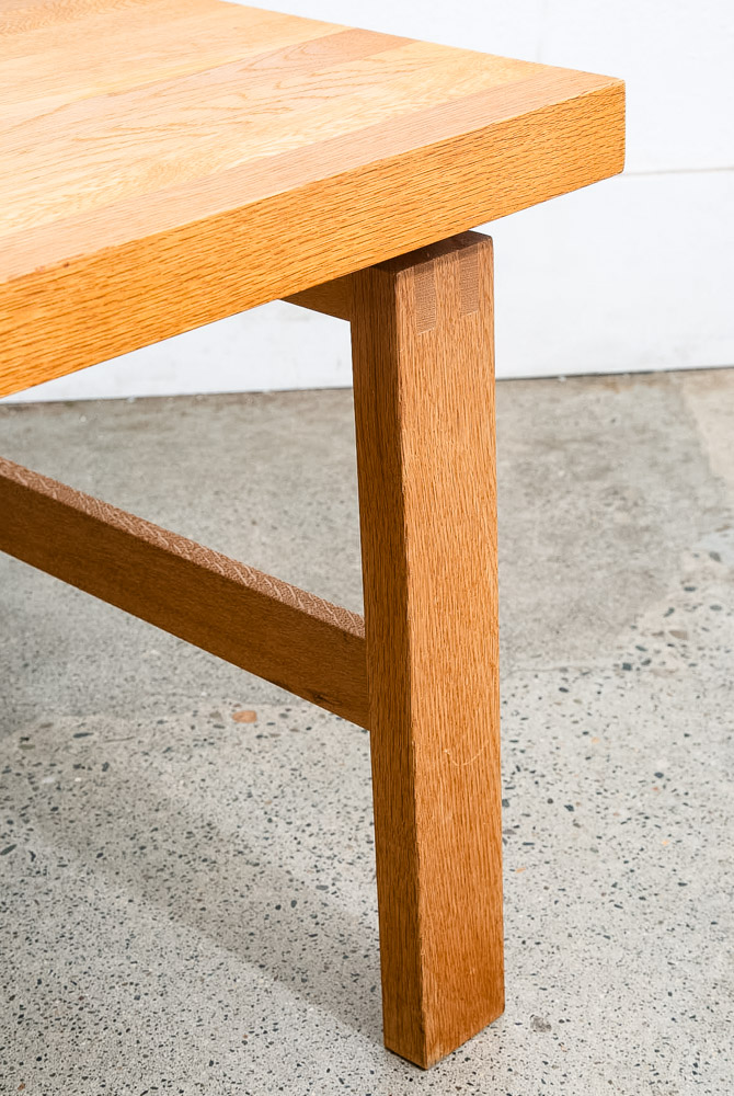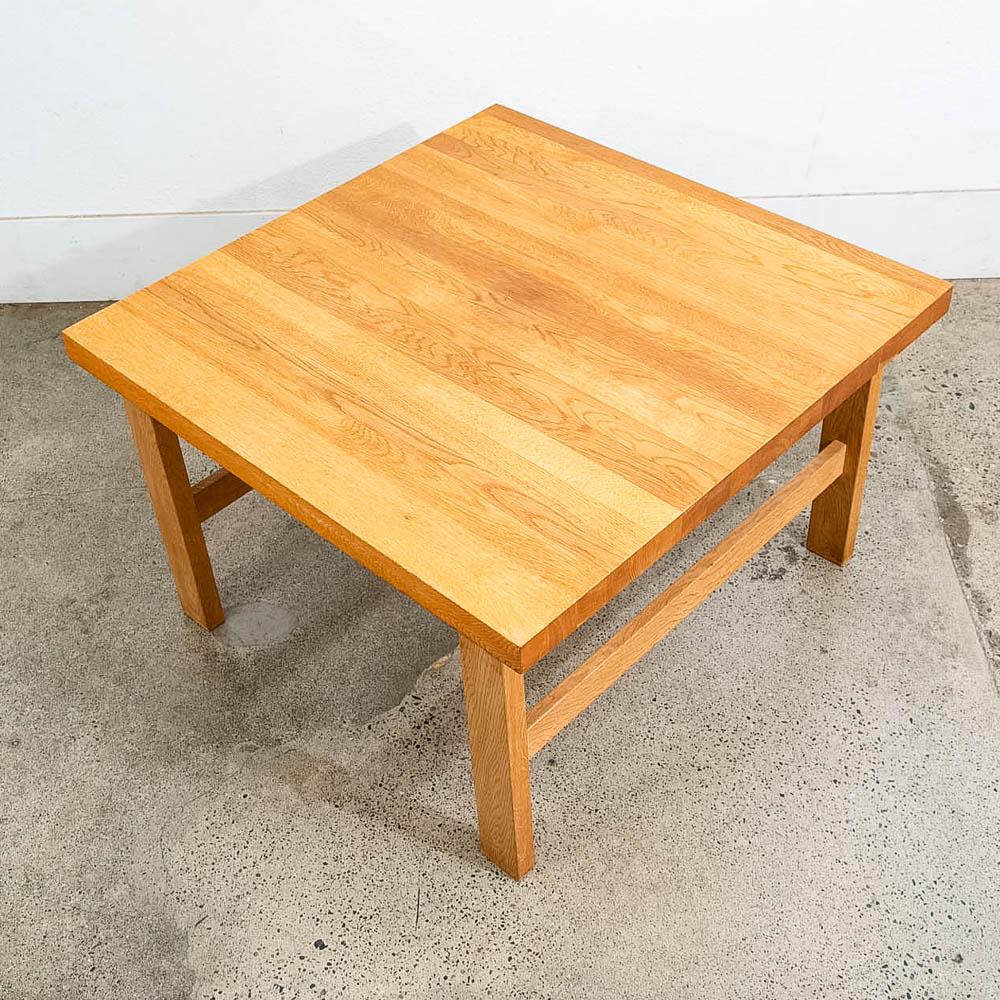 Unique and well constructed low Danish modern oak coffee table or large side table. Comes in Solid planked white oak. The piece offers unique finger jointed legs. A fine example. We restored and refinished the piece throughout. A few minor wear areas still exist but overall in very good shape. We include FREE SHIPPING in the listing price. Some exceptions apply, so please read the full shipping details below.