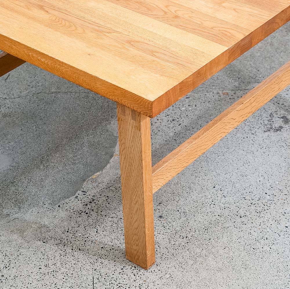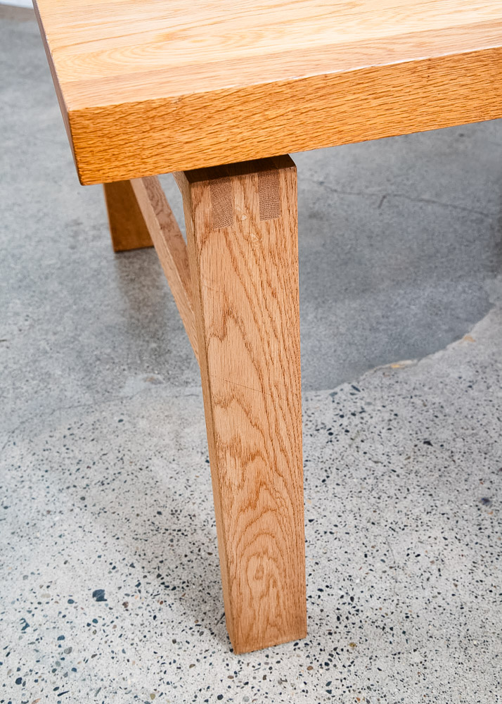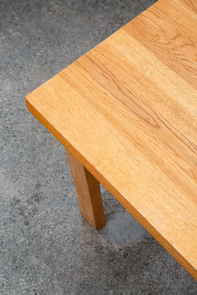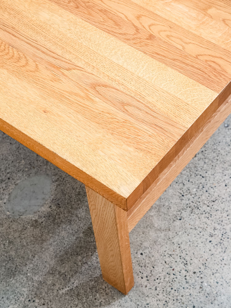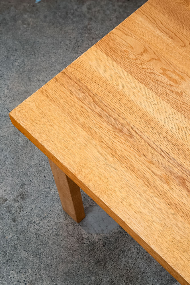 Unique and well constructed low Danish modern oak coffee table or large side table. Comes in Solid planked white oak. The piece offers unique finger jointed legs. A fine example. We restored and refinished the piece throughout. A few minor wear areas still exist but overall in very good shape. We include FREE SHIPPING in the listing price. Some exceptions apply, so please read the full shipping details below.
