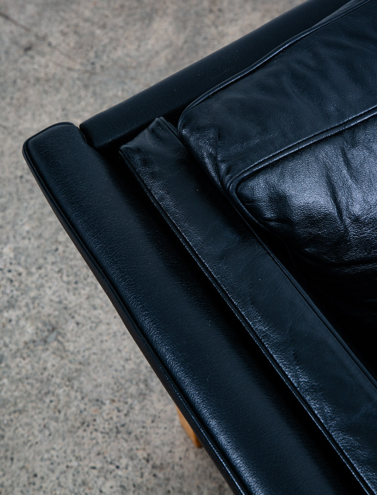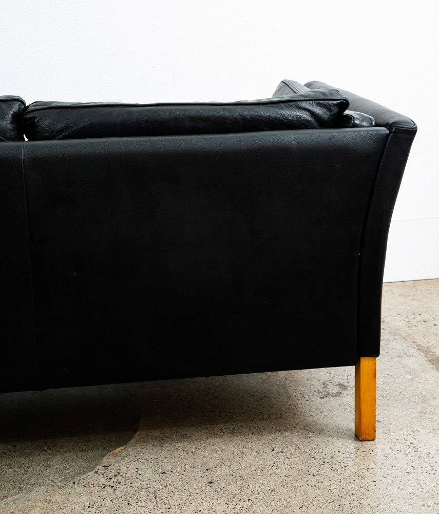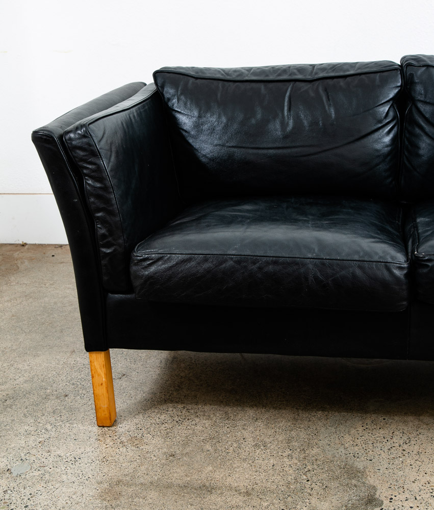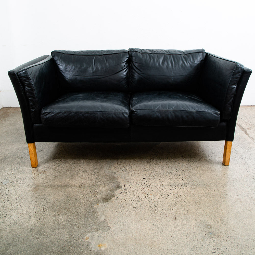 High quality early black leather Danish modern 2 seater sofa / couch .This piece was imported directly from Denmark in our latest shipment. This piece is perfect for the person desiring a high quality and well constructed black leather sofa that is lightly worn in. The leather cushions sit within the solid beech wood frame. Outstanding quality. Great place to hang out and relax. Please see all photos to ensure you know what you are buying. We include FREE SHIPPING in the listing price. Some exceptions apply, so please read the full shipping details below.