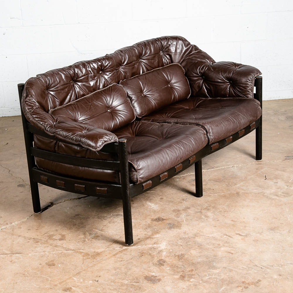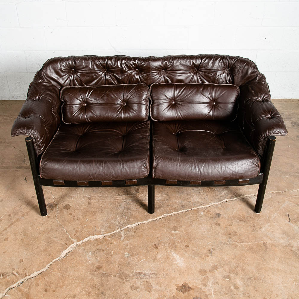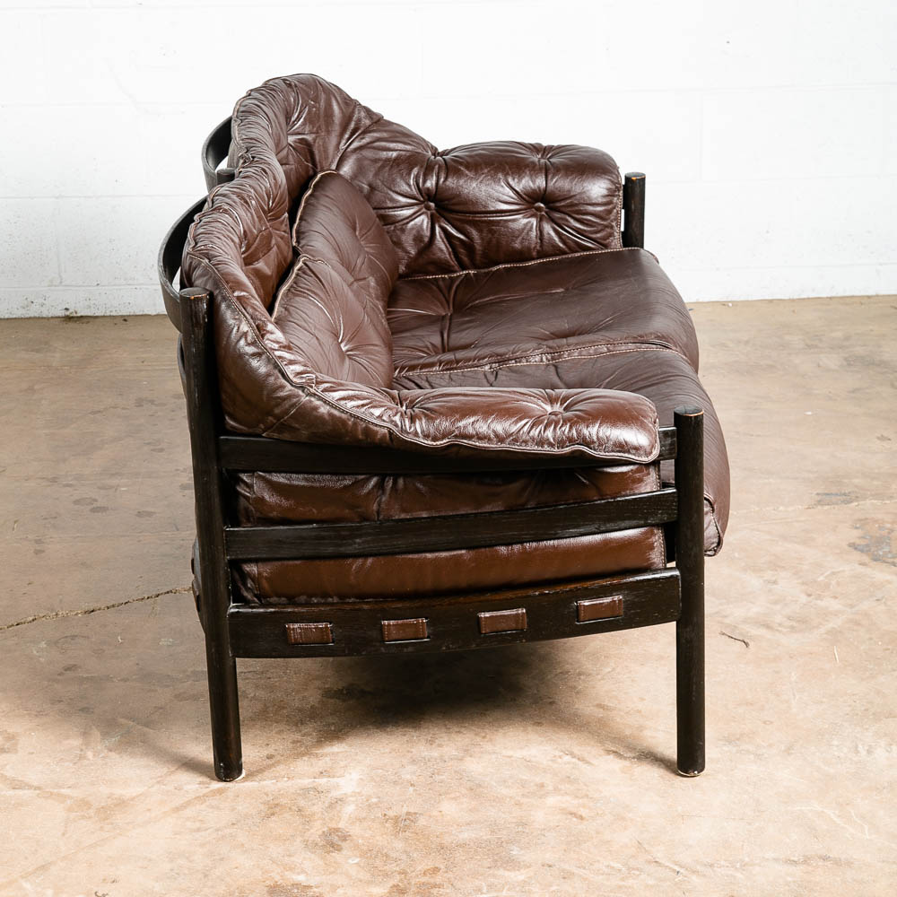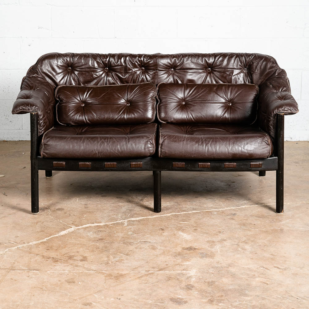 Rarely seen 2 seater Settee designed by Arne Norell, This sofa offers supple brown leather over solid ebonized oak wood frame. A great settee to relax in and exceptionally comfortable. Please see all photos to ensure you know what you are buying. We include FREE SHIPPING in the listing price. Some exceptions apply, so please read the full shipping details below. Note: We carry a matching Lounge chair set that we can offer together at a discount. please see our other listings if interested. We also carry a set in black leather.
