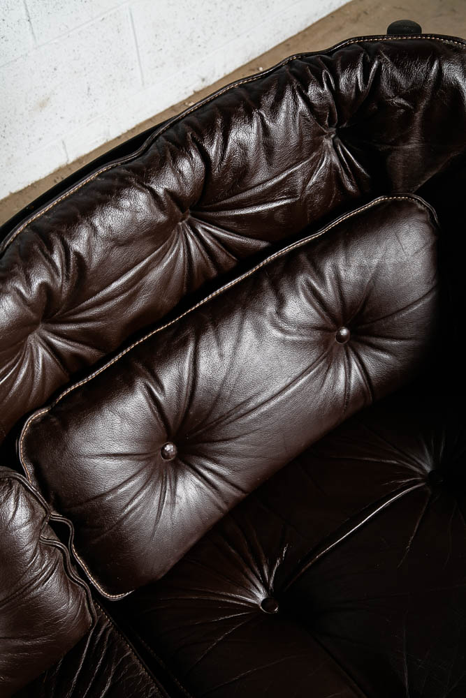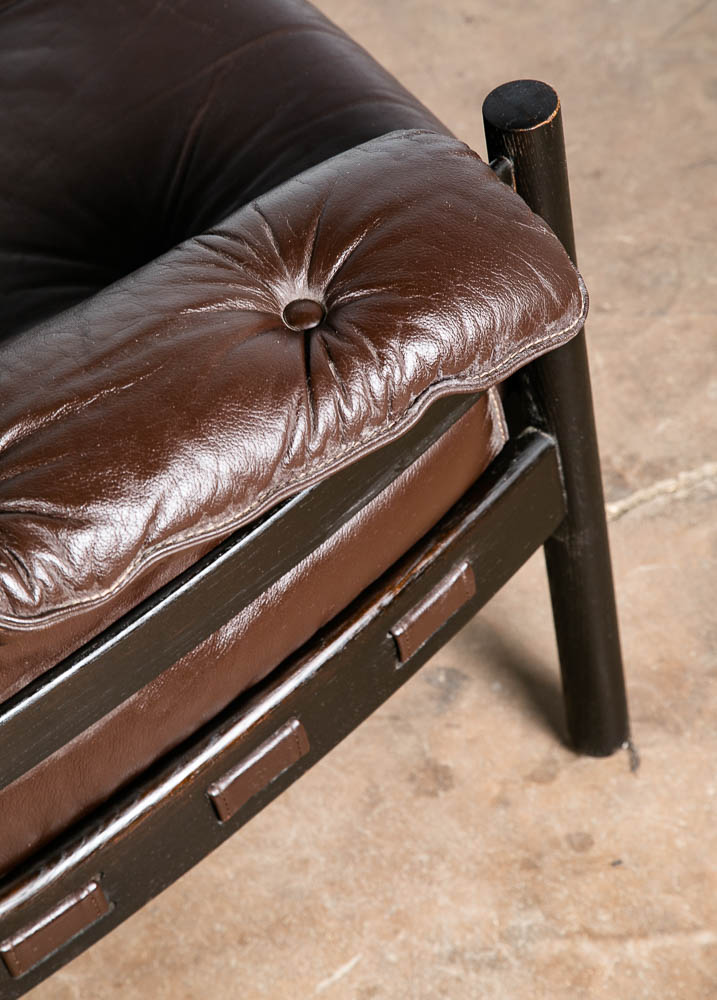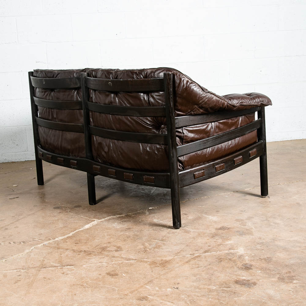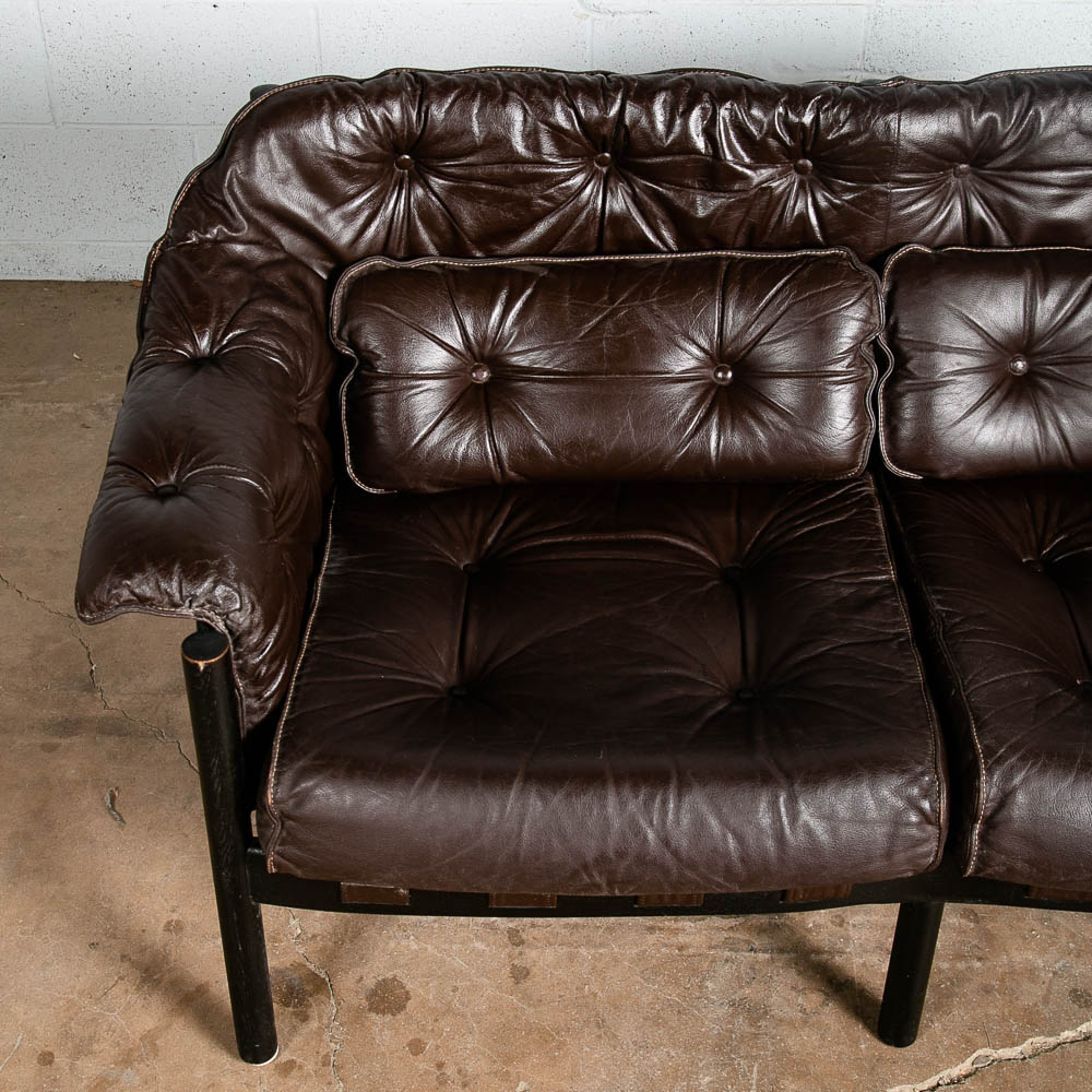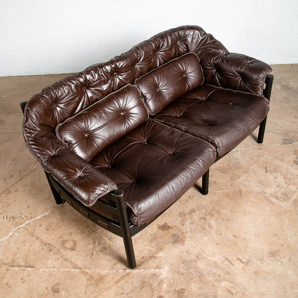 Rarely seen 2 seater Settee designed by Arne Norell, This sofa offers supple brown leather over solid ebonized oak wood frame. A great settee to relax in and exceptionally comfortable. Please see all photos to ensure you know what you are buying. We include FREE SHIPPING in the listing price. Some exceptions apply, so please read the full shipping details below. Note: We carry a matching Lounge chair set that we can offer together at a discount. please see our other listings if interested. We also carry a set in black leather.