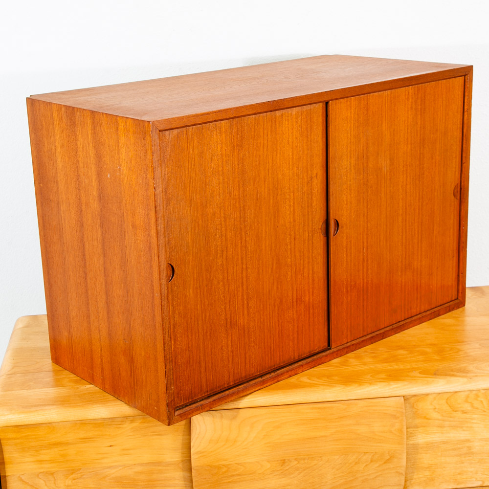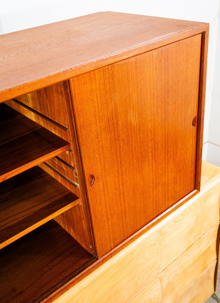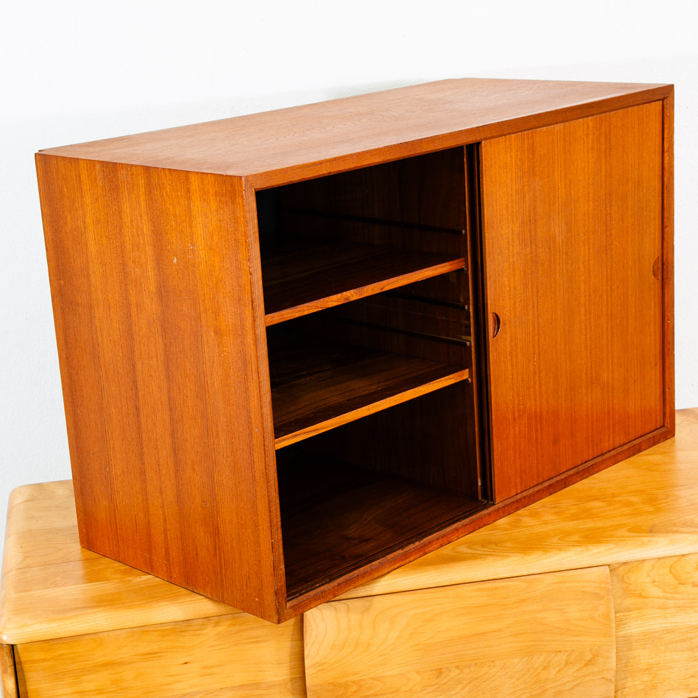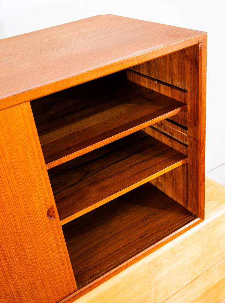 Danish modern teak Poul Cadovious "royal" wall unit section with adjustable shelving behind 2 sliding doors, made in Denmark. This is a single cabinet that can be added to your current system. Comes only with the cabinet and shelving. Please see all photos to ensure you know what you are buying. We include FREE SHIPPING in the listing price. Some exceptions apply, so please read the full shipping details below.