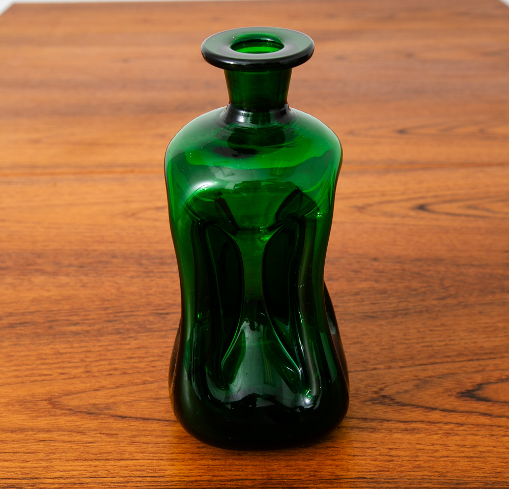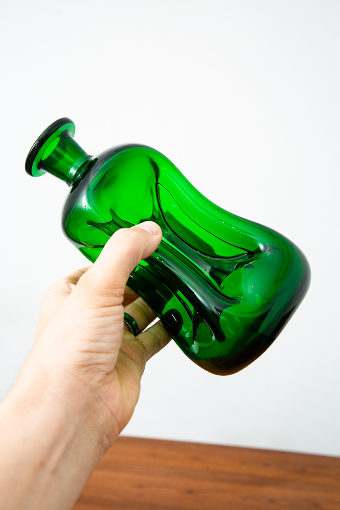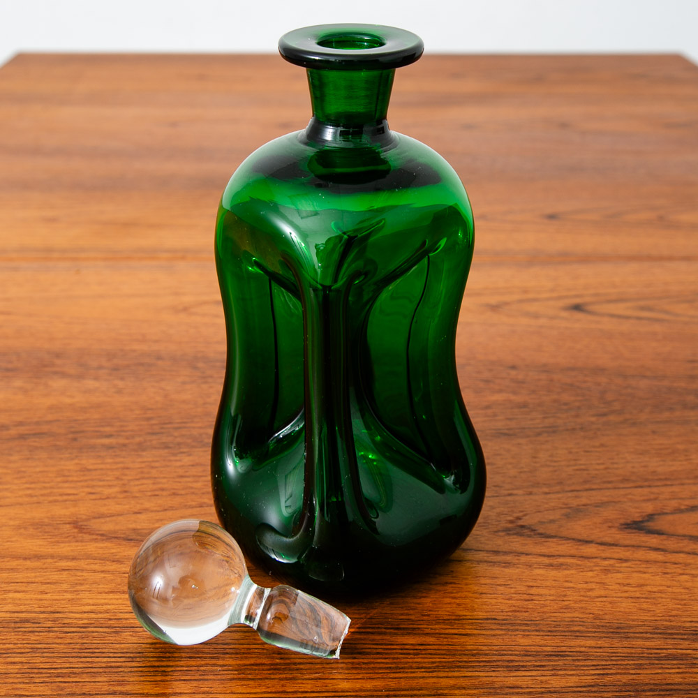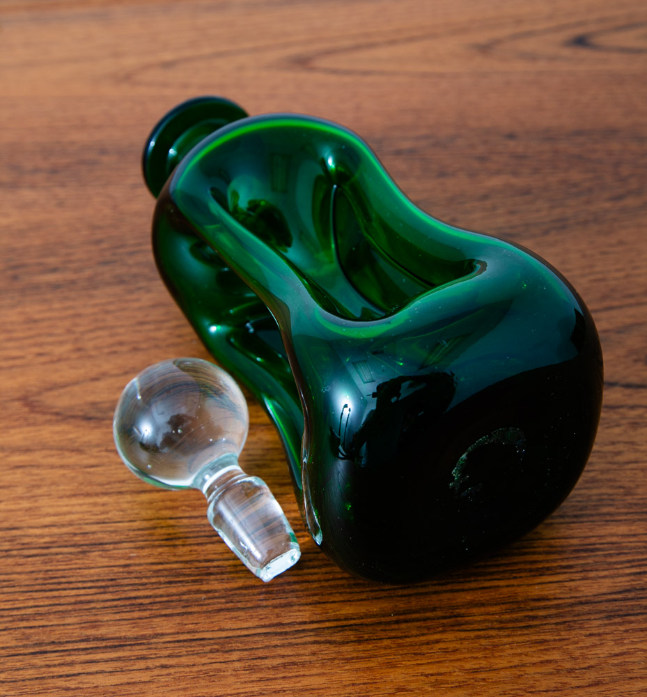 Ceramic Holmegaard Kluk Kluk decanter vase in green and clear studio glass. Handmade original studio item. Unsigned.