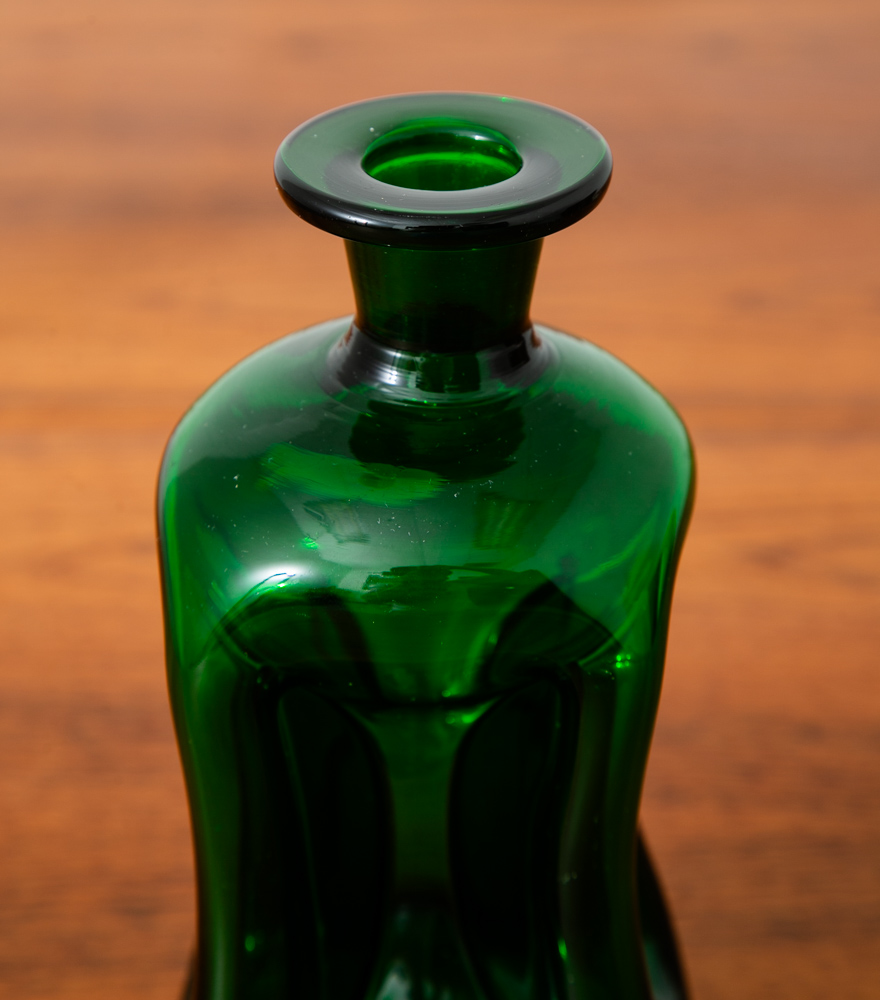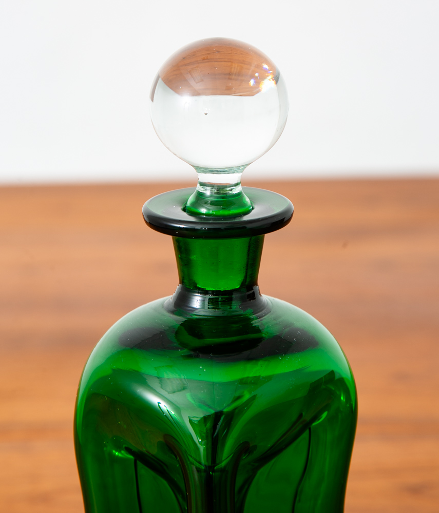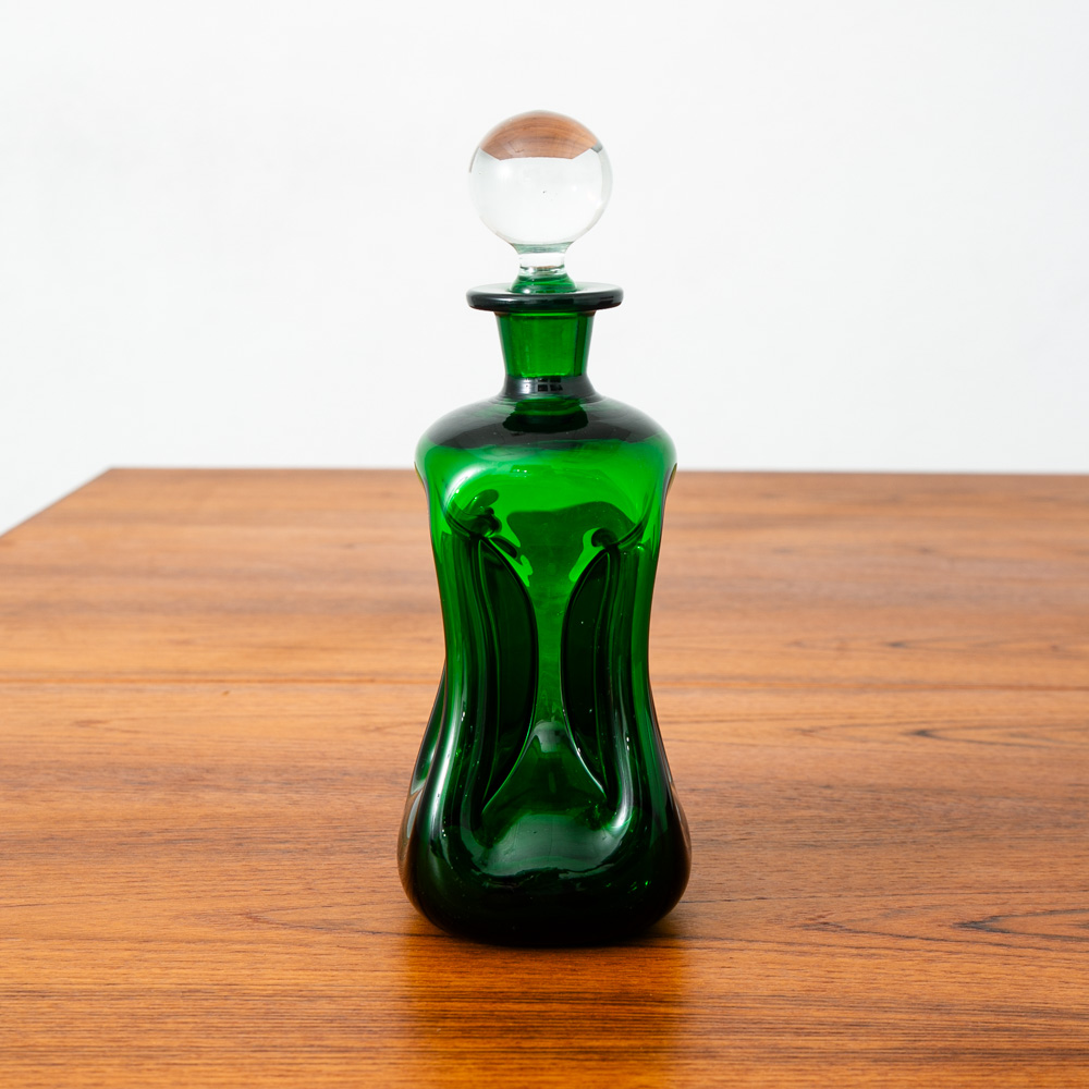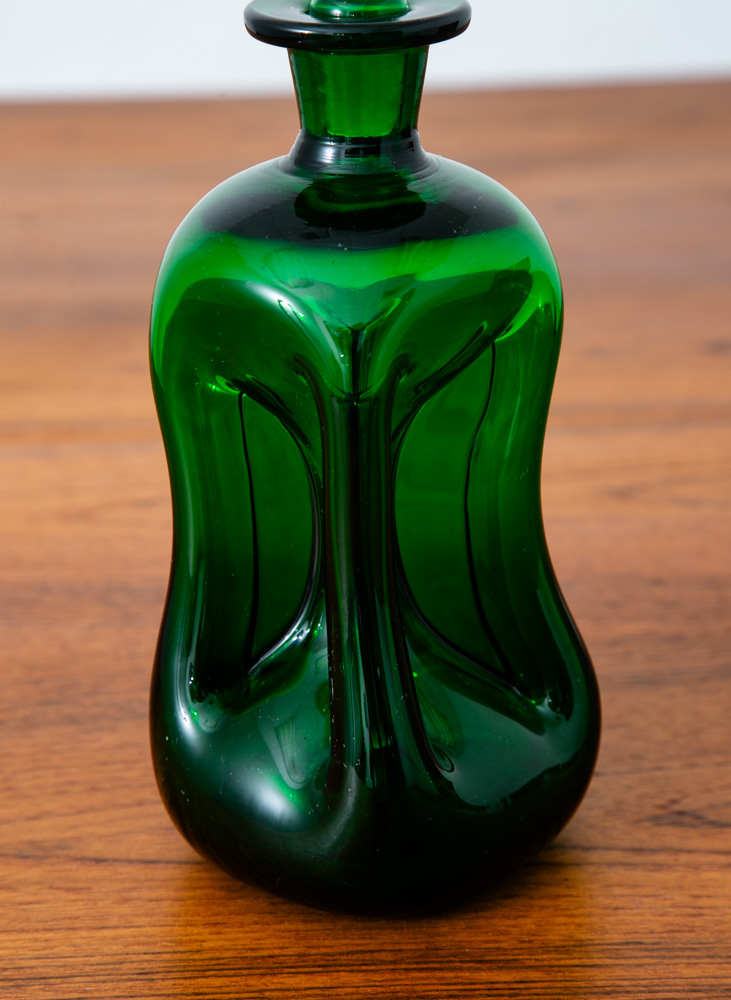 Ceramic Holmegaard Kluk Kluk decanter vase in green and clear studio glass. Handmade original studio item. Unsigned.
