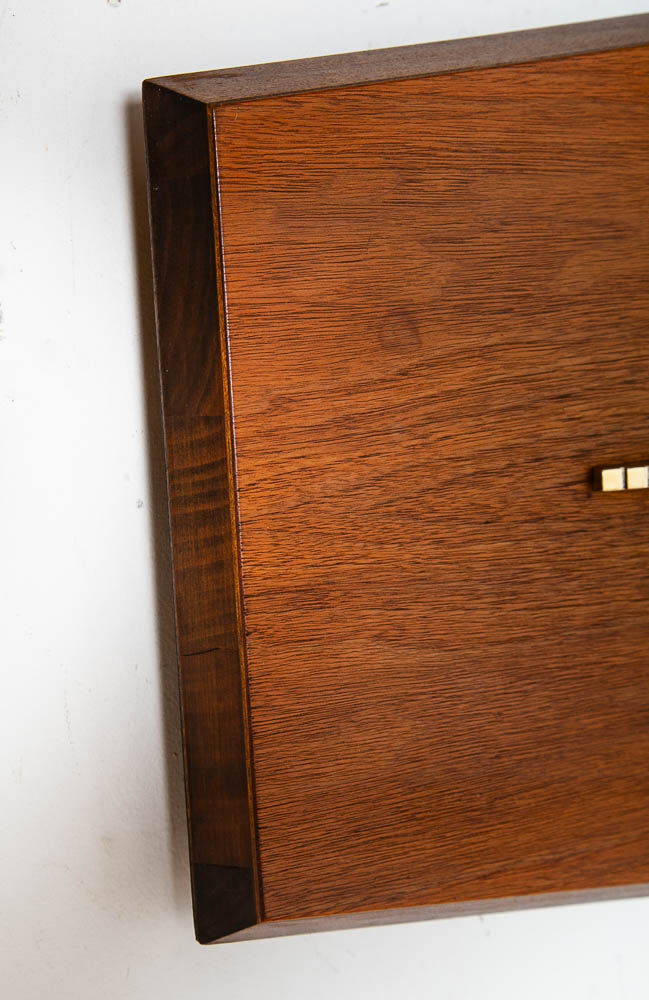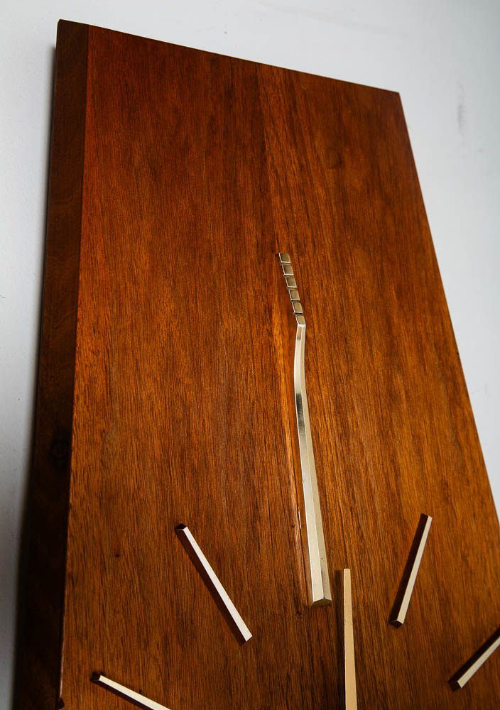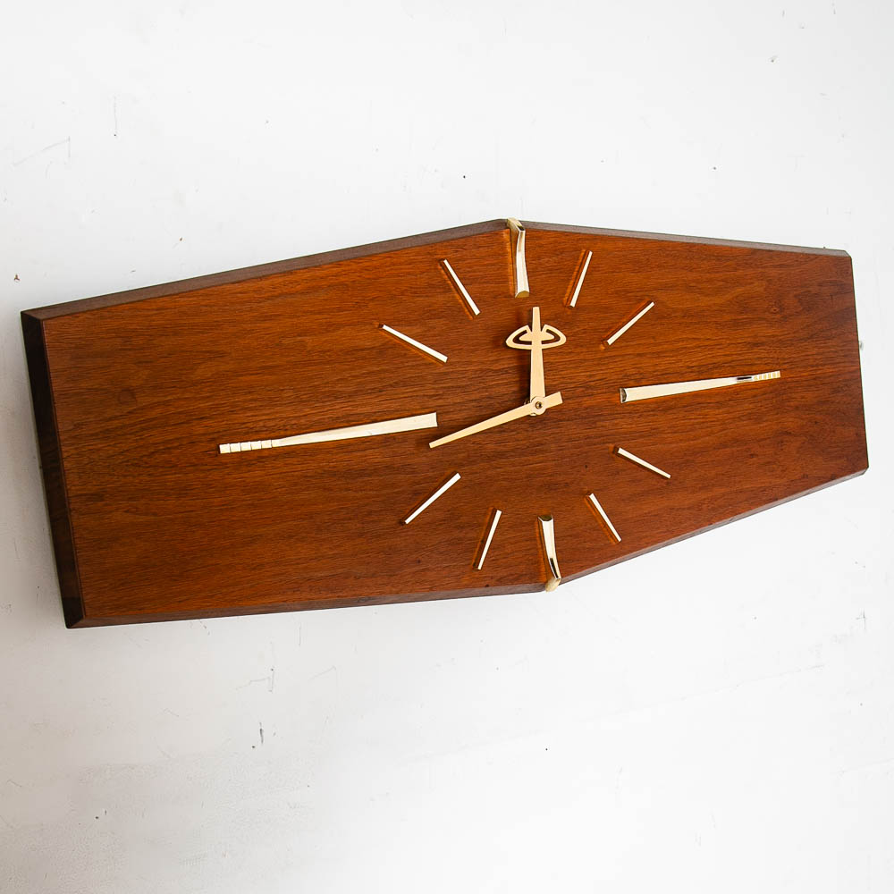 Beautiful walnut and brass wall clock. American made. This piece is battery powered and works well. Unique and well made piece ready for any home or space. Please see all photos to ensure you know what you are buying. We include FREE SHIPPING in the listing price. Some exceptions apply, so please read the full shipping details below.