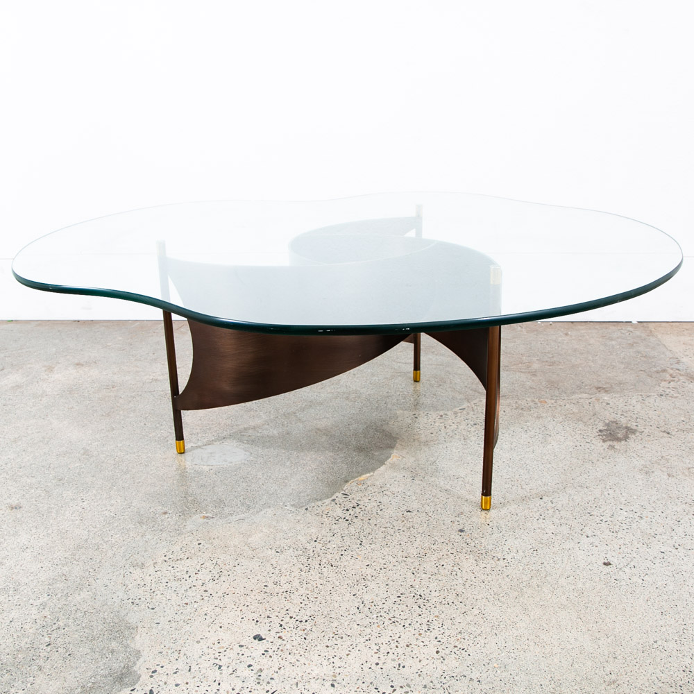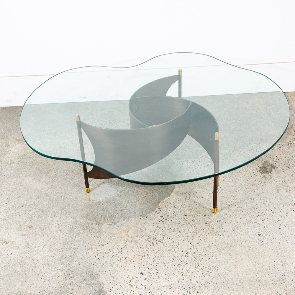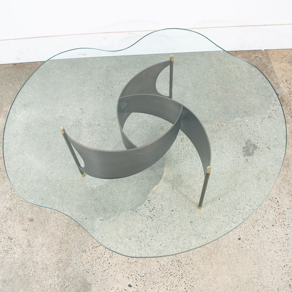 Very heavy metal and well made post modern coffee table with abstract shaped glass top. Unknown and unsigned American designer. made C late 70s. Please see all photos to ensure you know what you are buying. We include FREE SHIPPING in the listing price. Some exceptions apply, so please read the full shipping details below.