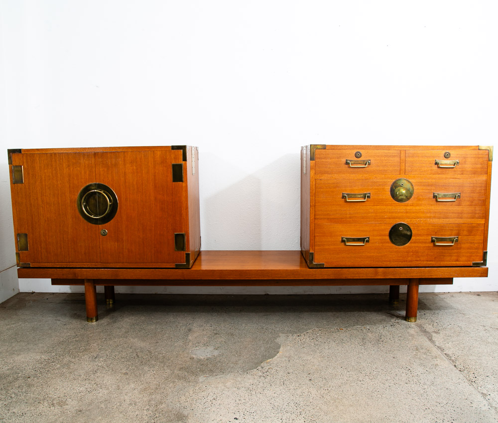 Renzo Rutili for Johnson Furniture Floating fully finished credenza / dresser Suite w/ built in bench. 100% modular set up where both top pieces can be put on any side you prefer. Each piece can be moved around and you can open up a portion to be used as a bench where needed. please see all photos to ensure you know what you are buying. We include FREE SHIPPING in the listing price. Some exceptions apply, so please read the full shipping details below.