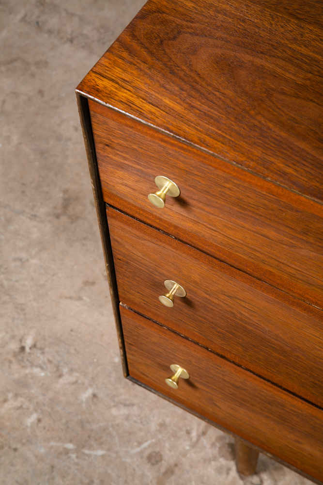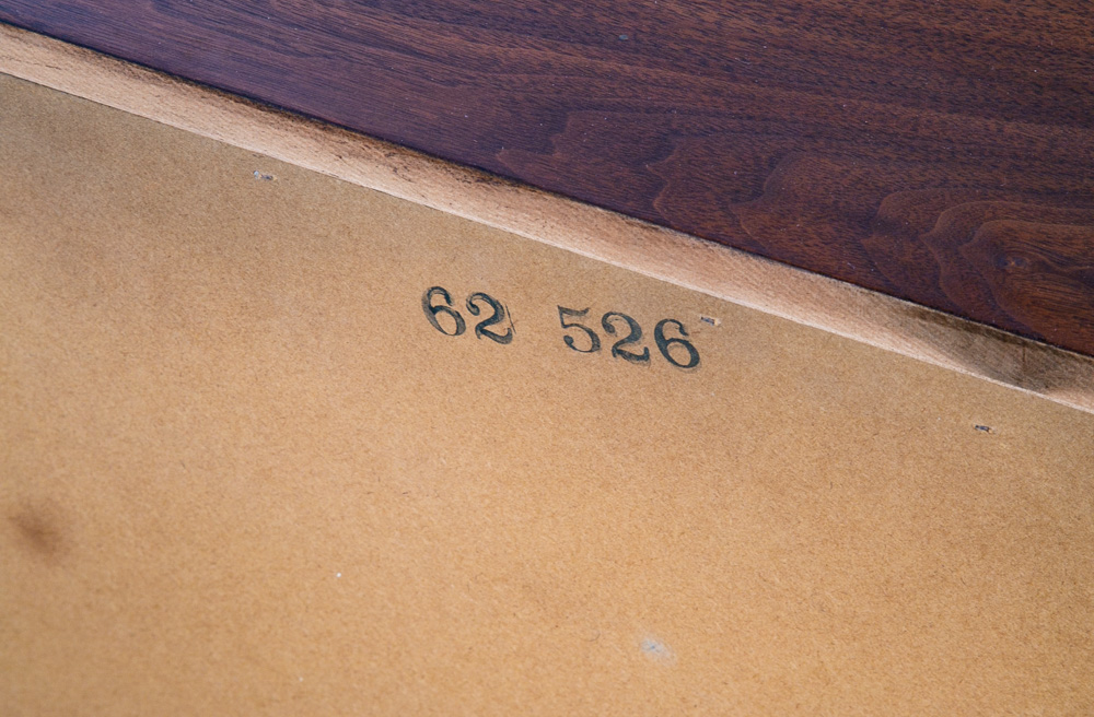 Condition report: Great condition overall after restoration. All drawers work as intended. All handles have been buffed out and are intact. 9/10 condition rating. Structurally solid. Stamped within the top left drawer.