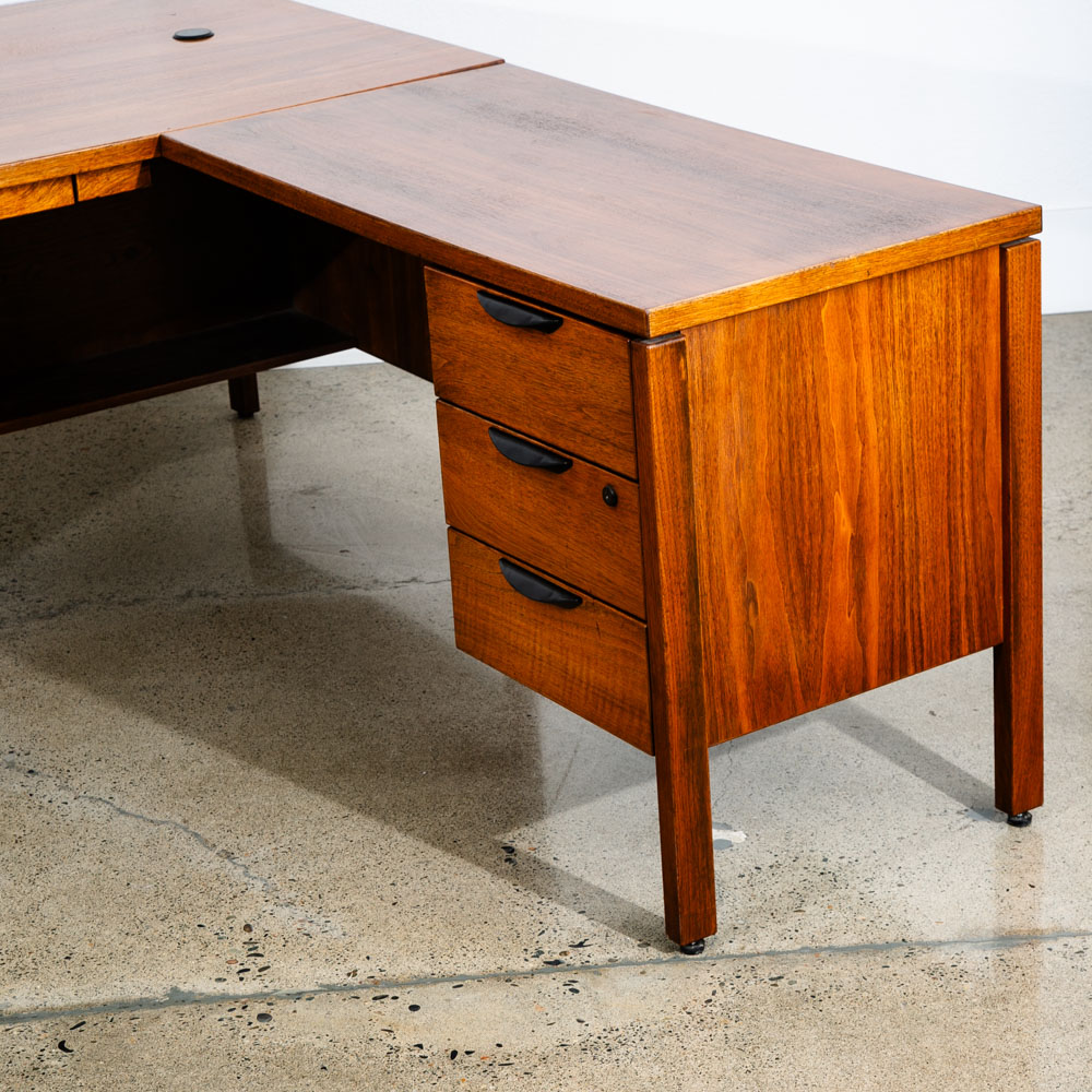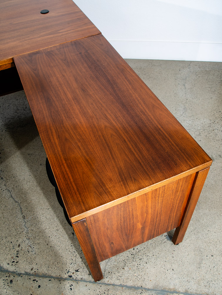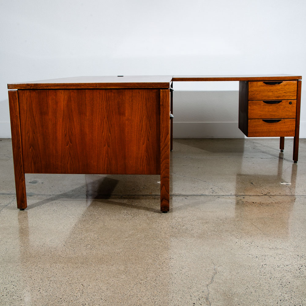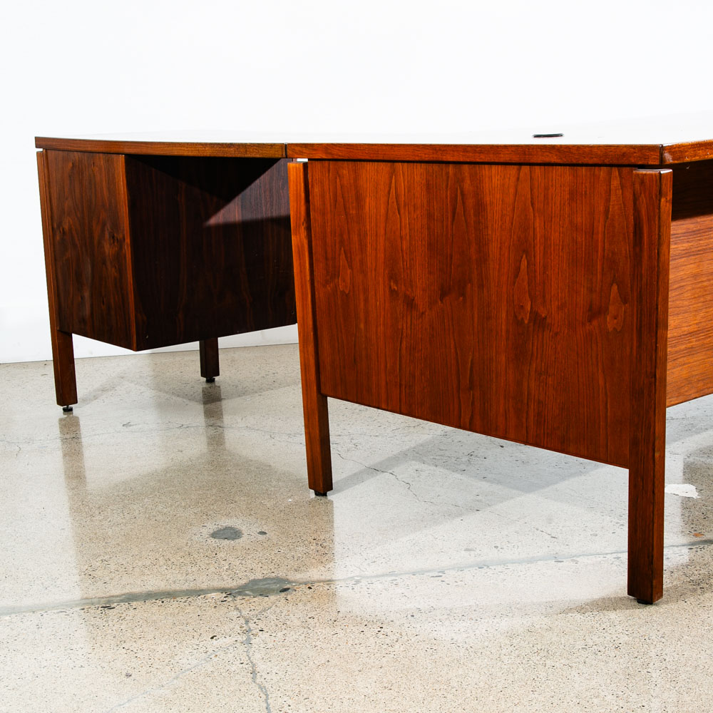 Large Mid-Century Modern executive desk in walnut and cognac leather by Jens Risom, circa 1960s. Desk includes an optional (removable) return with under shelf that mounts to right of the sitter. Within the return is a swing-out box compartment for additional storage. A truly iconic american designed piece in near mint condition. Please see all photos to ensure you know what you are buying. We include FREE SHIPPING in the listing price. Some exceptions apply, so please read the full shipping details below.